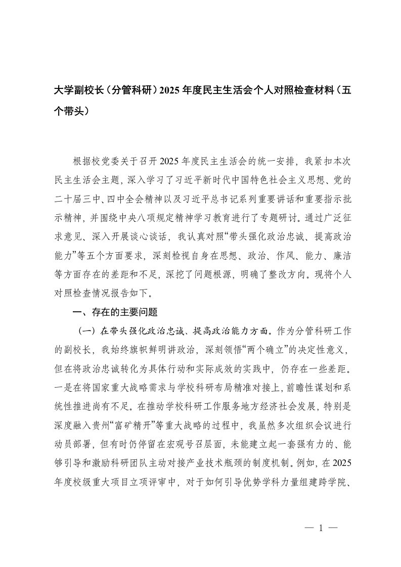 大学副校长分管科研2025年度民主生活会个人对照检查