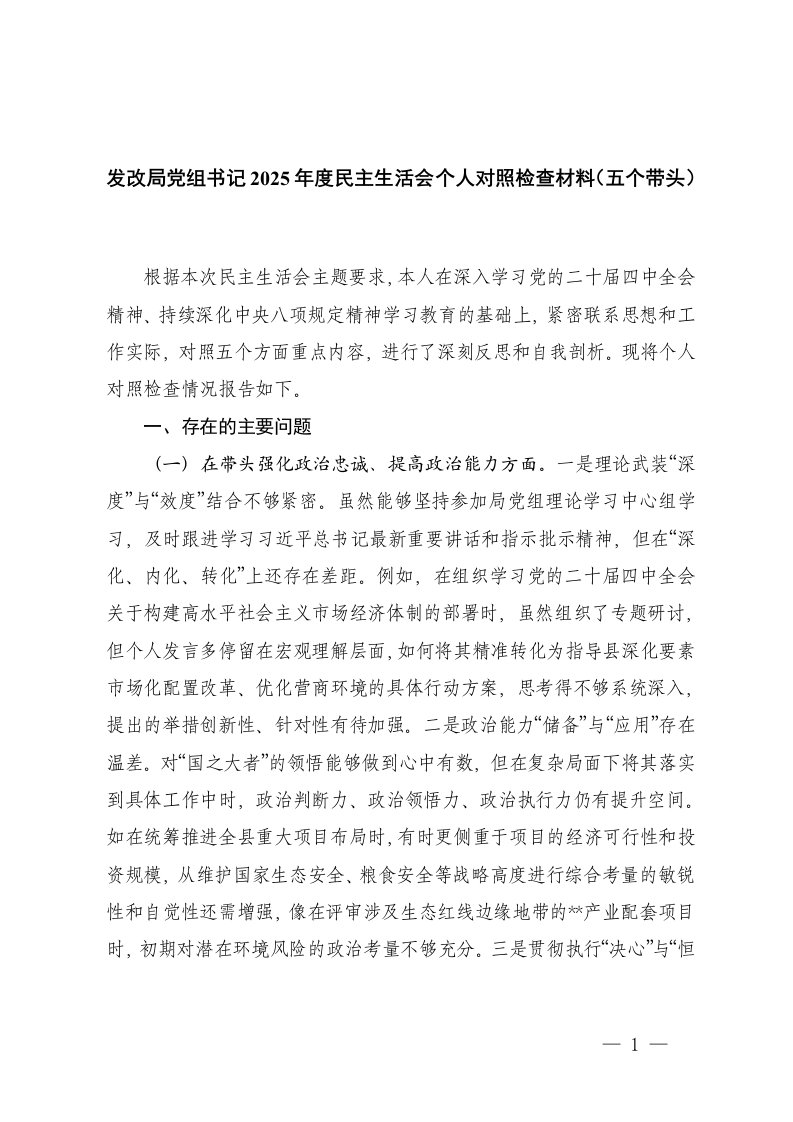 党员干部2025年度民主生活会个人五个带头对照检查