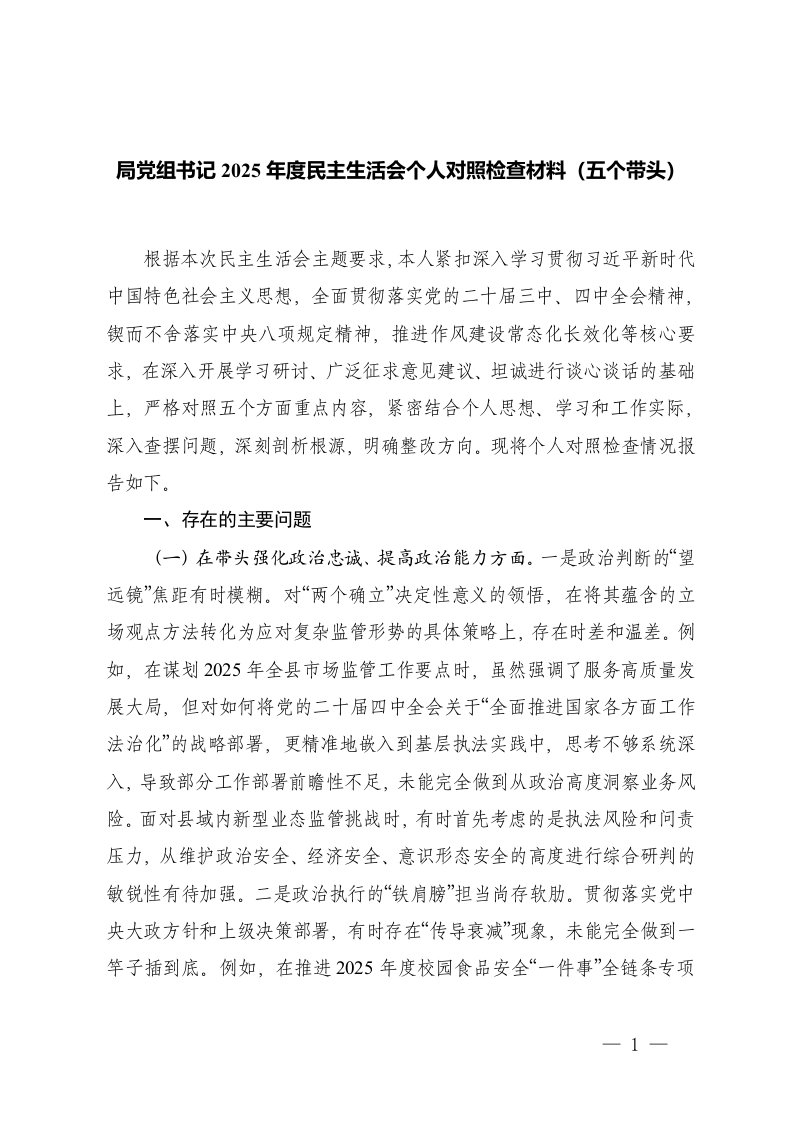 党组书记2025年度民主生活会个人对照检查