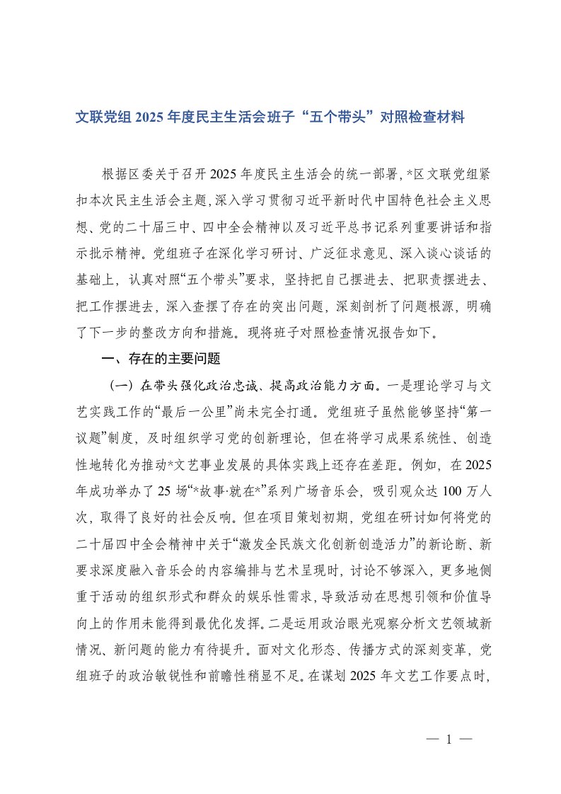 文联党组2025年度民主生活会班子五个带头对照检查