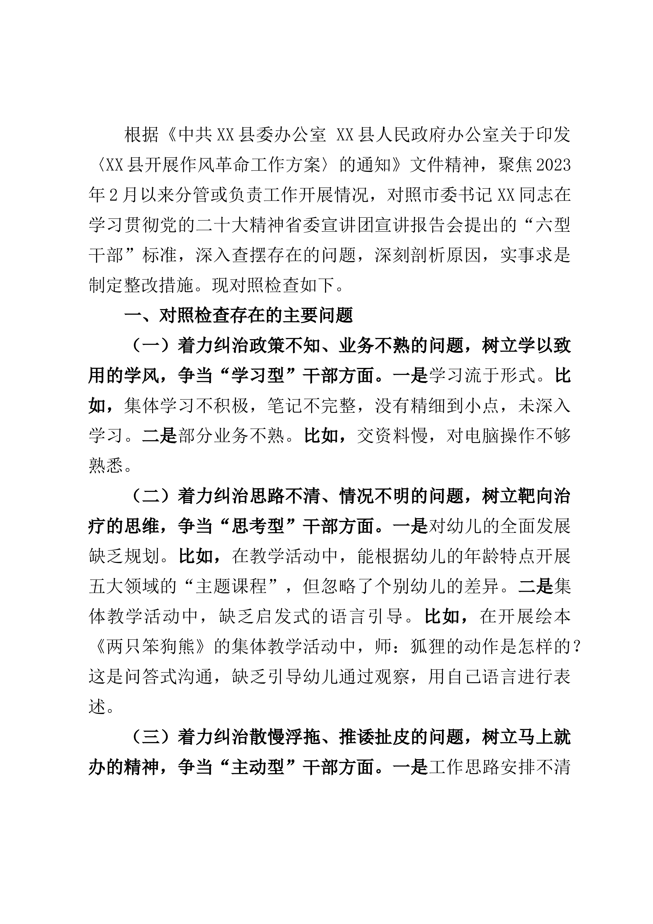 一、查摆出的问题及具体表现(一)围绕6个方面突出问题,特别是对照习近平总书记关于以学铸魂、以学增智、以学正风、以学促干的12条具体要求进行剖析。1.理论学习方面存在问题及具体表现:一是没有接受过系统的岗位培训,缺乏纪律审查等业务能力,导致执纪监督问责中存在“本领恐慌“。二是自我学习的能力还不足,精细化专业化水平有待提高,比较注重有关从严治党、党风廉政建设方面内容的学习,针对涉及案件办理等方面学得相对较少。三是结合自身工作实际,在学以致用、以用促学上方法还不够多,落实转化还不够好,还不能及时将所学转化并运用到日常的监督检查中,对问题线索敏感度不足,往往停留在就事论事的阶段,抽丝剥茧的挖掘能力有所...