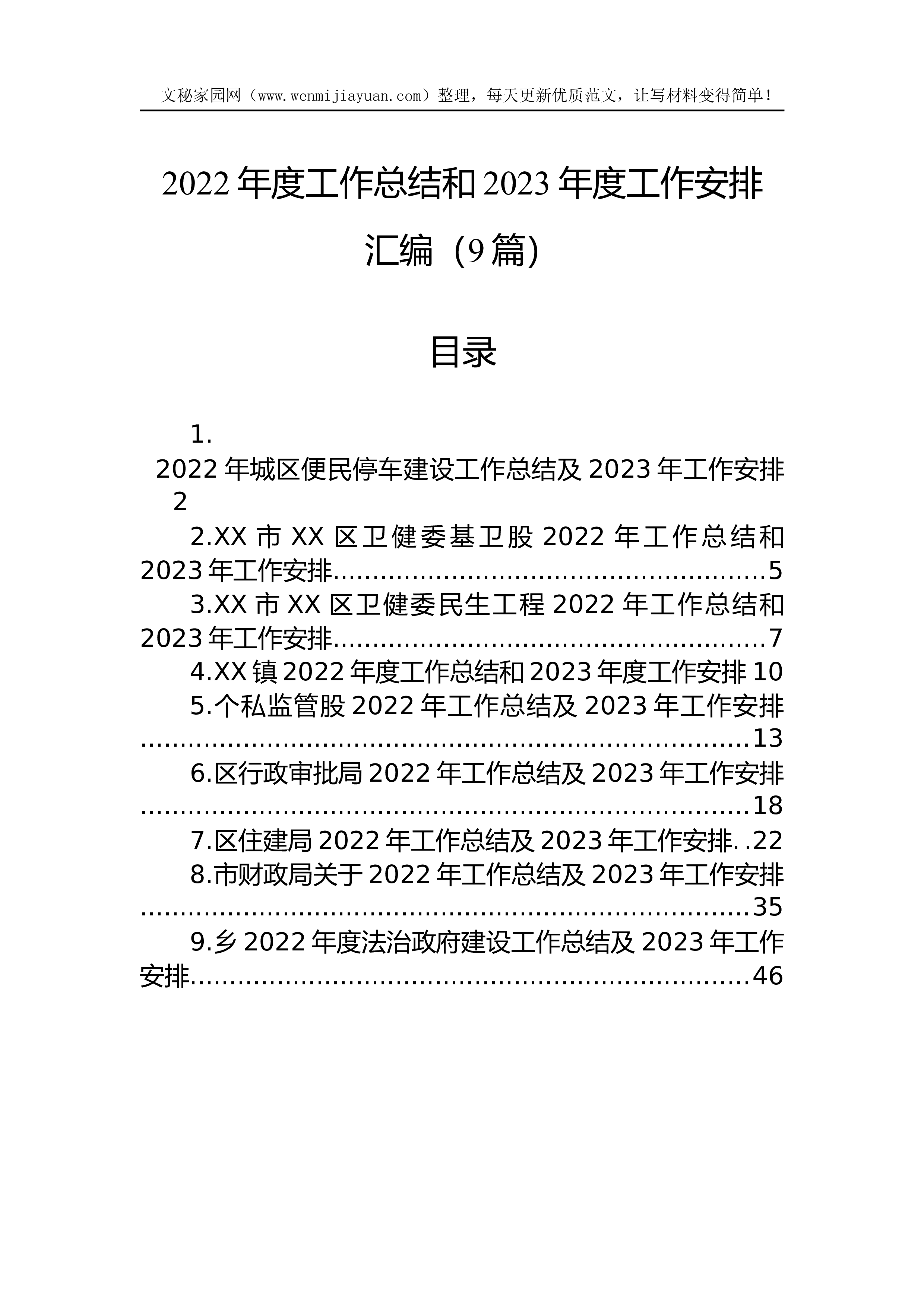 文秘家园网(www.wenmijiayuan.com)整理,每天更新优质范文,让写材料变得简单!2022年度工作总结和2023年度工作安排汇编(9篇)目录1.2022年城区便民停车建设工作总结及2023年工作安排22.XX市XX区卫健委基卫股2022年工作总结和2023年工作安排.......................................................53.XX市XX区卫健委民生工程2022年工作总结和2023年工作安排.......................................................74.XX镇2022年度工作总...