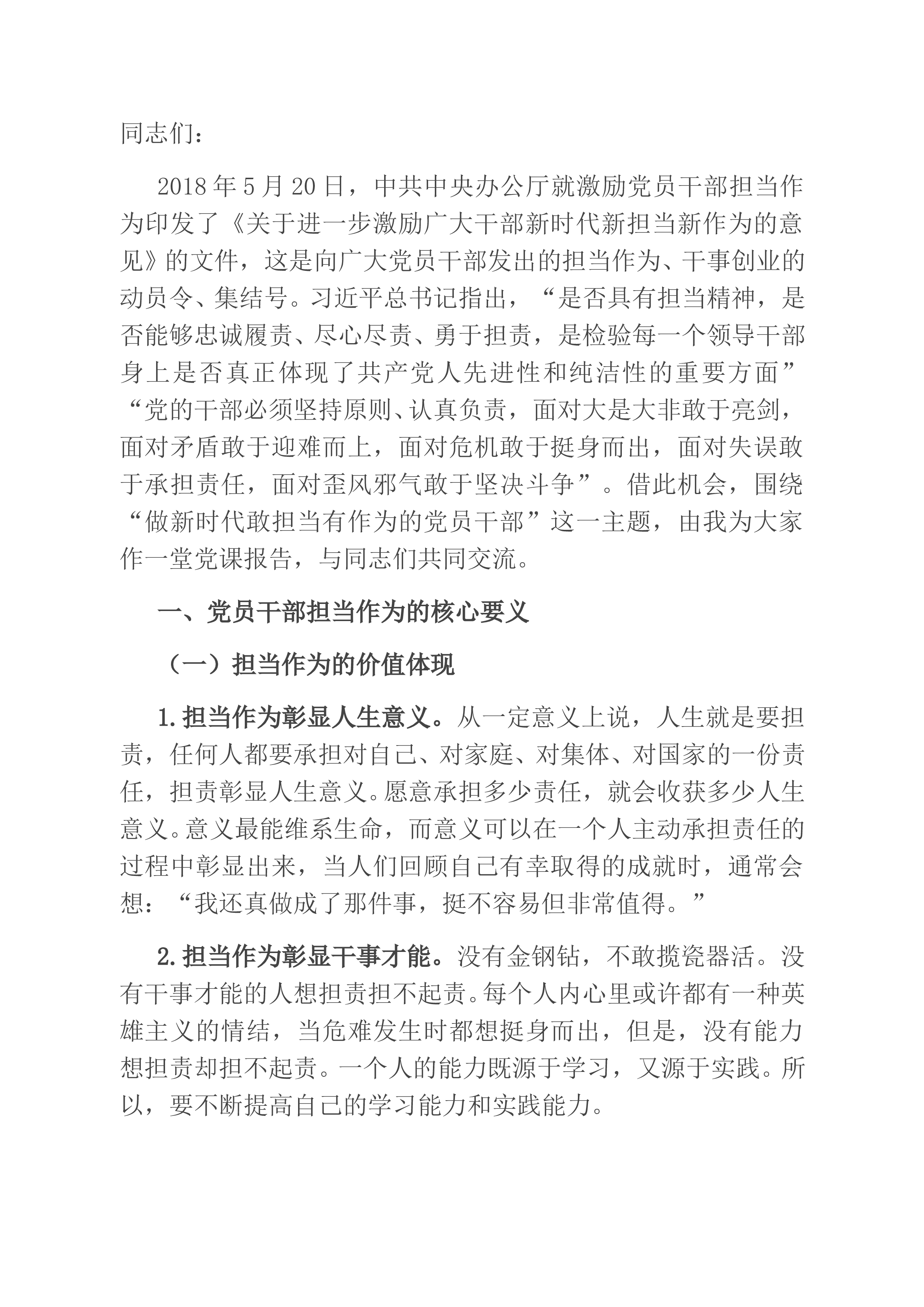 同志们:习近平总书记在2022年底召开的中共中央政治局会议上强调:“要坚持真抓实干,激发全社会干事创业活力,让干部敢为、地方敢闯、企业敢干、群众敢首创。”党员干部的敢为善为、地方基层的开拓创新、市场主体的锐意进取、人民群众的首创精神,是推动中国式现代化行稳致远的决定性因素。将干部敢为善为列在首位,充分体现了习近平总书记对干部敢于作为、善于作为的高度重视与殷切期待。**市委书记**强调:“迈上新征程,我们要继续以敢为、敢闯、敢干、敢首创的担当作为,阔步向前,开好局、起好步,不断汇聚起创新创业创造的磅礴力量。”全面学习与把握党的二十大重大决策部署,创造性落实市委、市政府工作要求,尤其需要以各级党员...
