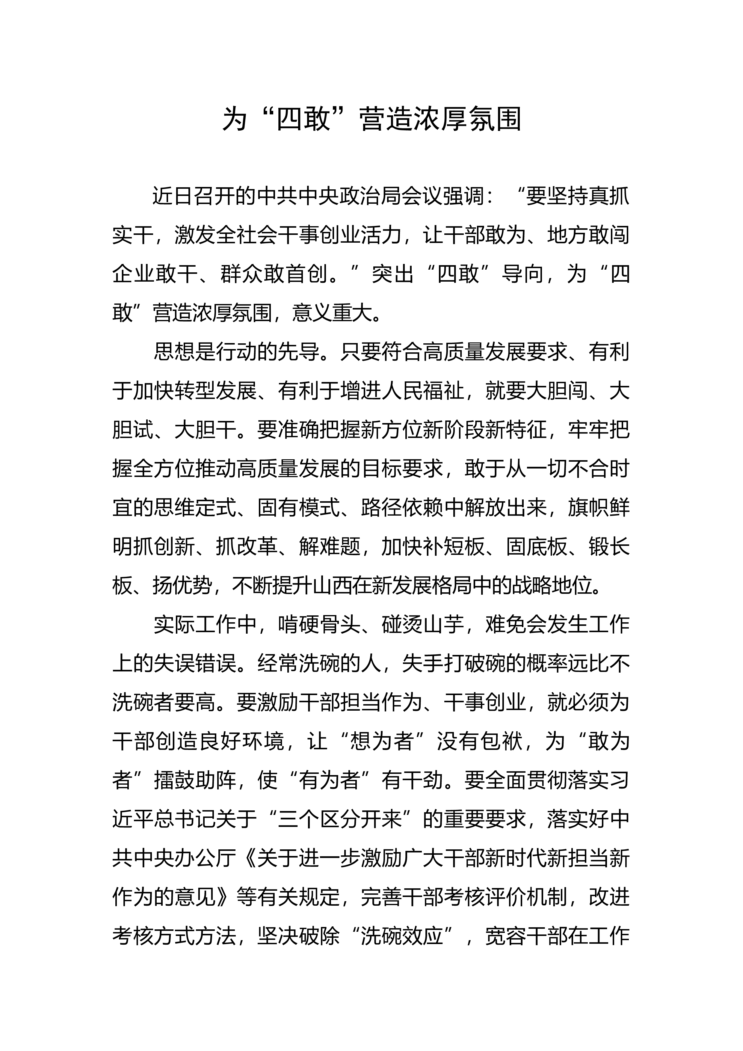 (一)凝心聚力促发展,真抓实干勇争先。2月13日、2月16日,全省、全市相继召开“抓学习促提升、抓执行促落实、抓效能促发展”行动动员部署会议,吹响了坚持不懈提能力、持之以恒转作风、全力以赴抓落实、一心一意谋发展的“冲锋号”。“三抓三促”行动开启了大抓落实、大干实事的新征程,我们必须增强责任心、事业心和紧迫感,发扬组工铁军精神,推动各项工作以最快速度启动、最高效率推进、最好效果呈现,争当模范部门,争创一流业绩。第一,牢固树立“抓落实”的鲜明导向。要进一步加强党员干部的培养、选拔和任用,激发党员干部干事创业的内生动能。一要从激励担当入手,让干部有奔头。探索建立全区科级干部政治素质档案,运用好平时考...