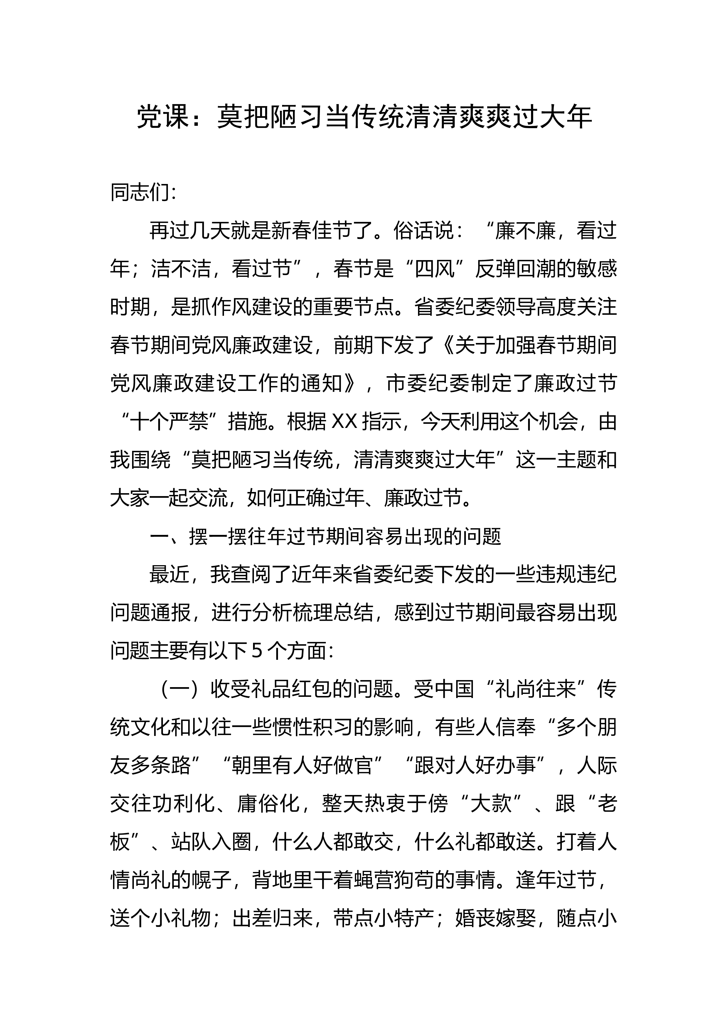 廉政党课讲稿:把好廉关,过好年关同志们:节日期间是腐败的高发期,也是干部作风的敏感期,更是考验各级领导干部廉洁从政能力的关键期。现在,党的二十大刚刚胜利闭幕,习近平总书记在二十大工作报告中对全面从严治党提出了新的要求,我们要认真领会,抓好落实。春节在即,根据上级党委政府和纪委的要求,根据形势和任务的需要,今天在这里开展“年关”讲“廉关”廉政党课活动,主要是给我们大家再提提醒,打打招呼,过一个清廉、欢乐、祥和的节日。一、中央惩治腐败决心坚定,必须杜绝侥幸心理十八大以来,中央高压反腐、铁腕治吏,坚持“老虎”“苍蝇”一起打,同时,部署开展了扫黑除恶专项斗争和政法队伍教育整顿活动,可见,中央对惩治贪污...