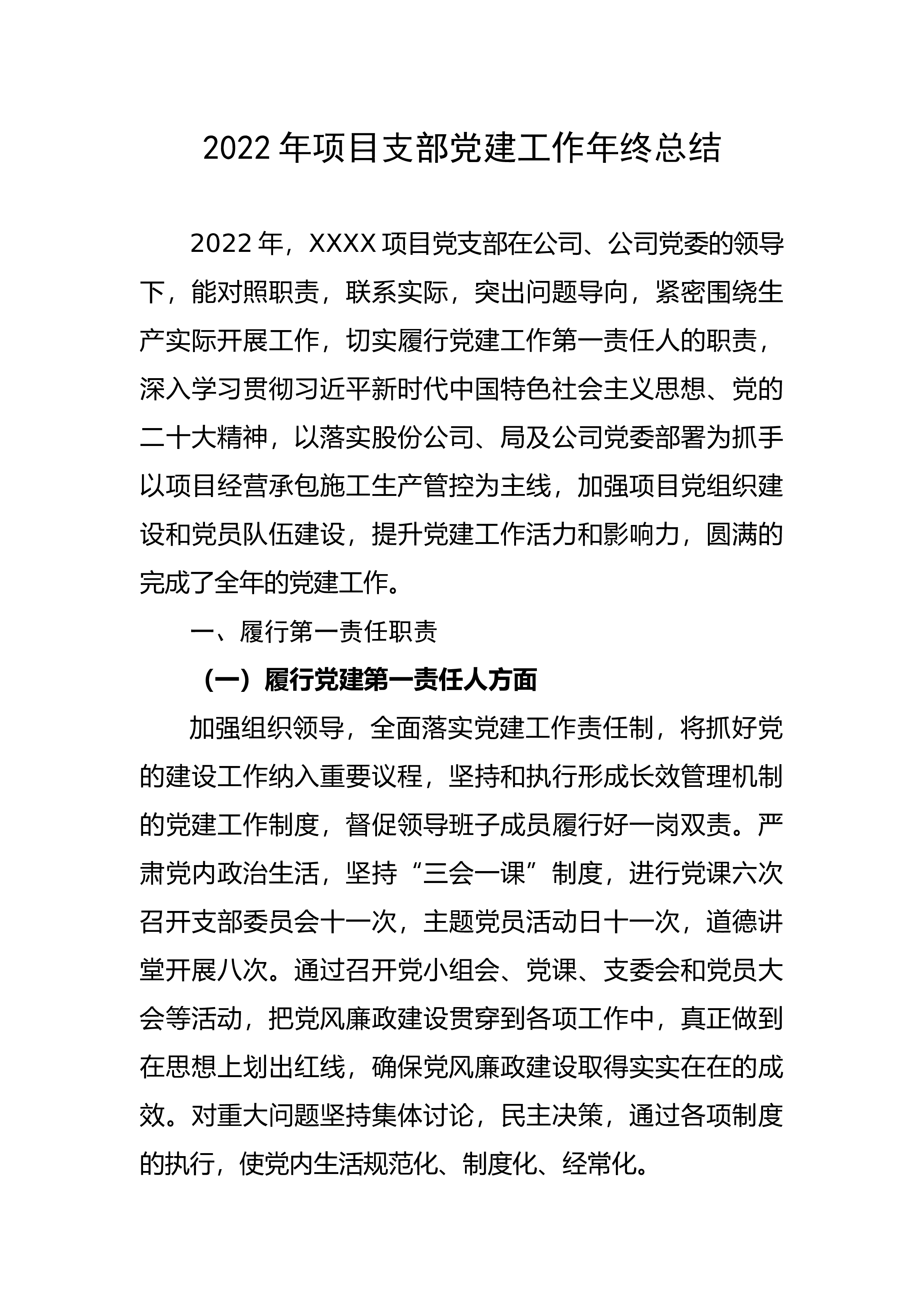 2022年项目支部党建工作年终总结2022年,XXXX项目党支部在公司、公司党委的领导下,能对照职责,联系实际,突出问题导向,紧密围绕生产实际开展工作,切实履行党建工作第一责任人的职责,深入学习贯彻习近平新时代中国特色社会主义思想、党的二十大精神,以落实股份公司、局及公司党委部署为抓手以项目经营承包施工生产管控为主线,加强项目党组织建设和党员队伍建设,提升党建工作活力和影响力,圆满的完成了全年的党建工作。一、履行第一责任职责(一)履行党建第一责任人方面加强组织领导,全面落实党建工作责任制,将抓好