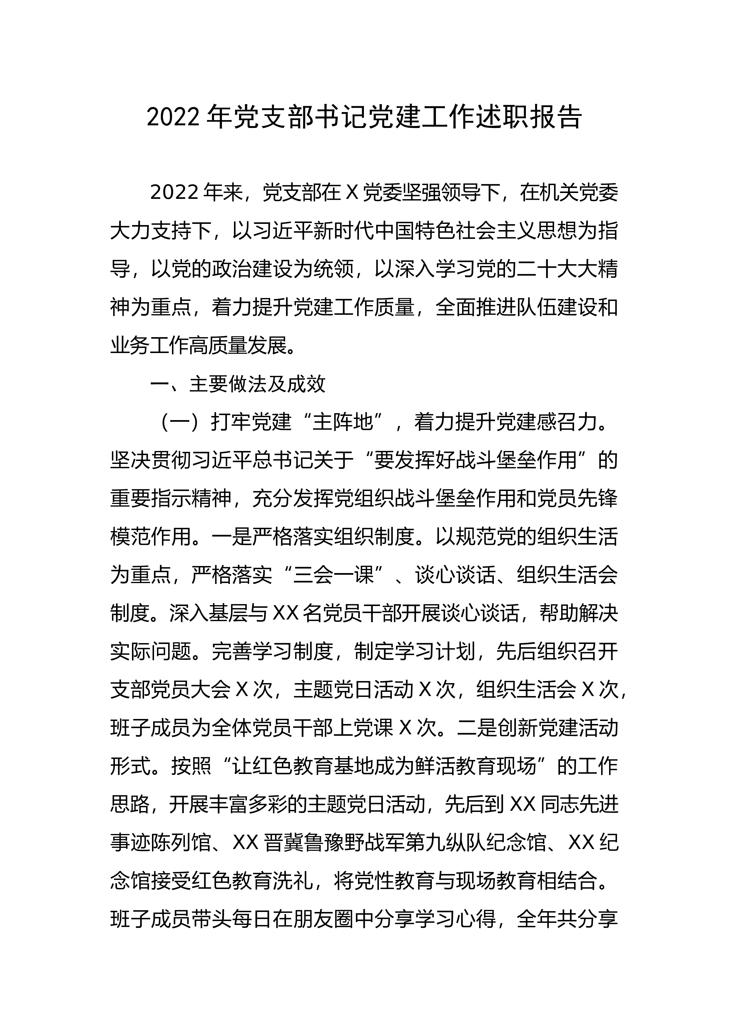 2022年度县委书记抓党建工作述职报告一、履职情况(一)强化头雁引领,落实主体责任。一是坚持以上率下。紧扣迎接和学习宣传贯彻党的二十大这一主题主线带头深入企业、乡村、项目等基层一线宣传宣讲党的二十大精神。认真抓好意识形态领域各项工作,充分发挥县委理论学习中心组,开展集中学习X场次,筑牢“关键少数”的思想根基。全面开展“喜迎二十大、奋进新征程”主题系列活动,推动党的创新理论、先进思想在我县落地生根见效。二是坚持率身垂范。主持召开县委常委会X余场次,研究部署百万村财提升工程、软弱涣散基层党组织整顿等基层党建重大事项X余个,牵头领办乡村振兴示范带建设和X个集体经济薄弱村投资基层党建项目X个,示范带动...