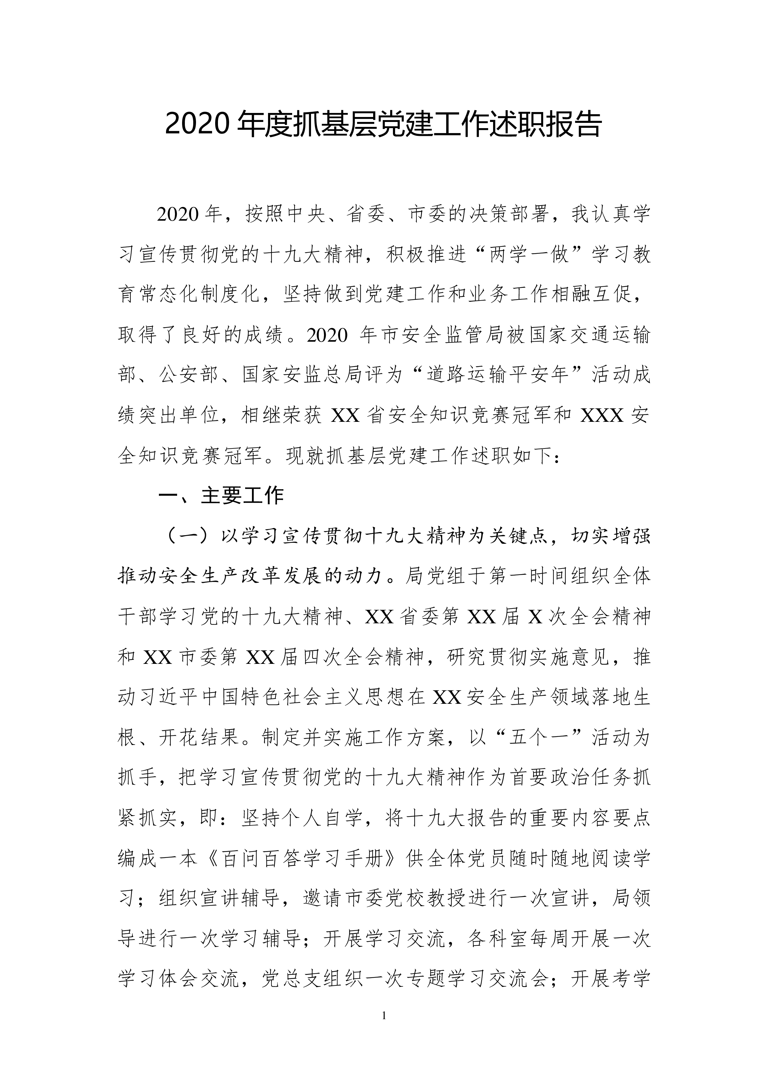 报告2020年,按照中央、省委、市委的决策部署,我认真学习宣传贯彻党的十九大精神,积极推进“两学一做”学习教育常态化制度化,坚持做到党建工作和业务工作相融互促,取得了良好的成绩。2020年市安全监管局被国家交通运输部、公安部、国家安监总局评为“道路运输平安年”活动成绩突出单位,相继荣获XX省安全知识竞赛冠军和XXX安全知识竞赛冠军。现就抓基层