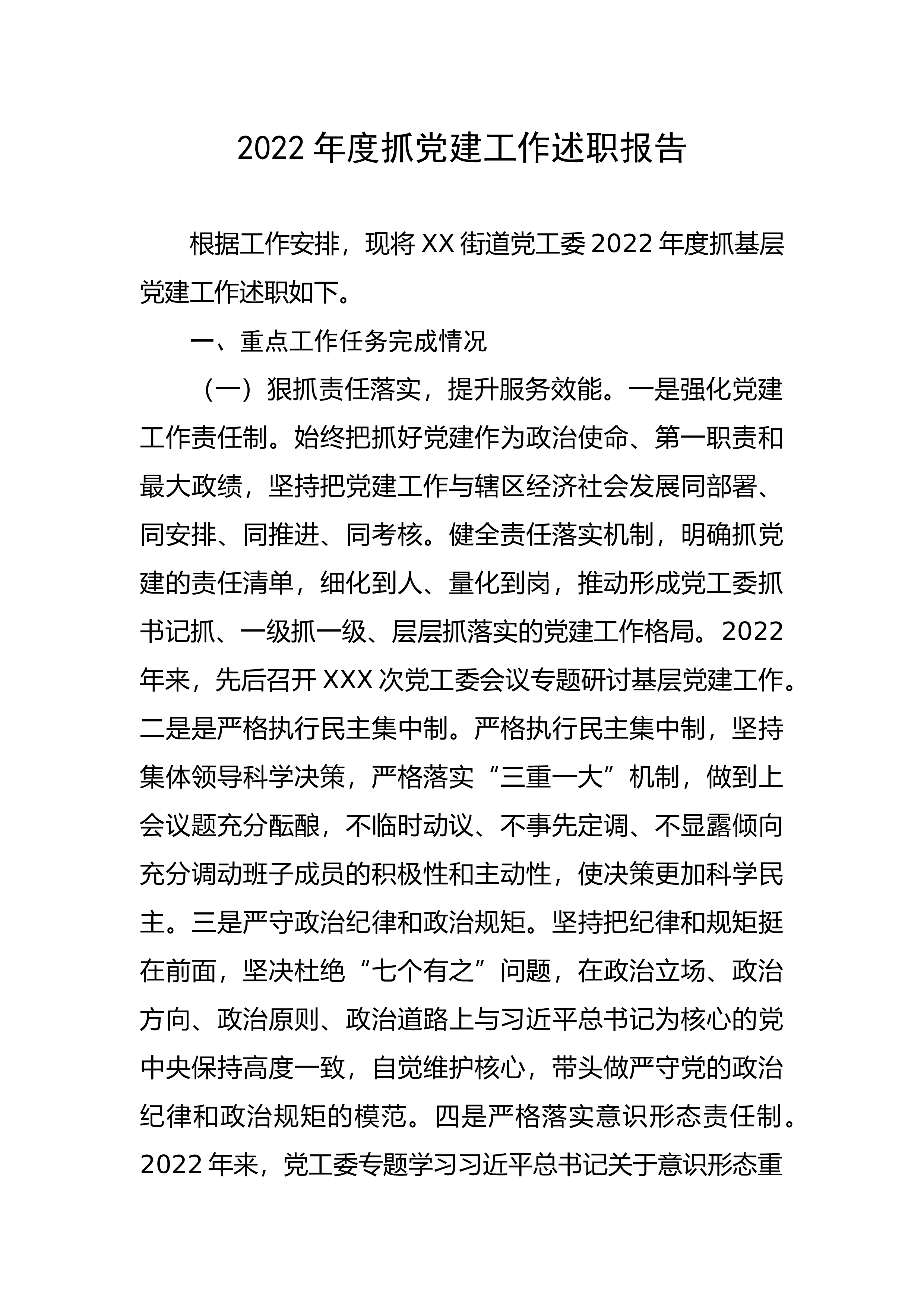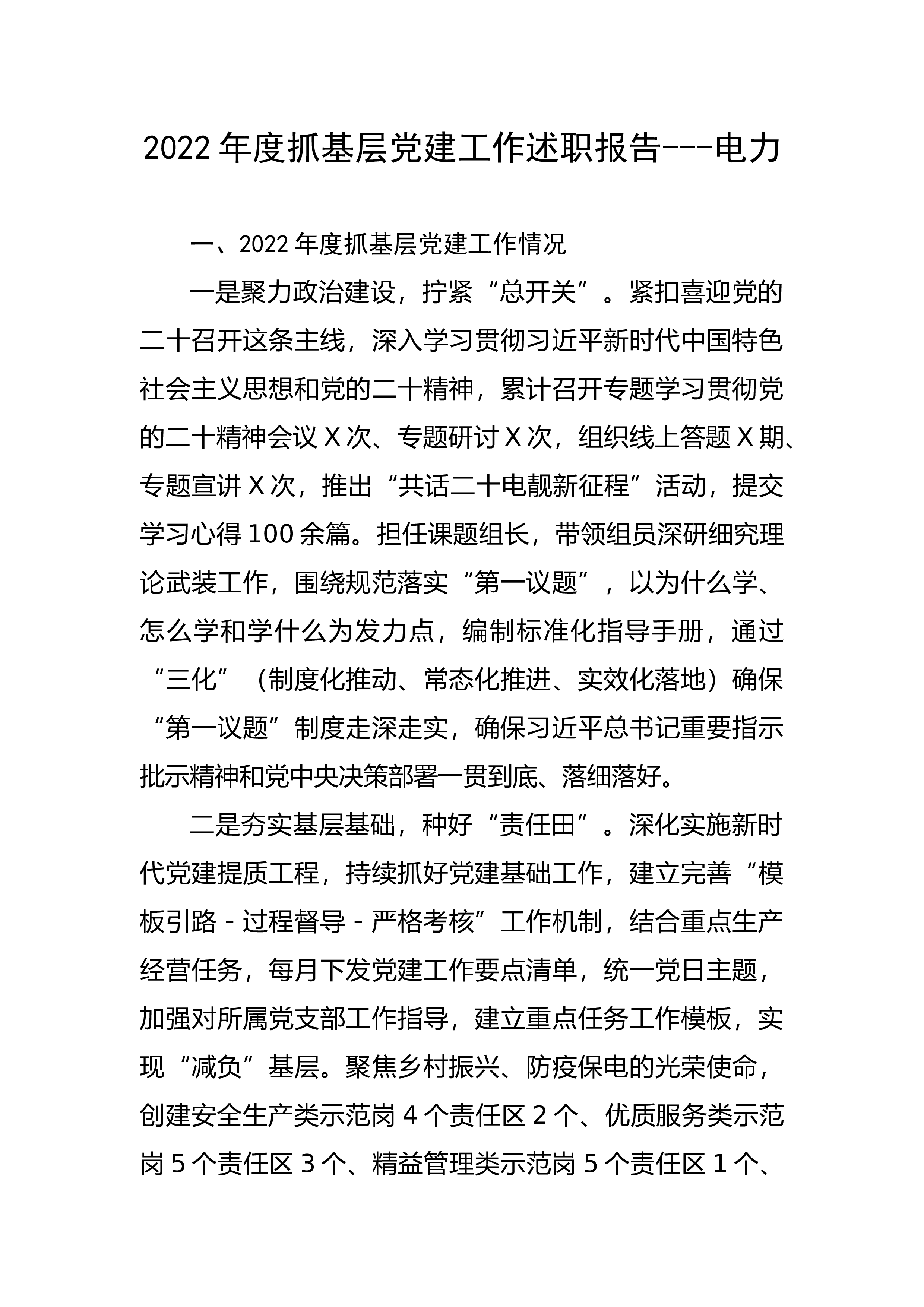 2022年度县应急管理局抓党建述职报告按照安排,我就2022年度抓基层党建工作述职如下。一、主要做法及成效(一)筑牢政治建设“压舱石”,着力破解党建业务“两张皮”。今年以来,县应急管理局坚定以习近平新时代中国特色社会主义思想为指导,坚决贯彻落实习近平总书记来川视察关于防灾减灾救灾的重要论述,认真学习贯彻党的XX大精神,坚定不移落实中央、省委、州委和县委的重大决策部署,围绕“强党建、保安全、促发展”的工作目标,坚持以政治建设为统领,严格履行党建工作“第一责任人”职责,以党建引领应急管理各项工作,以新安全格局保障新发展格局,把党的建设贯穿党员干部思想政治建设的始终,加强和规范党内政治生活,坚持自学...