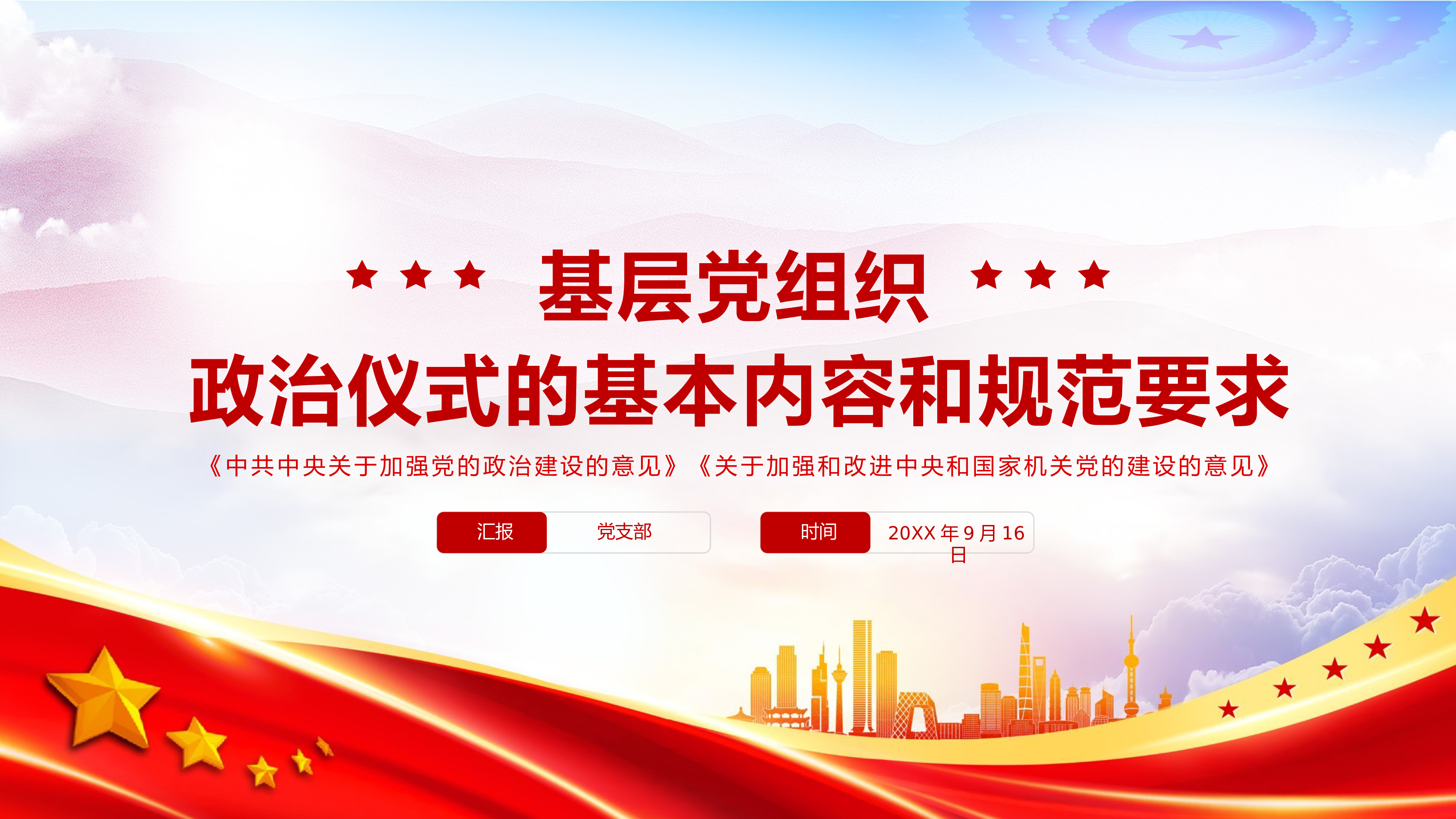 政治仪式的基本内容和规范要求汇报党支部时间20XX年9月16日基层党组织《中共中央关于加强党的政治建设的意见》《关于加强和改进中央和国家机关党的建设的意见》前言导读根据《中国共产党章程》《中共中央关于加强党的政治建设的意见》《关于加强和改进中央和国家机关党的建设的意见》等党内法规和文件精神,结合中央和国家机关工委印发的《关于规范中央和国家机关基层党组织有关政治仪式的意见》,现将基层党组织举行政治仪式的基本内容和规范要求整理如下,供大家参考。举行党组织成立仪式1举行党组织转隶交接仪式2举行入党宣誓仪式3举行重温入党誓词仪式4举行党内表彰仪式5举行“光荣在党50年”纪念章颁发仪式6积极探索完善重温...