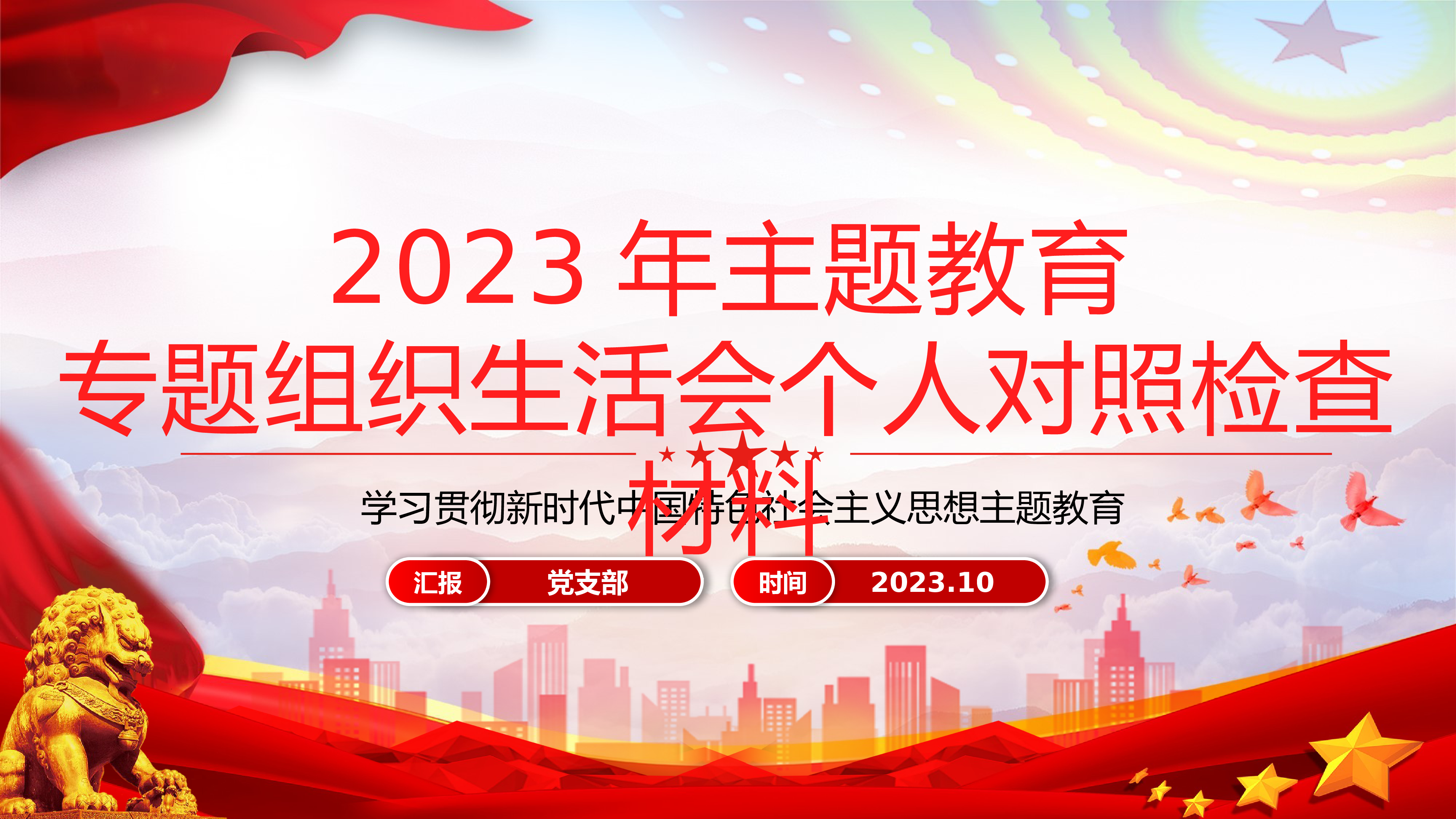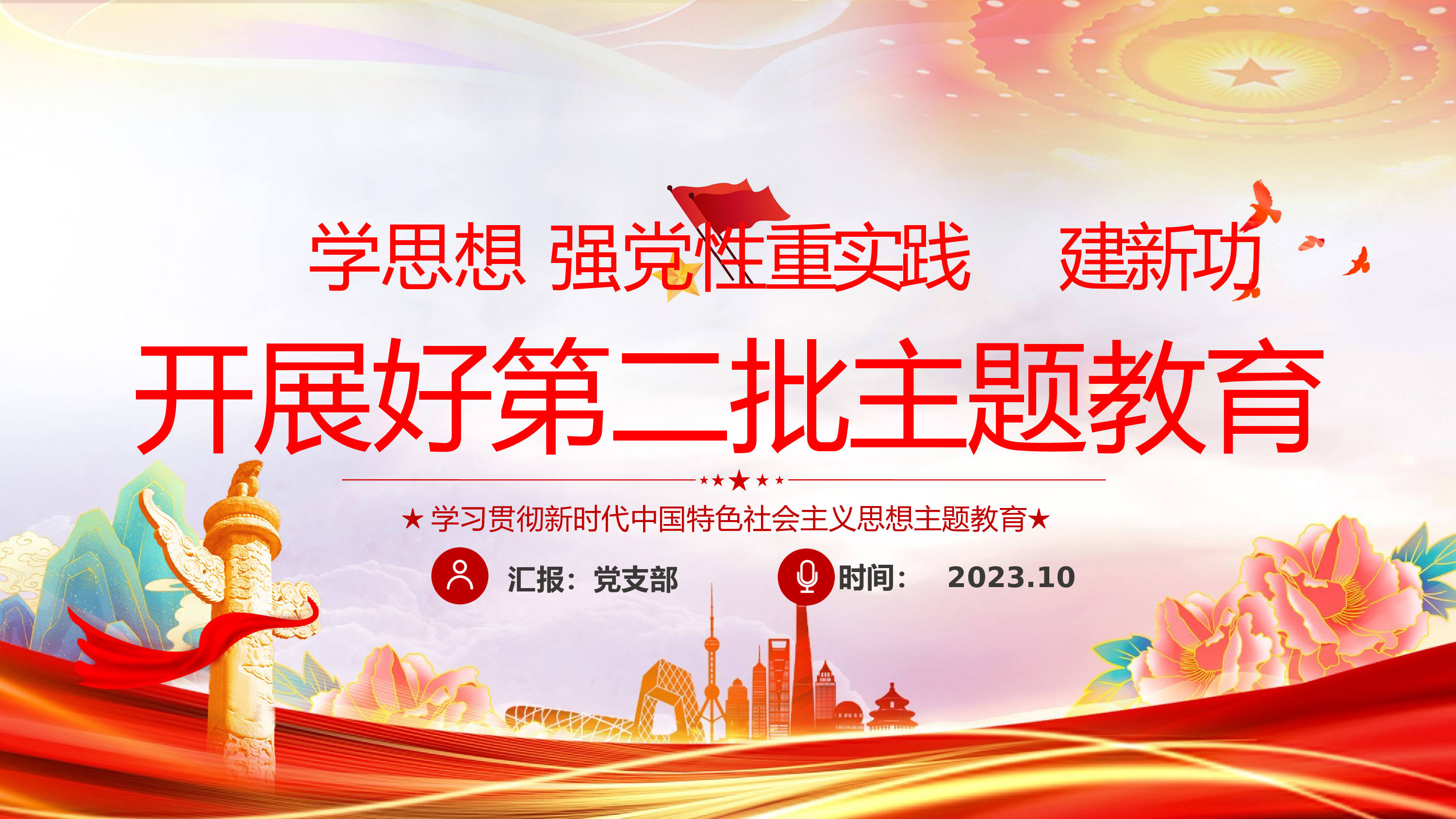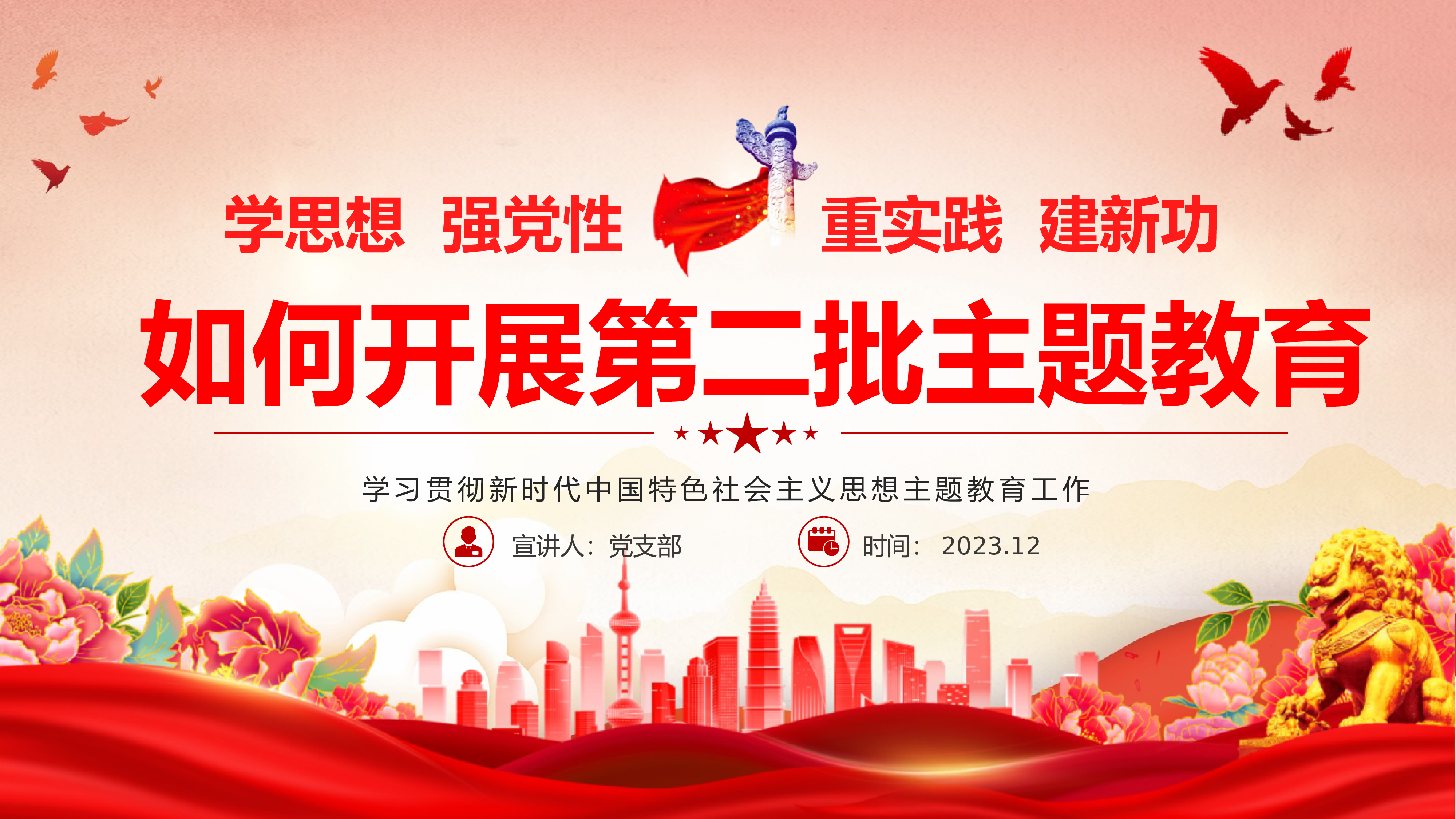 以学铸魂以学增智以学正风以学促干深入开展学习习近平新时代中国特色社会主义思想党课教育宣讲人:党支部时间:2023.09前言在全党深入开展学习贯彻习近平新时代中国特色社会主义思想党课教育,是始终保持党的强大凝聚力战斗力、不断开创事业发展新局面、以党的自我革命引领社会革命的必然要求。习近平总书记在学习贯彻习近平新时代中国特色社会主义思想党课教育工作会议上发表的重要讲话,高屋建瓴、视野宏阔、思想深邃、内涵丰富,深刻阐述了开展党课教育的重大意义和目标要求,为开展好党课教育提供了根本遵循。我们要深入学习贯彻习近平总书记重要讲话精神,扎实开展好党课教育,着力在以学铸魂、以学增智、以学正风、以学促干上下功夫...