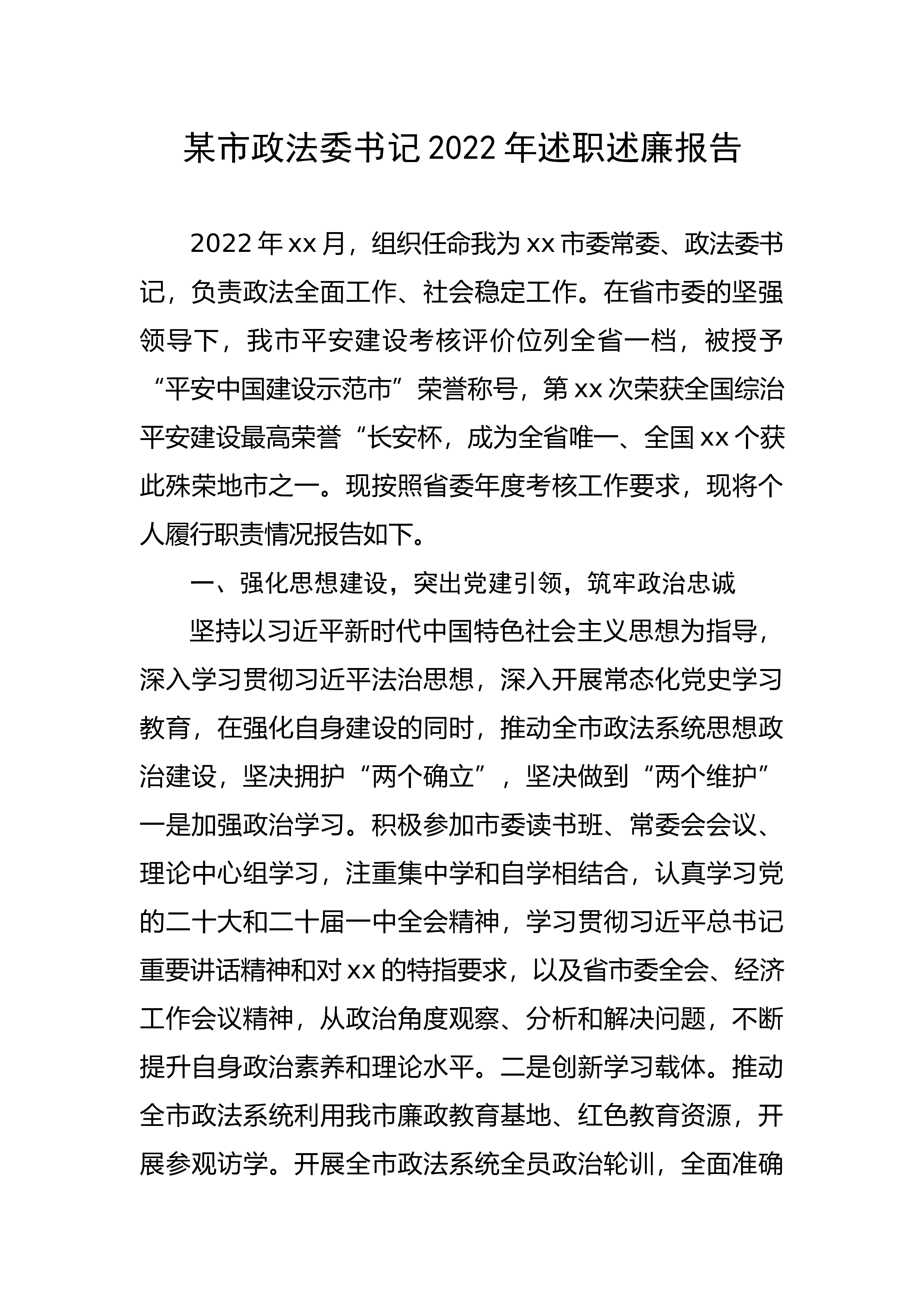 某市政法委书记2022年述职述廉报告2022年xx月,组织任命我为xx市委常委、政法委书记,负责政法全面工作、社会稳定工作。在省市委的坚强领导下,我市平安建设考核评价位列全省一档,被授予“平安中国建设示范市”荣誉称号,第xx次荣获全国综治平安建设最高荣誉“长安杯,成为全省唯一、全国xx个获此殊荣地市之一。现按照省委年度考核工作要求,现将个人履行职责情况报告如下。一、强化思想建设,突出党建引领,筑牢政治忠诚坚持以习近平新时代中国特色社会主义思想为指导,深入学习贯彻习近平法治思想,深入开展常态化