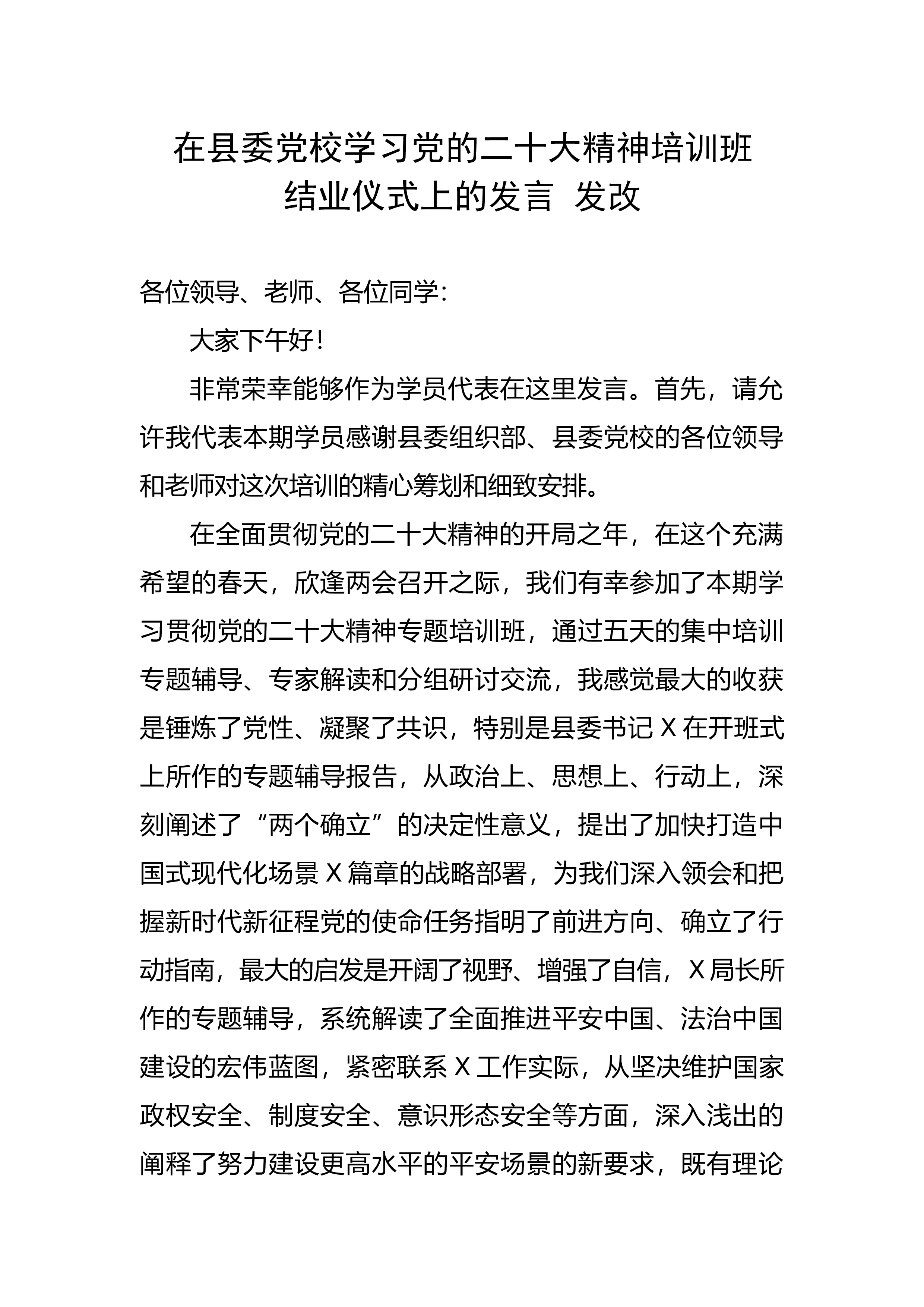 党的二十大精神培训班结业仪式上的发言发改各位领导、老师、各位同学:大家下午好!非常荣幸能够作为学员代表在这里发言。首先,请允许我代表本期学员感谢县委组织部、县委党校的各位领导和老师对这次培训的精心筹划和细致安排。在全面贯彻党的二十大精神的开局之年,在这个充满希望的春天,欣逢两会召开之际,我们有幸参加了本期学习贯彻党的二十大精神专题培训班,通过五天的集中培训专题辅导、专家解读和分组研讨交流,我感觉最大的收获是锤炼了党性、凝聚了共识,特别是县委书记X在开班式上所作的专题辅导报告,从政治上、思想上、行动上,深刻阐述了“两个确立”的决定性意义,提出了加快打造中国式现代化场景X篇章的战略部...