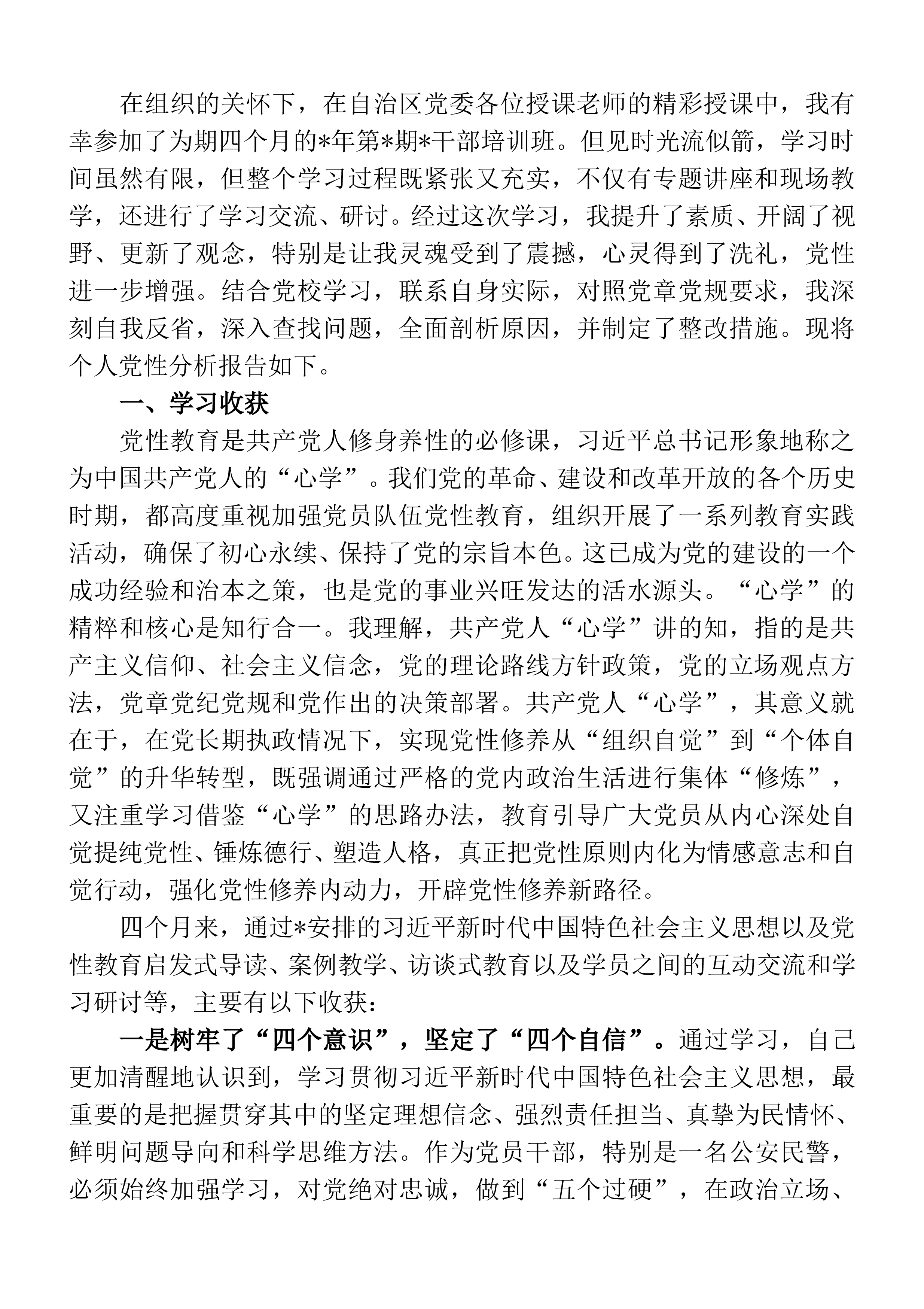 在组织的关怀下,在自治区党委各位授课老师的精彩授课中,我有幸参加了为期四个月的*年第*期*干部培训班。但见时光流似箭,学习时间虽然有限,但整个学习过程既紧张又充实,不仅有专题讲座和现场教学,还进行了学习交流、研讨。经过这次学习,我提升了素质、开阔了视野、更新了观念,特别是让我灵魂受到了震撼,心灵得到了洗礼,党性进一步增强。结合