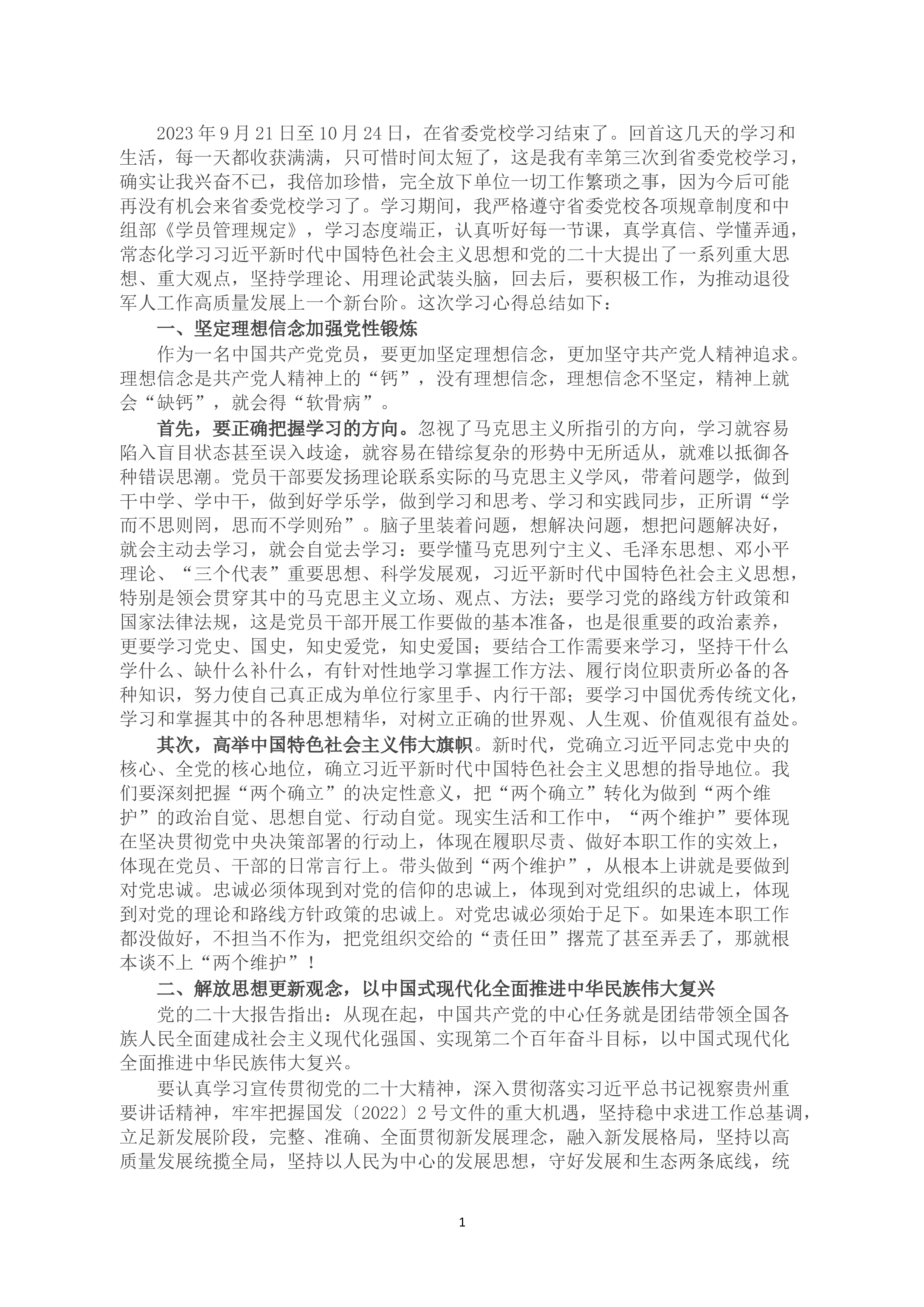 了。学习期间,我严格遵守省委党校各项规章制度和中组部《学员管理规定》,学习态度端正,认真听好每一节课,真学真信、学懂弄通,常态化学习习近平新时代中国特色社会主义思想和党的二十大提出了一系列重大思想、重大观点,坚持学理论、用理论武装头脑,回去后,要积极工作,为推动退役军人工作高质量发展上一个新台阶。这次学习心得总结如下:一、坚定理想信念加强党性锻炼作为一...