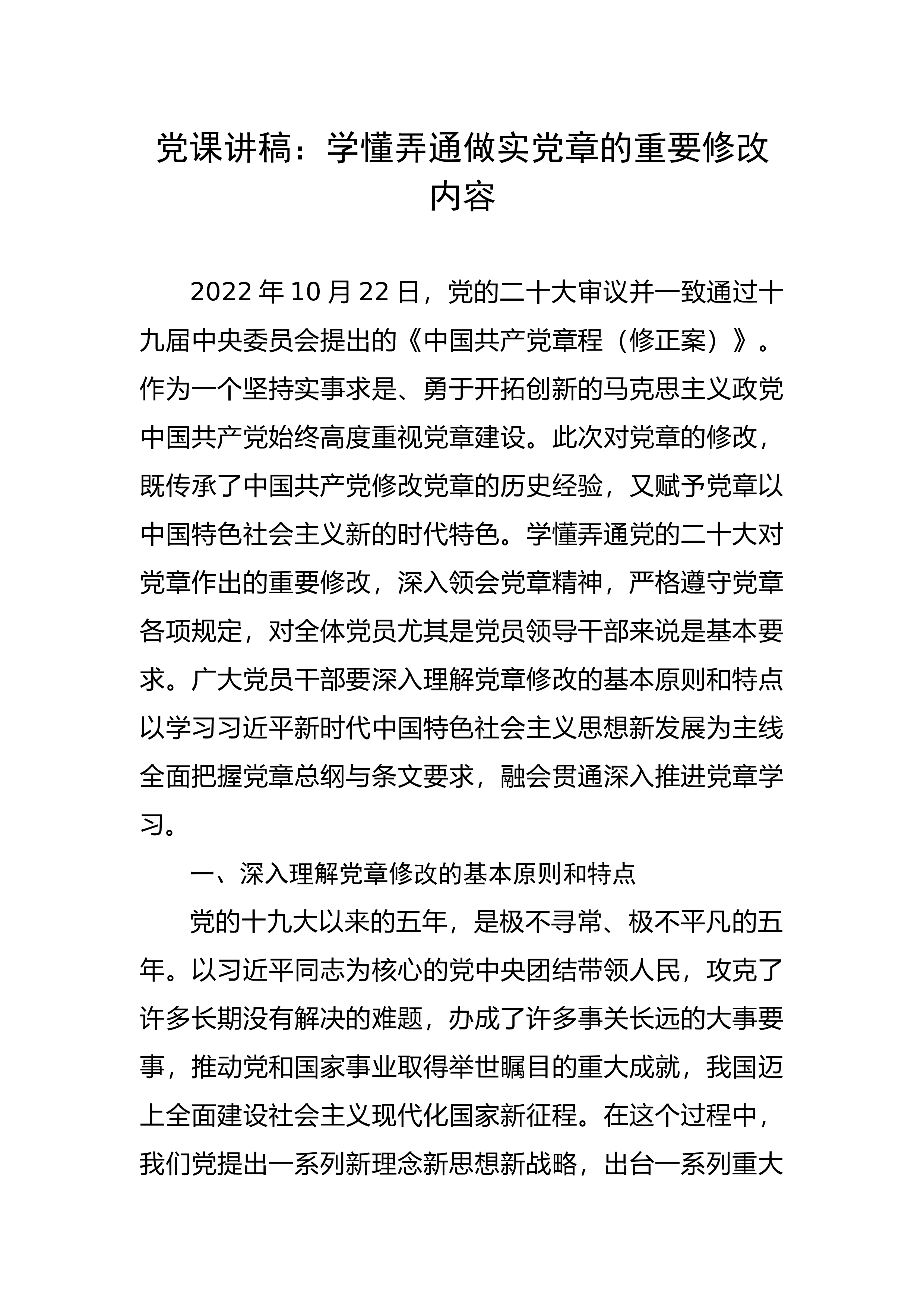 党课讲稿:学懂弄通做实党章的重要修改内容2022年10月22日,党的二十大审议并一致通过十九届中央委员会提出的《中国共产党章程(修正案)》。作为一个坚持实事求是、勇于开拓创新的马克思主义政党中国共产党始终高度重视党章建设。此次对党章的修改,既传承了中国共产党修改党章的历史经验,又赋予党章以中国特色社会主义新的时代特色。学懂弄通党的二十大对党章作出的重要修改,深入领会党章精神,严格遵守党章各项规定,对全体党员尤其是党员领导干部来说是基本要求。广大党员干部要深入理解党章修改的基本原则和特点以学习习近平新时代中国特色社会主义思想新发展为主线全面把握党章总纲与条文要求,融会贯通深入推进党章学习。一、深...
