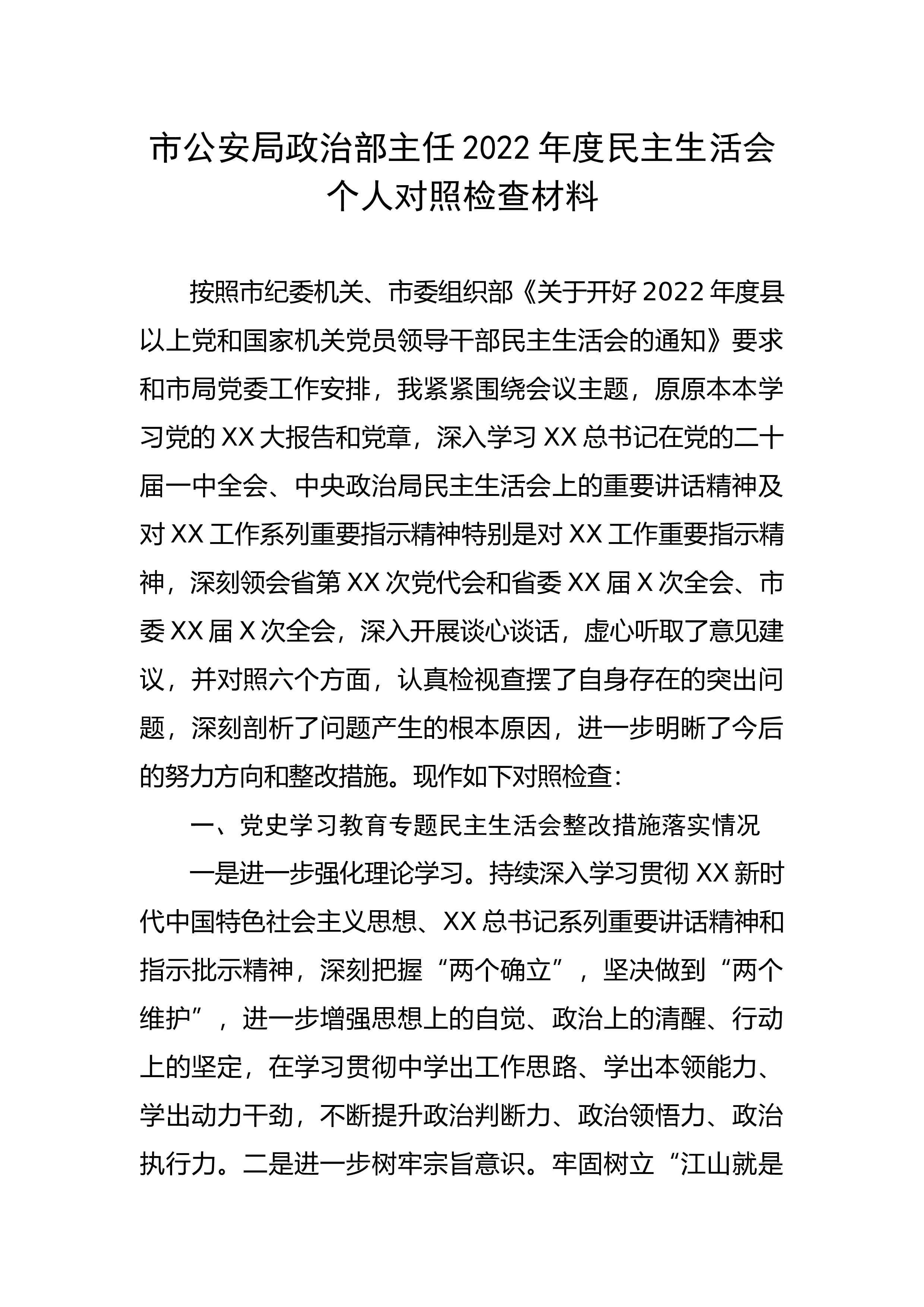 市场监管2022年度领导班子组织生活会发言提纲按照市局党组《XX市市场监督管理局2022年度县以上党员领导干部民主生活会方案》(石市场监管党发[2022]2号)文件要求,分局班子深入学习了习近平新时代中国特色社会主义思想、党的二十大报告、习近平总书记在参加党的二十大广西代表团讨论时的重要讲话、习近平总书记在党的二十届一中全会上的重要讲话精神等内容认真学习了自治区第十三次党代会和十三届一次、二次全会、市第十一次党代会、XX区第五次党代会精神,紧紧围绕“全面贯彻习近平新时代中国特色社会主义思想,深刻领悟“两个确立”的决定性意义,增强“四个意识”、坚定“四个自信”、做到“两个维护”,团结带领党员干部...