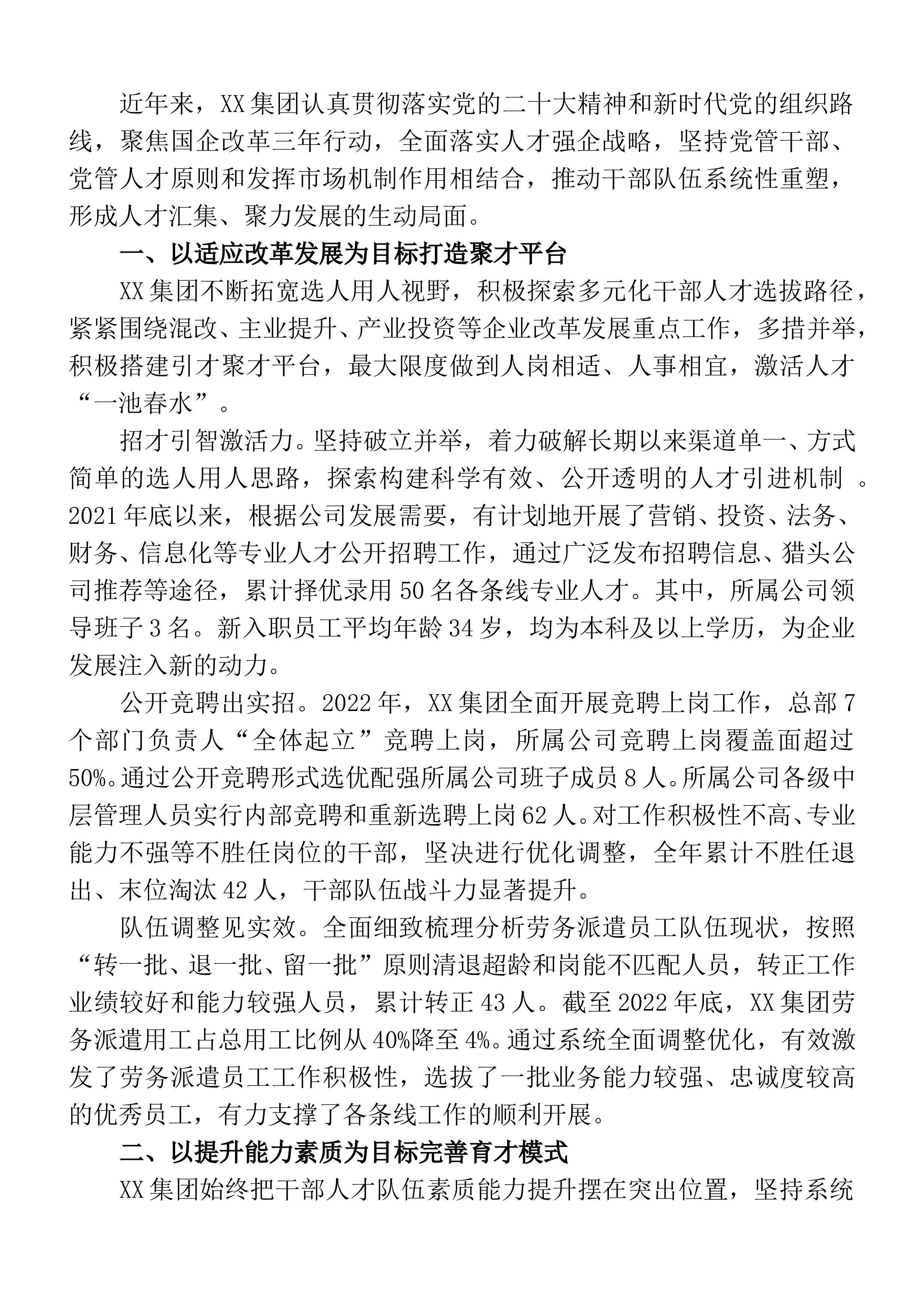 精神和新时代党的组织路线,聚焦国企改革三年行动,全面落实人才强企战略,坚持党管干部、党管人才原则和发挥市场机制作用相结合,推动干部队伍系统性重塑,形成人才汇集、聚力发展的生动局面。一、以适应改革发展为目标打造聚才平台XX集团不断拓宽选人用人视野,积极探索多元化干部人才选拔路径,紧紧围绕混改、主业提升、产业投资等企业改革发展重点工作,多措并举,积极搭建引才聚才平台,最大限度做到人岗相适、人事相宜,激活人才“一池春水”。招才引智激活力。坚持破立并举,着力破解长期以来渠道单一、方式简单的选人用人思路,探索构建科学有效、公开透明的人才引进机制。2021年底以来,根...
