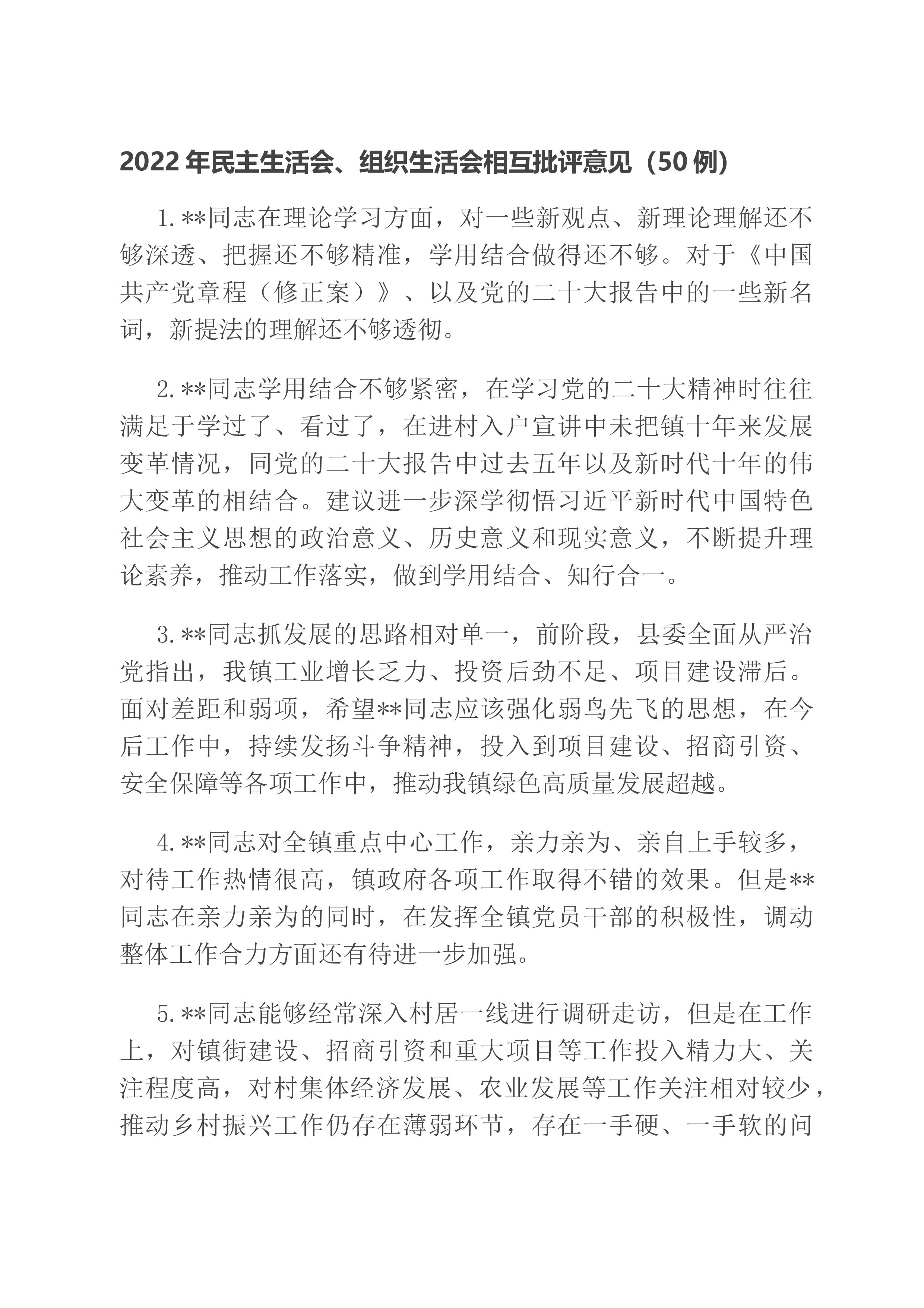 2022年民主生活会、组织生活会相互批评意见(50例)1.**同志在理论学习方面,对一些新观点、新理论理解还不够深透、把握还不够精准,学用结合做得还不够。对于《中国共产党章程(修正案)》、以及党的