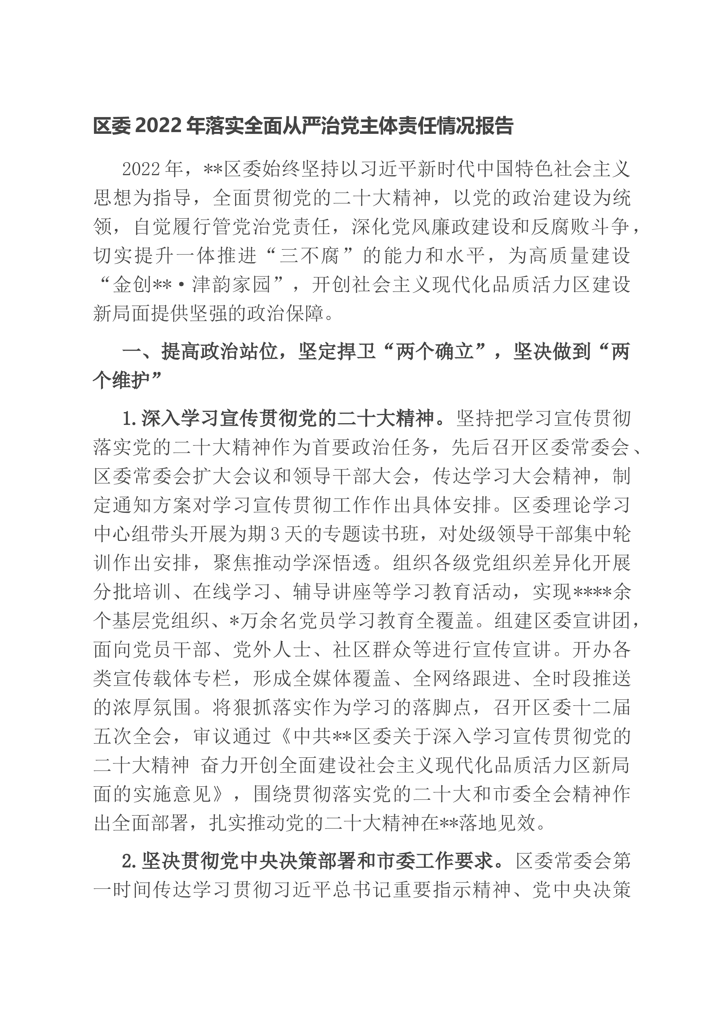 区委2022年落实全面从严治党主体责任情况报告2022年,**区委始终坚持以习近平新时代中国特色社会主义思想为指导,全面贯彻党的二十大精神,以党的政治建设为统领,自觉履行管党治党责任,深化党风廉政建设和反腐败斗争,切实提升一体推进“三不腐”的能力和水平,为高质量建设“金创**·津韵家园”,开创社会主义现代化品质活力区建设新局面提供坚强的政治保障。一、提高政治站位,坚定捍卫“两个确立”,坚决做到“两个维护”1.深入学习宣传贯彻党的二十大精神。坚持把学习宣传贯彻落实党的二十大精神作为首要政治任务,先后召开区委常委会、区委常委会扩大会议和领导干部大会,传达学习大会精神,制定通知方案对学习宣传贯彻工作...