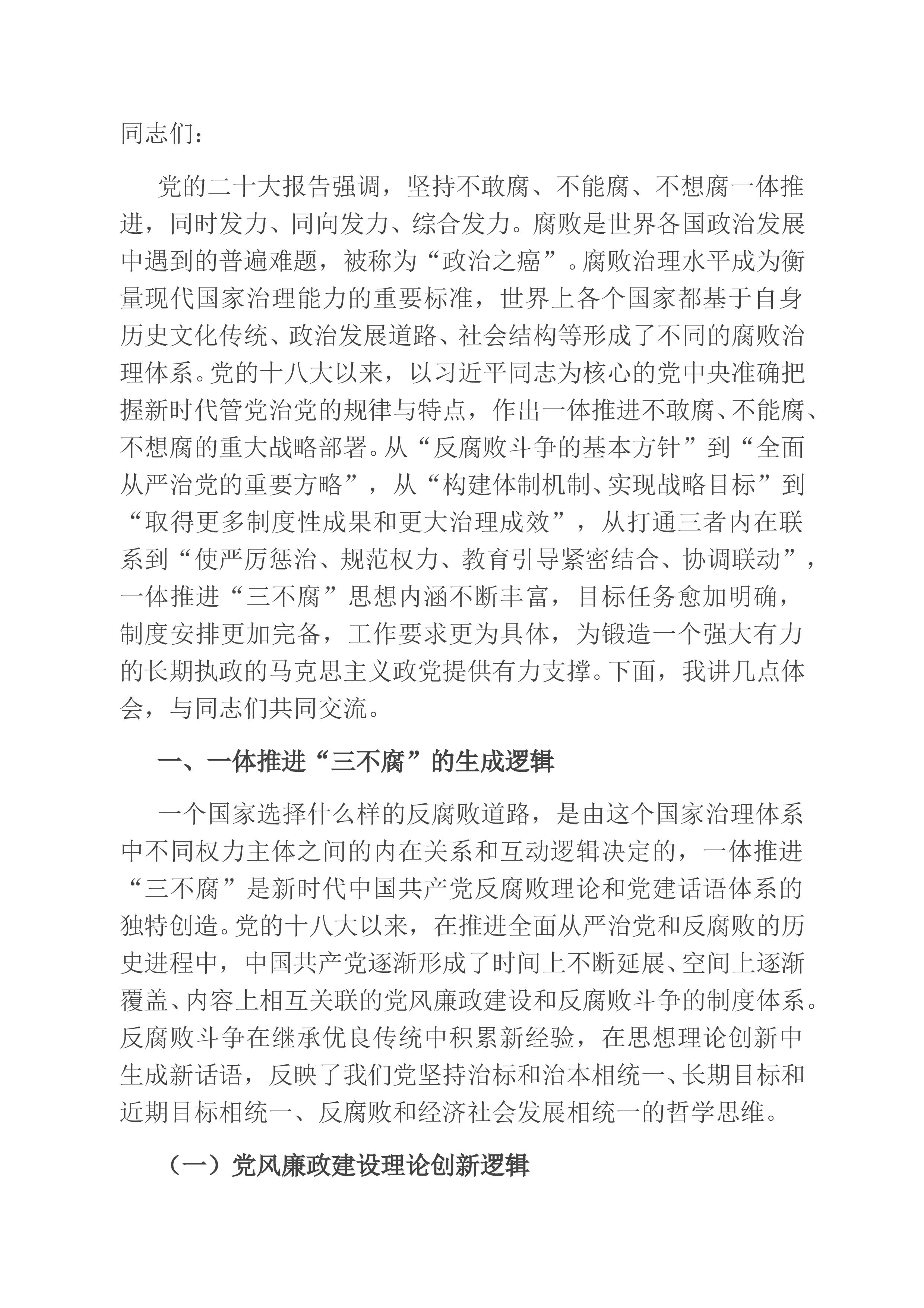 同志们:党的二十大报告强调,坚持不敢腐、不能腐、不想腐一体推进,同时发力、同向发力、综合发力。腐败是世界各国政治发展中遇到的普遍难题,被称为“政治之癌”。腐败治理水平成为衡量现代国家治理能力的重要标准,世界上各个国家都基于自身历史文化传统、政治发展道路、社会结构等形成了不同的腐败治理体系。党的十八大以来,以习近平同志为核心的党中央准确把握新时代管党治党的规律与特点,作出一体推进不敢腐、不能腐、不想腐的重大战略部署。从“