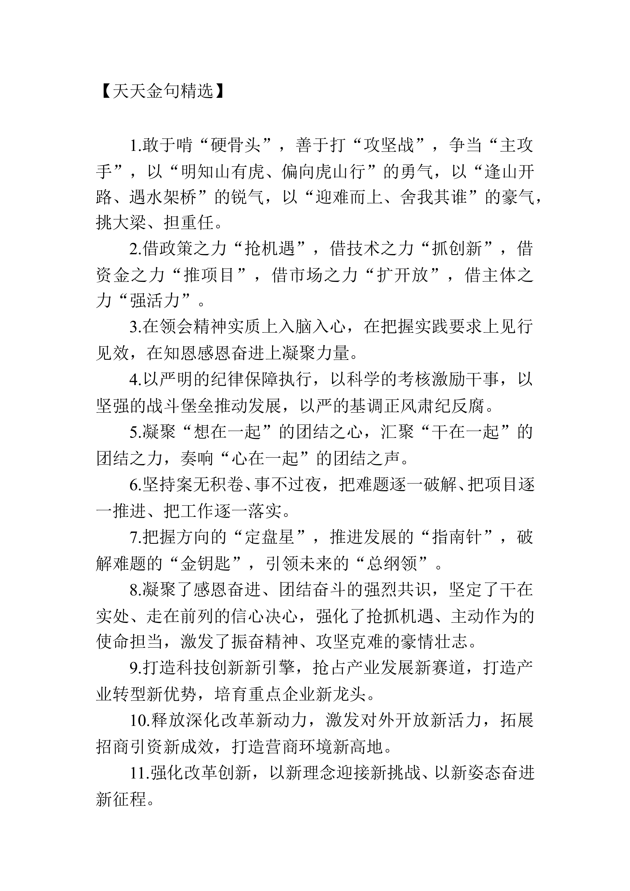 【天天金句精选】1.敢于啃“硬骨头”,善于打“攻坚战”,争当“主攻手”,以“明知山有虎、偏向虎山行”的勇气,以“逢山开路、遇水架桥”的锐气,以“迎难而上、舍我其谁”的豪气,挑大梁、担重任。2.借政策之力“抢机遇”,借技术之力“抓创新”,借资金之力“推项目”,借市场之力“扩开放”,借主体之力“强活力”。3.在领会精神实质上入脑入心,在把握实践要求上见行见效,在知恩感恩奋进上凝聚力量。4.以严明的纪律保障执行,以科学的考核激励干事,以坚强的战斗堡垒推动发展,以严的基调正风肃纪