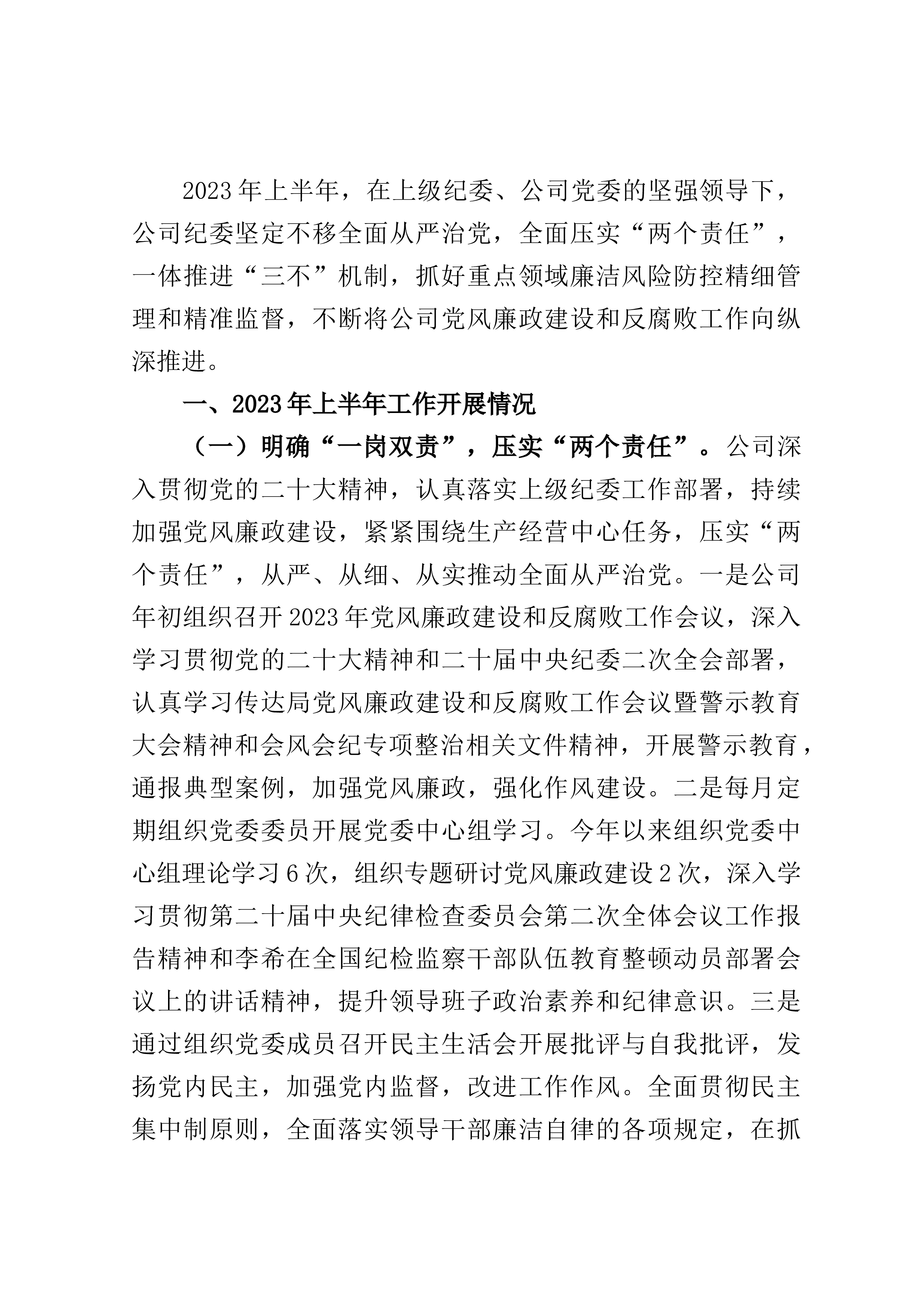 2023年上半年,在上级纪委、公司党委的坚强领导下,公司纪委坚定不移全面从严治党,全面压实“两个责任”,一体推进“三不”机制,抓好重点领域廉洁风险防控精细管理和精准监督,不断将公司党风廉政建设和反腐败工作向纵深推进。一、2023年上半年工作开展情况(一)明确“一岗双责”,压实“两个责任”。公司深入贯彻党的二十大精神,认真落实上级纪委工作部署,持续加强党风廉政建设,紧紧围绕生产经营中心任务,压实“两个责任”,从严、从细、从实推动全面从严治党。一是公司年初组织召开2023年党风廉政建设和反腐败工作会议,深入学习贯彻党的二十大精神和二十届中央纪委二次全会部署,认真学习传达局党风廉政建设和反腐败工作会...