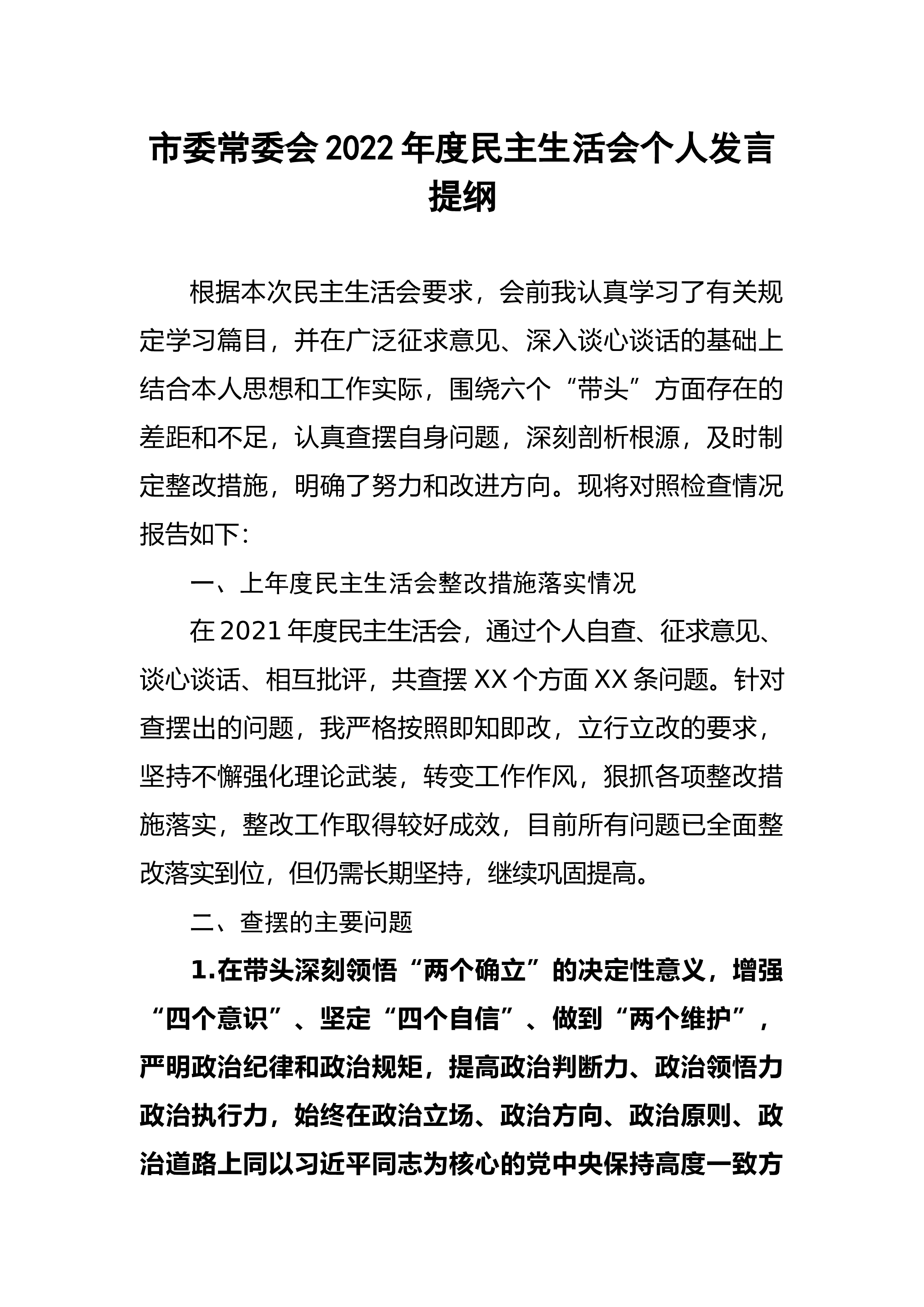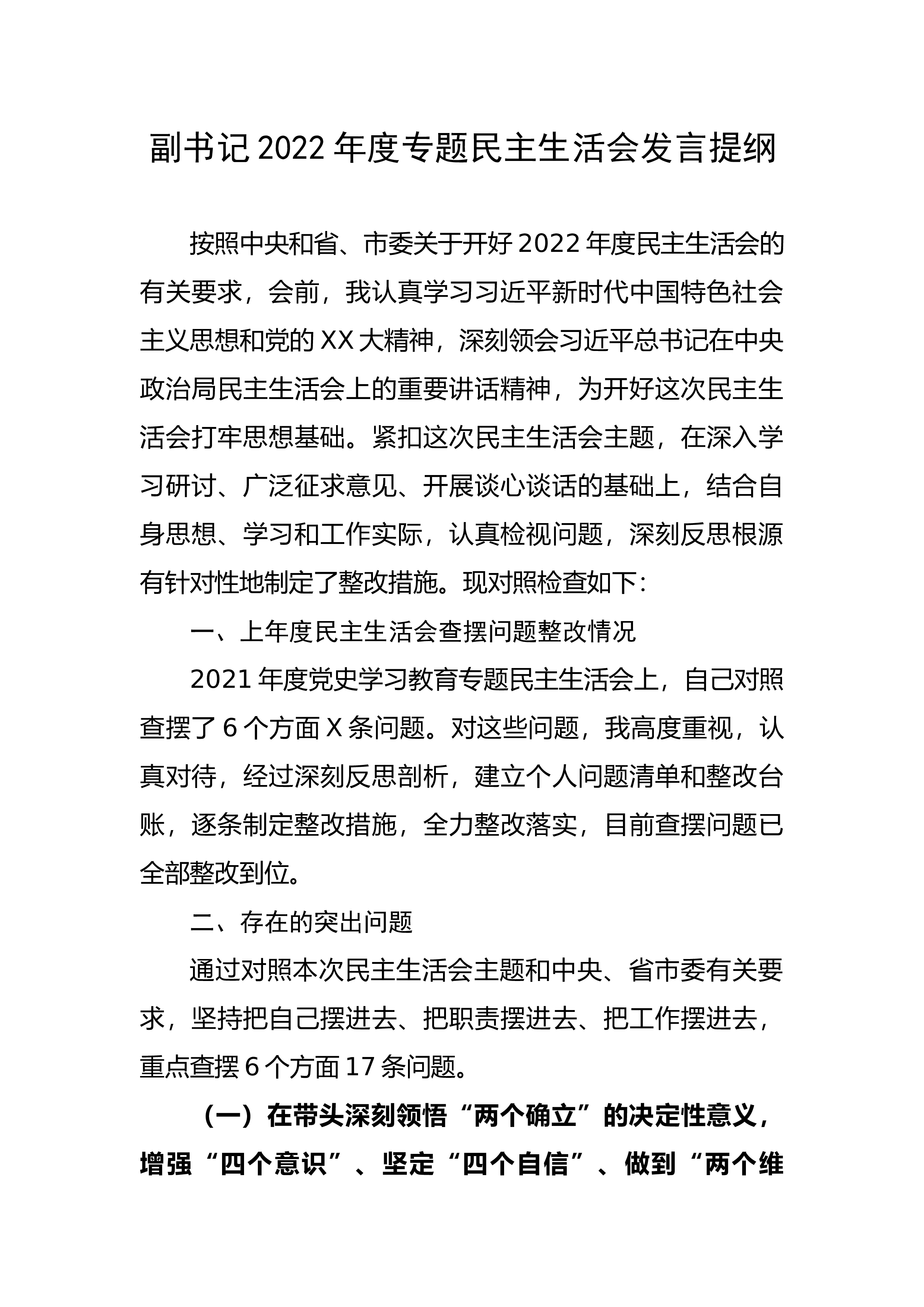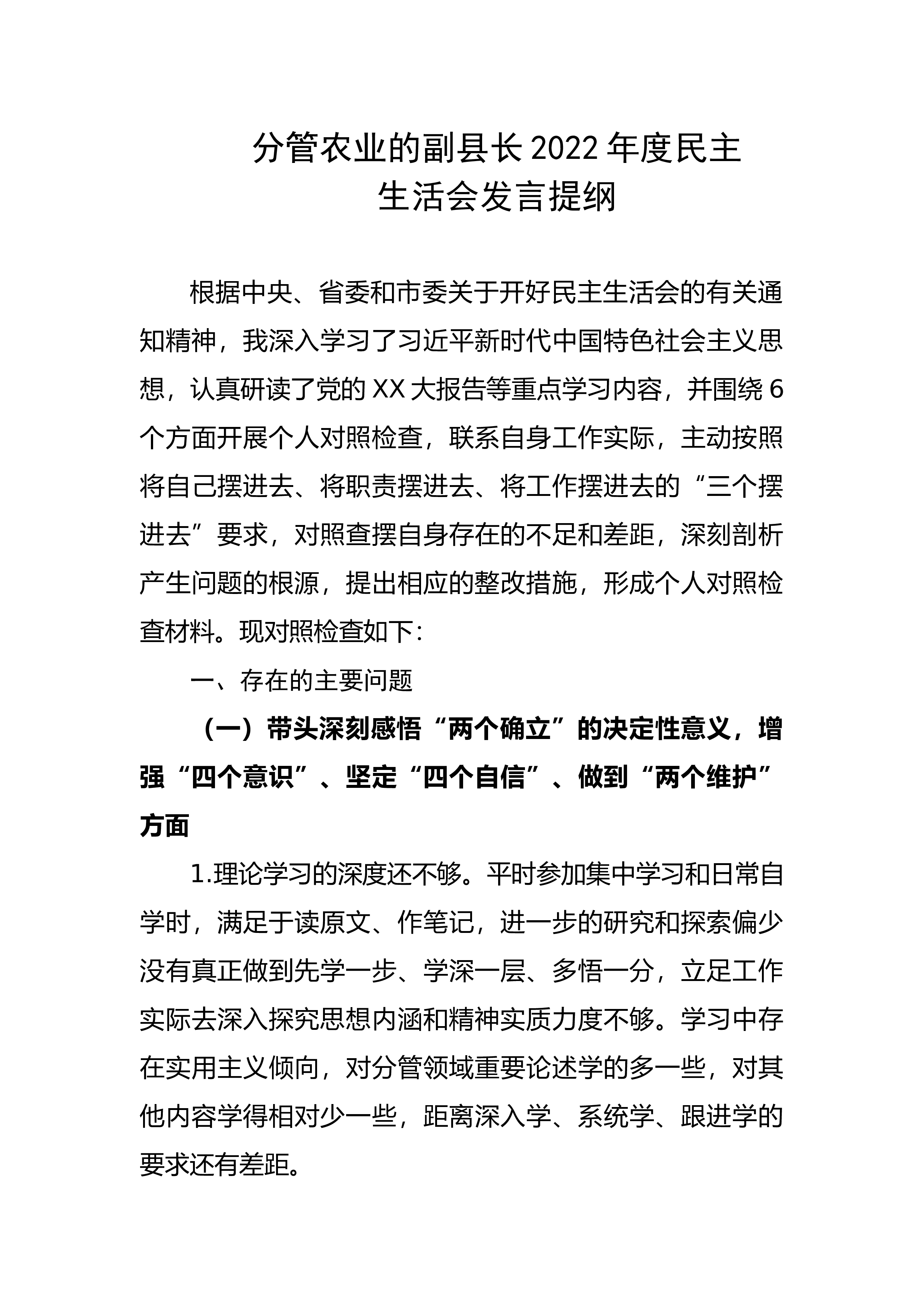 副县长2022年度民主生活会个人发言提纲根据此次民主生活会的安排部署,我紧扣主题,深化学习,并结合个人思想、学习和工作实际,从“6个重点方面”深入查摆自己存在的问题,深刻剖析问题根源,针对性提出改进措施。现将个人对照检查情况汇报如下:一、对照6个方面存在的主要问题(一)带头深刻感悟“两个确立”的决定性意义,增强“四个意识”、坚定“四个自信”、做到“两个维护”方面。1.理论学习抓的不实。平时更多的是把主要精力放在分管领域业务性工作上,日常政治理论学习很大程度上局限于参加常委会、政府党组会、理论中心组等集中学习,被动听文件、做笔记,利用业余时间持续延伸学、全面系统学做得不够好,没能很好地处理好“工...
