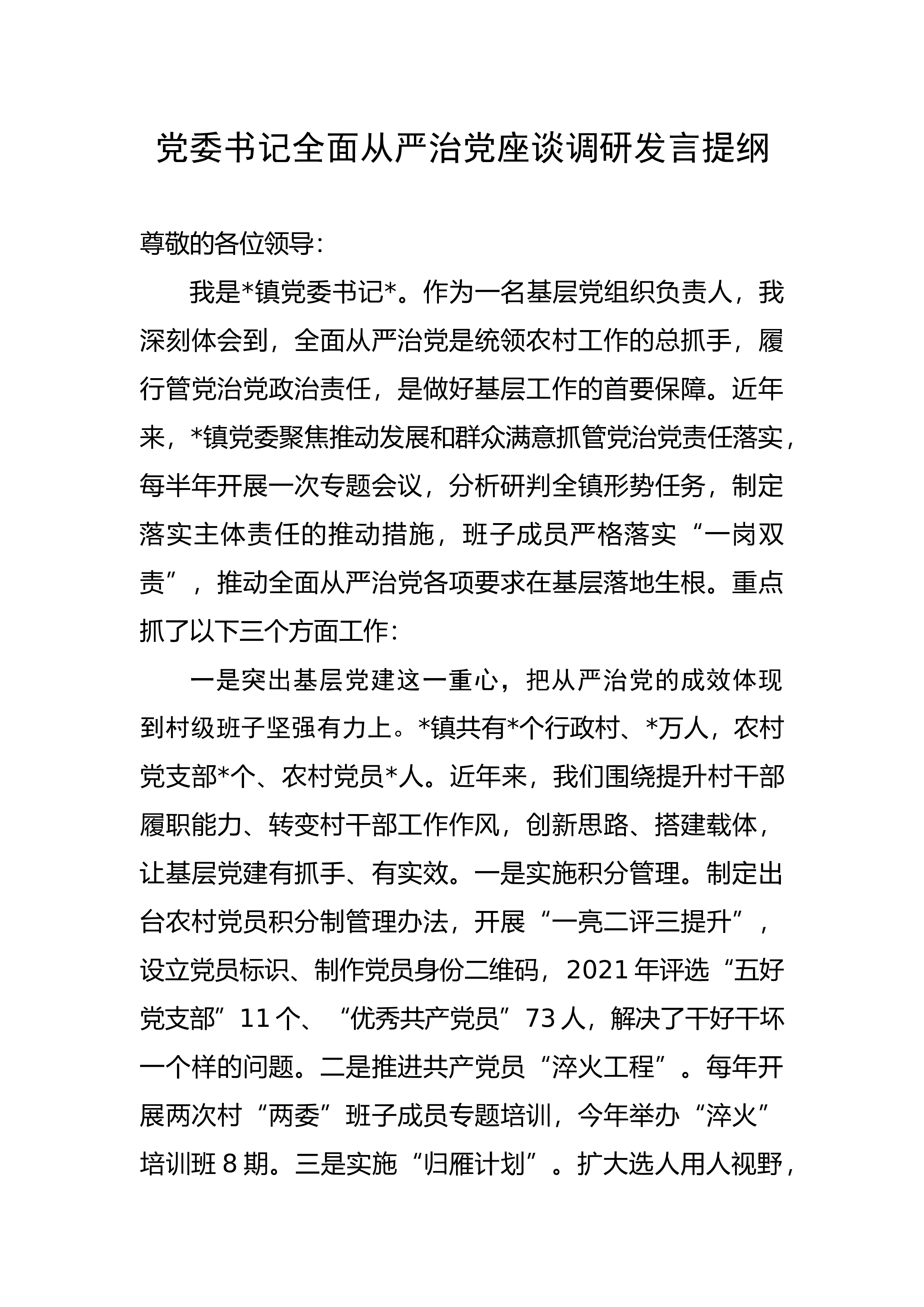 尊敬的各位领导:我是*镇党委书记*。作为一名基层党组织负责人,我深刻体会到,全面从严治党是统领农村工作的总抓手,履行管党治党政治责任,是做好基层工作的首要保障。近年来,*镇党委聚焦推动发展和群众满意抓管党治党责任落实,每半年开展一次专题会议,分析研判全镇形势任务,制定落实主体责任的推动措施,班子成员严格落实“一岗双责”,推动全面从严治党各项要求在基层落地生根。重点抓了以下三个方面工作:一是突出基层党建这一重心,把从严治党的成效体现到村级班子坚强有力上。*镇共有*个行政村、*万人,农村党支部*个、农村党员*人。近年来,我们围绕提升村干部履职能力、转变村干部工作...