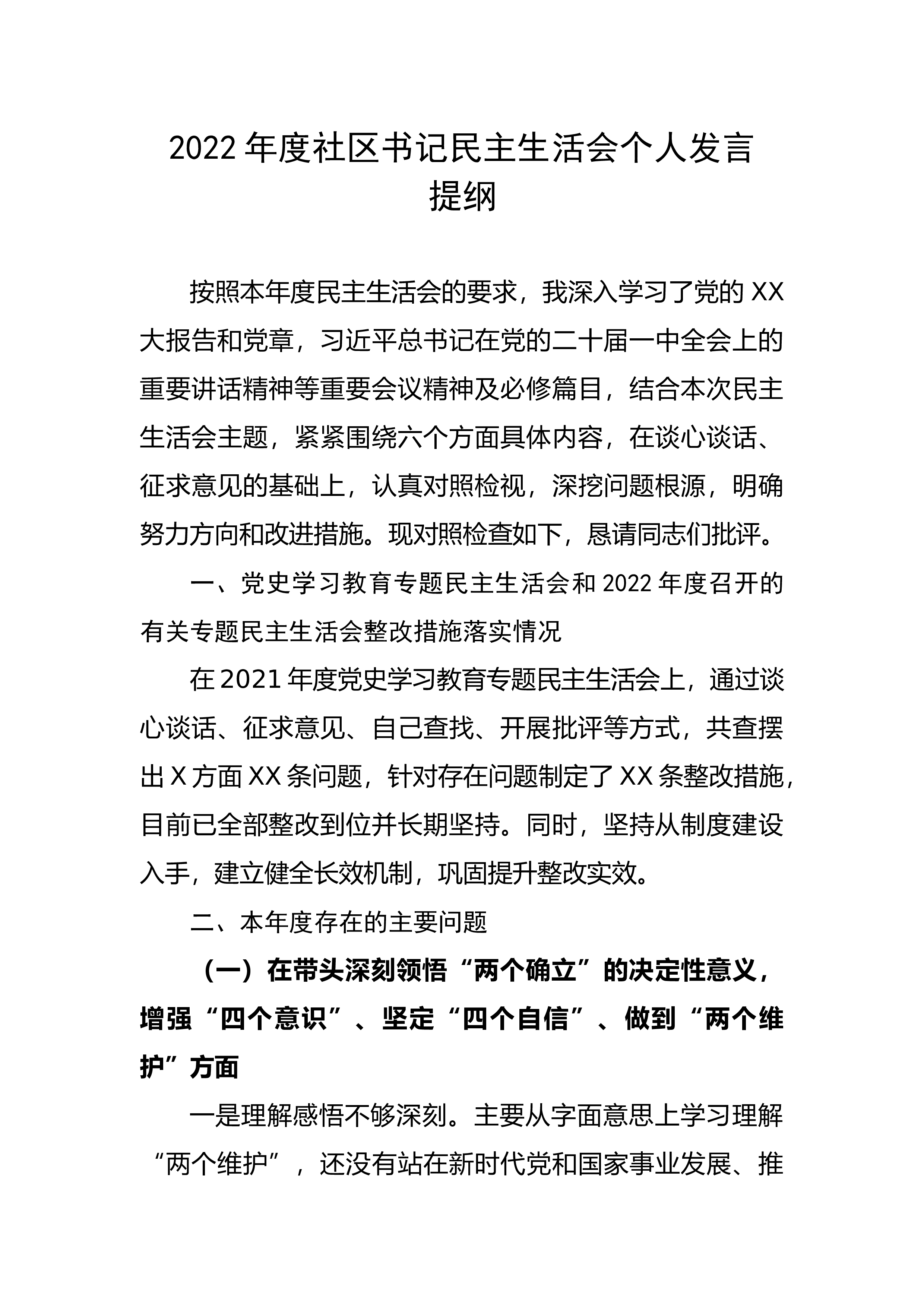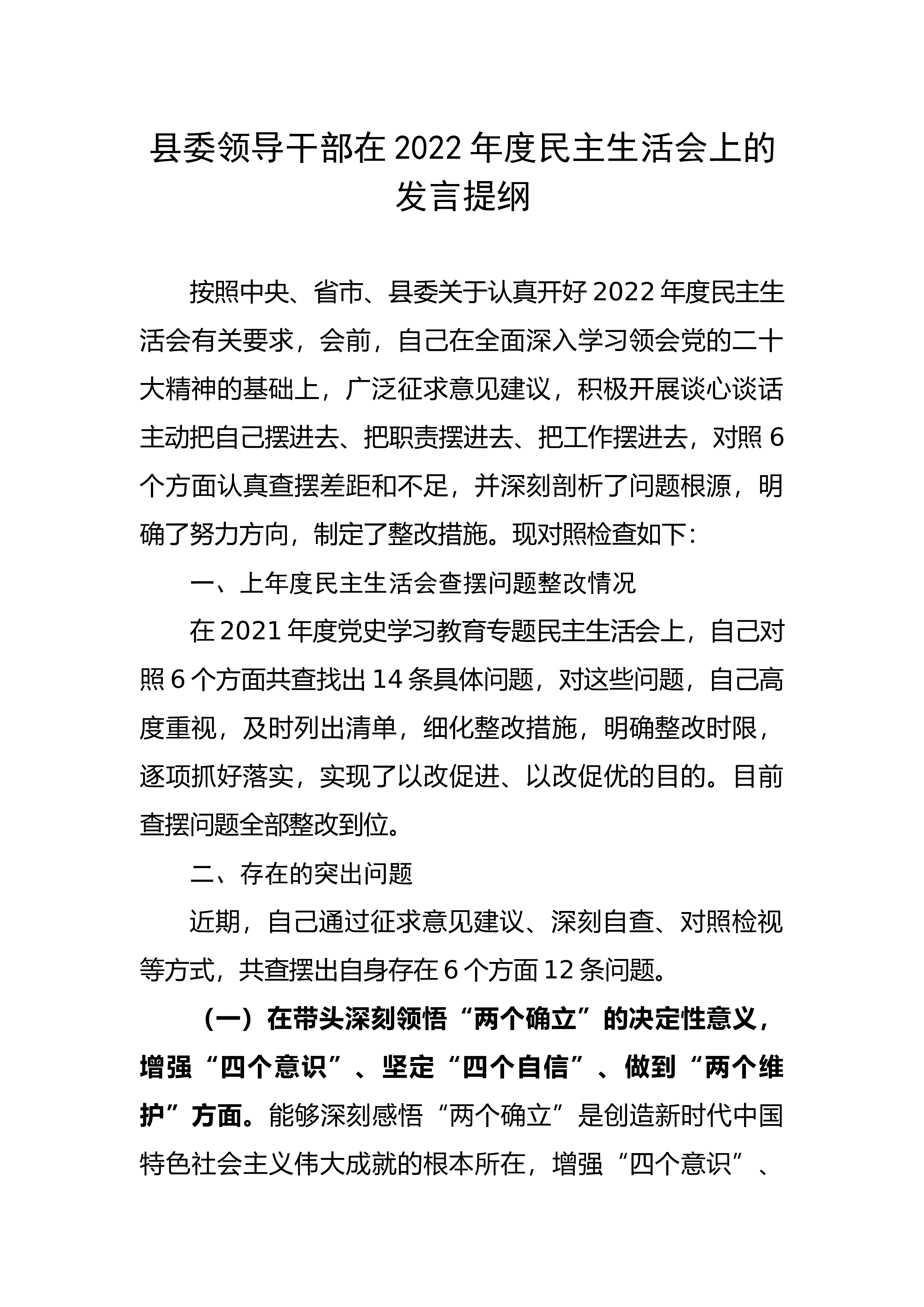 县委领导干部在2022年度民主生活会上的发言提纲按照中央、省市、县委关于认真开好2022年度民主生活会有关要求,会前,自己在全面深入学习领会党的二十大精神的基础上,广泛征求意见建议,积极开展谈心谈话主动把自己摆进去、把职责摆进去、把工作摆进去,对照6个方面认真查摆差距和不足,并深刻剖析了问题根源,明确了努力方向,制定了整改措施。现对照检查如下:一、上年度民主生活会查摆问题整改情况在2021年度党史学习教育专题民主生活会上,自己对照6个方面共查找出14条具体问题,对这些问题,自己高度重视,及时列出清单,细化整改措施,明确整改时限,逐项抓好落实,实现了以改促进、以改促优的目的。目前查摆问题全部整改...