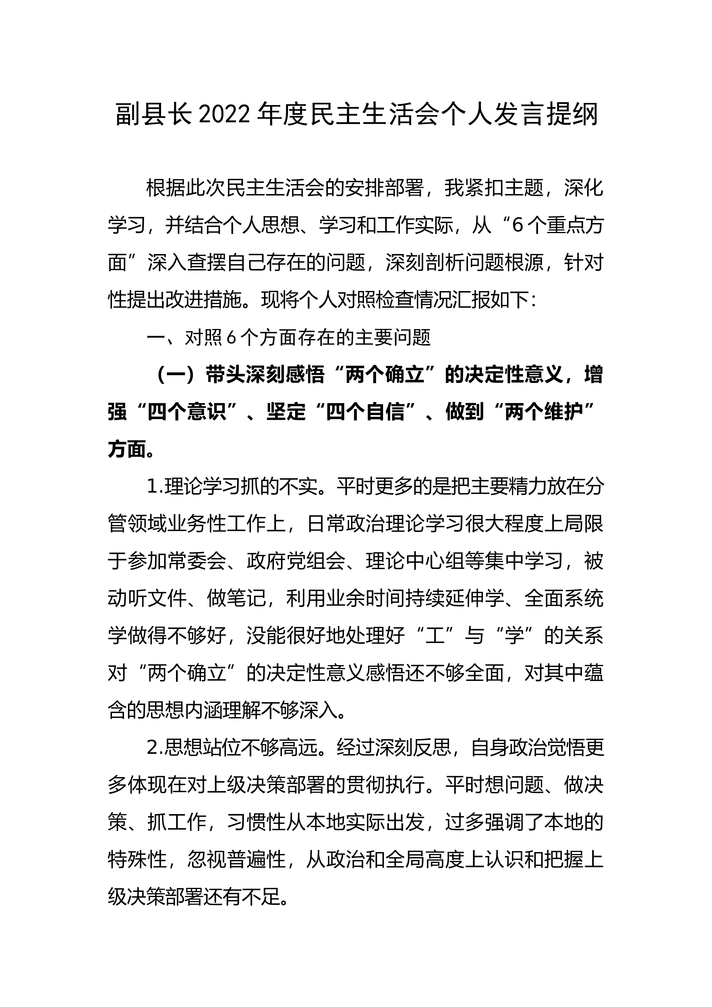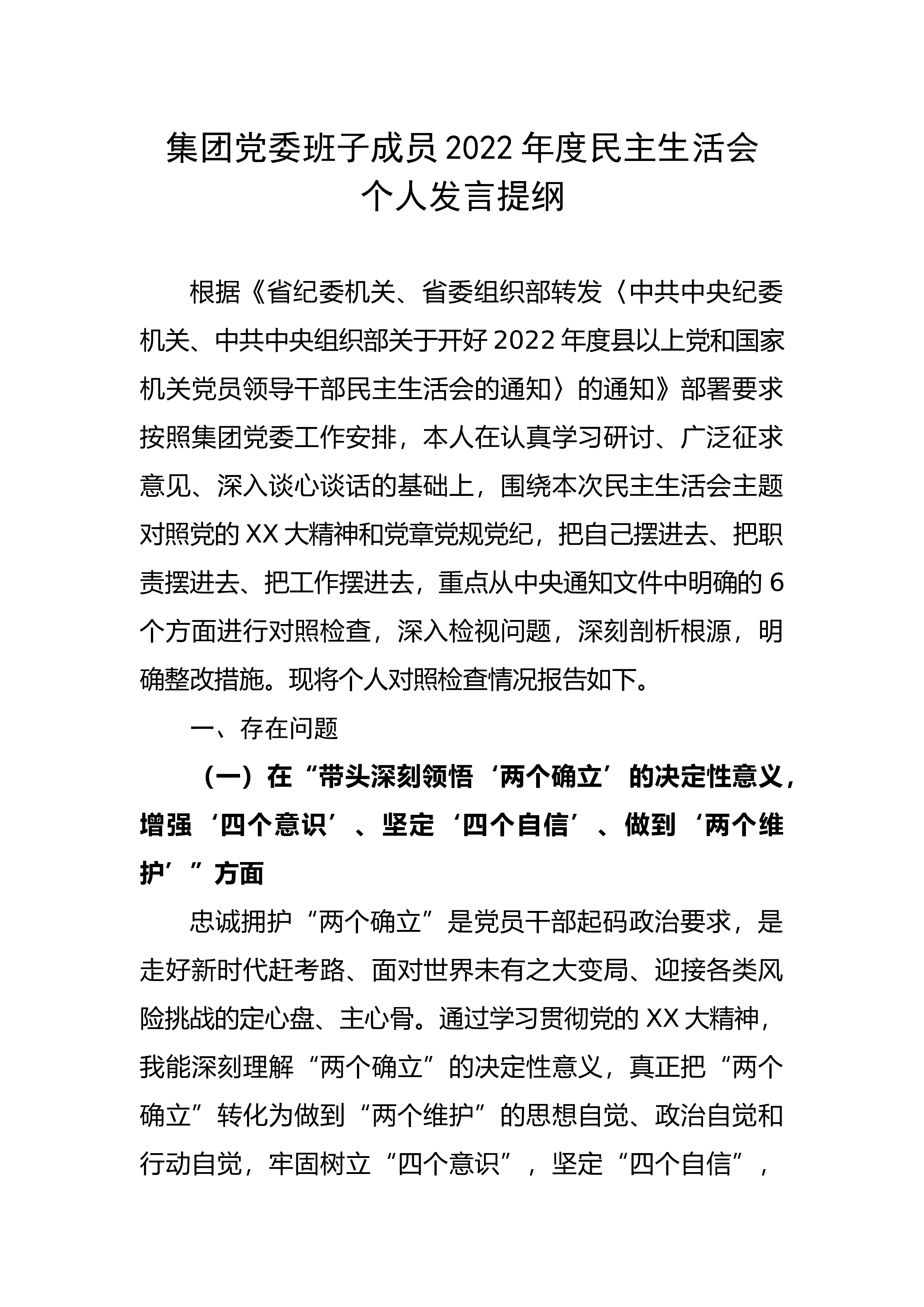 集团党委班子成员2022年度民主生活会个人发言提纲根据《省纪委机关、省委组织部转发〈中共中央纪委机关、中共中央组织部关于开好2022年度县以上党和国家机关党员领导干部民主生活会的通知〉的通知》部署要求按照集团党委工作安排,本人在认真学习研讨、广泛征求意见、深入谈心谈话的基础上,围绕本次民主生活会主题对照党的XX大精神和党章党规党纪,把自己摆进去、把职责摆进去、把工作摆进去,重点从中央通知文件中明确的6个方面进行对照检查,深入检视问题,深刻剖析根源,明确整改措施。现将个人对照检查情况报告如下。一、存在问题(一)在“带头深刻领悟‘两个确立’的决定性意义,增强‘四个意识’、坚定‘四个自信’、做到‘两...