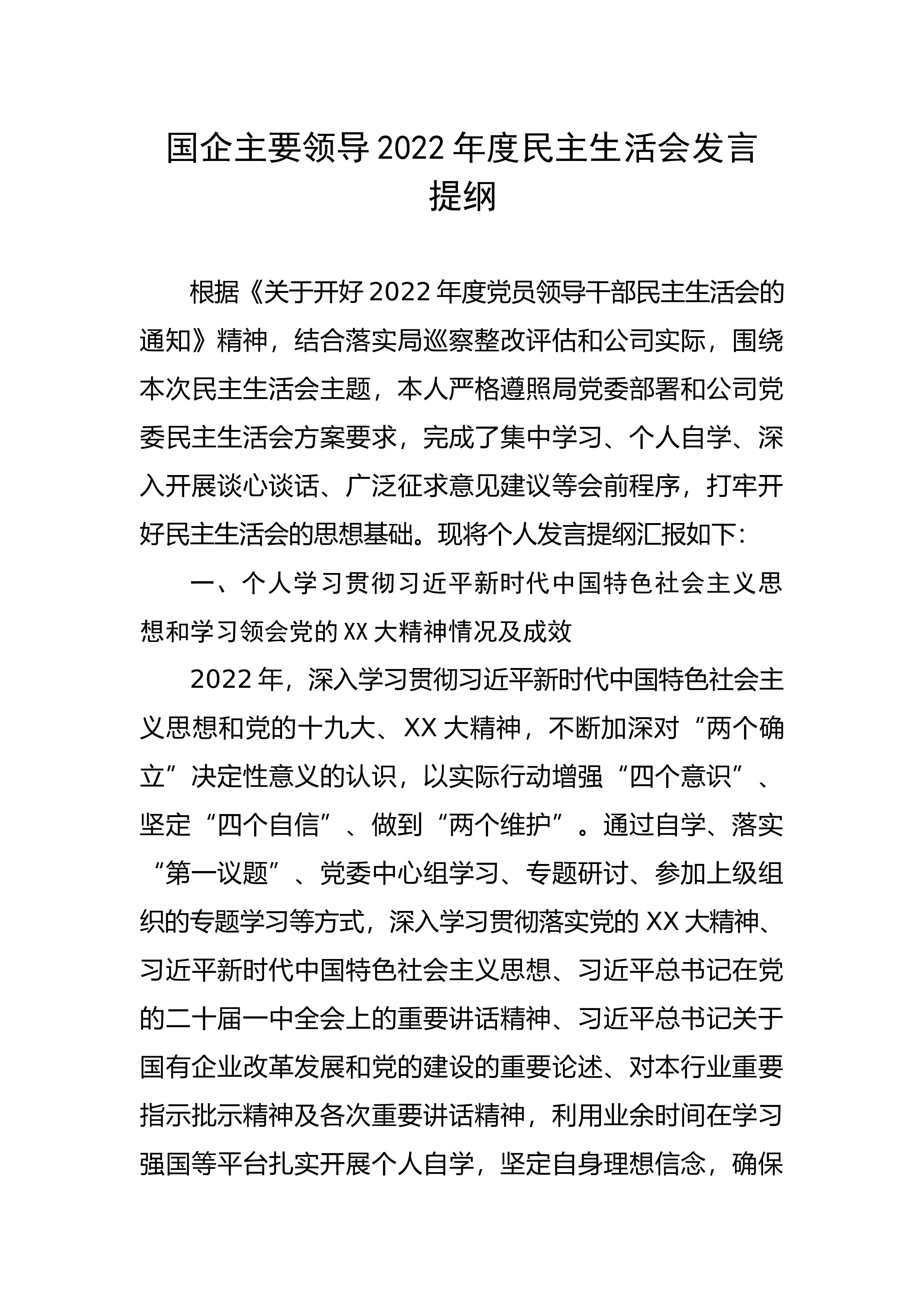 【国资国企】集团党委班子成员2022年度民主生活会个人发言提纲