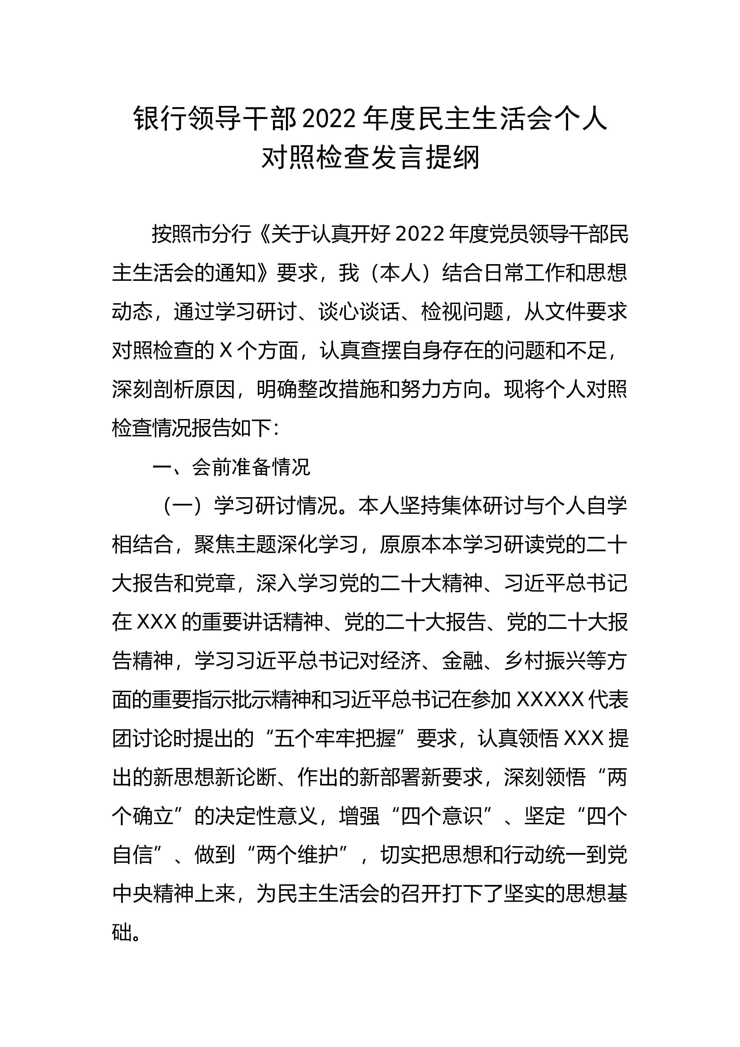 银行领导干部2022年度民主生活会个人对照检查发言提纲按照市分行《关于认真开好2022年度党员领导干部民主生活会的通知》要求,我(本人)结合日常工作和思想动态,通过学习研讨、谈心谈话、检视问题,从文件要求对照检查的X个方面,认真查摆自身存在的问题和不足,深刻剖析原因,明确整改措施和努力方向。现将个人对照检查情况报告如下:一、会前准备情况(一)学习研讨情况。本人坚持集体研讨与个人自学相结合,聚焦主题深化学习,原原本本学习研读党的二十大报告和党章,深入学习党的二十大精神、习近平总书记在XXX的重要讲话精神、党的二十大报告、党的二十大报告精神,学习习近平总书记对经济、金融、乡村振兴等方面的重要指示批...