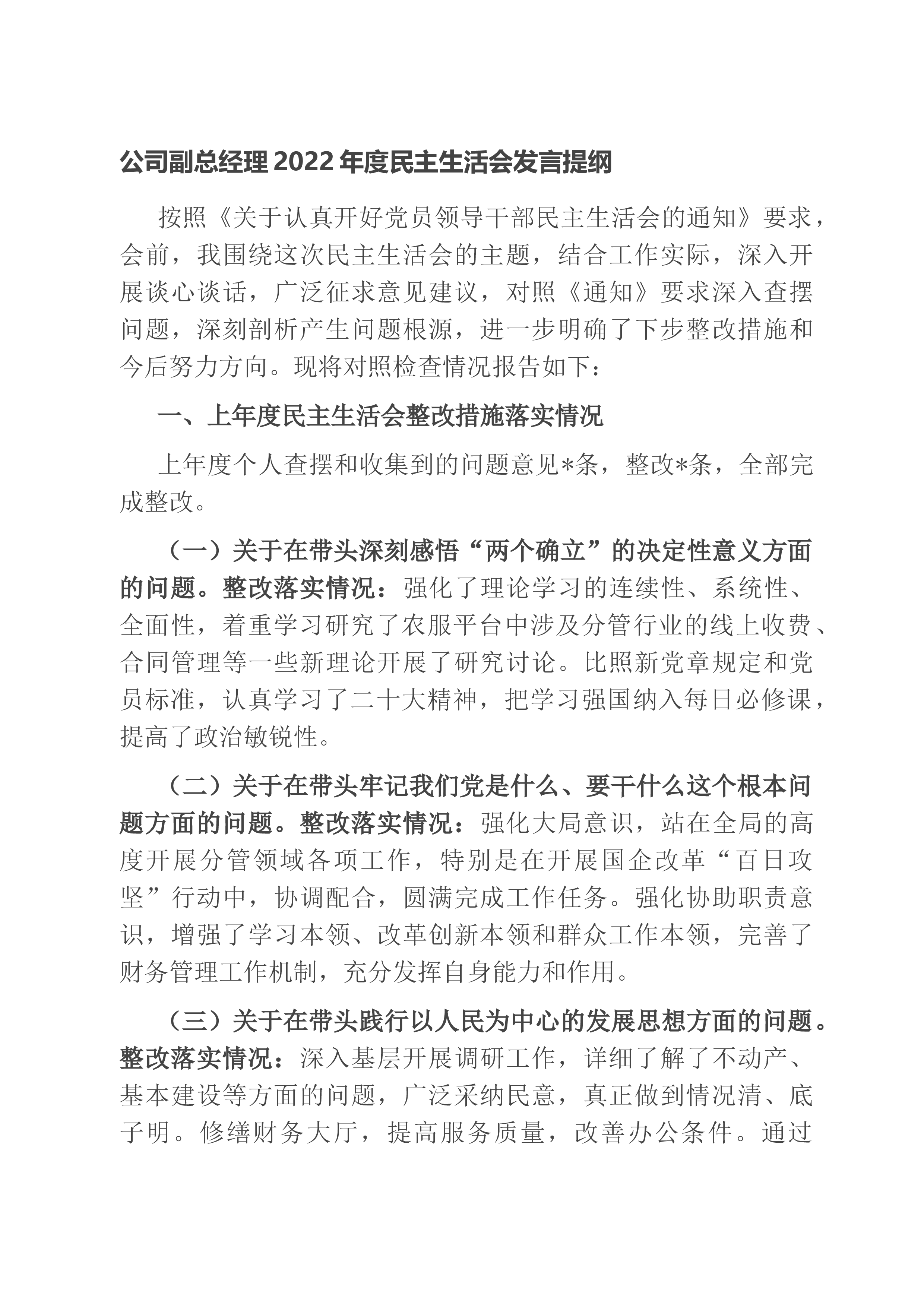 【国资国企】银行领导干部2022年度民主生活会个人对照检查发言提纲