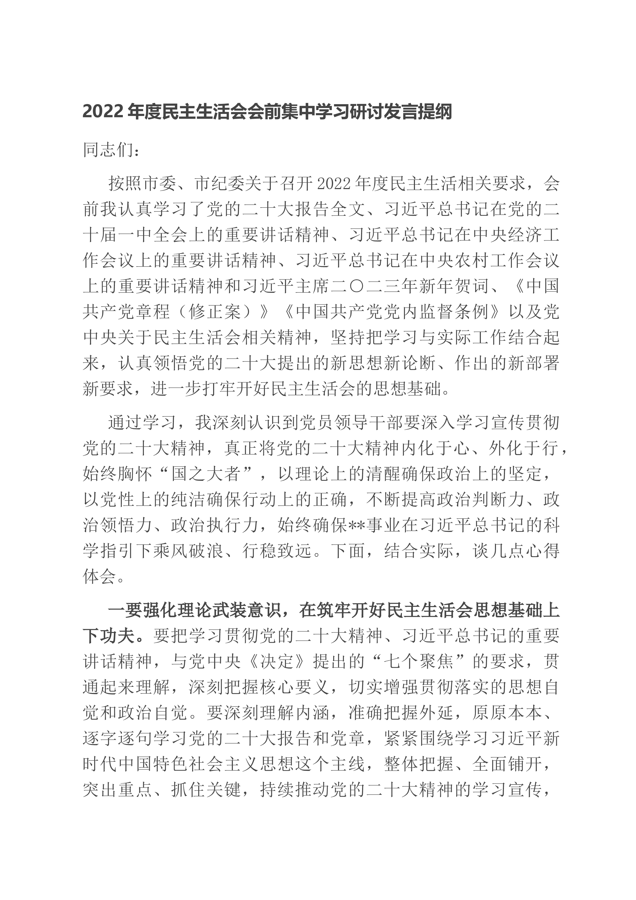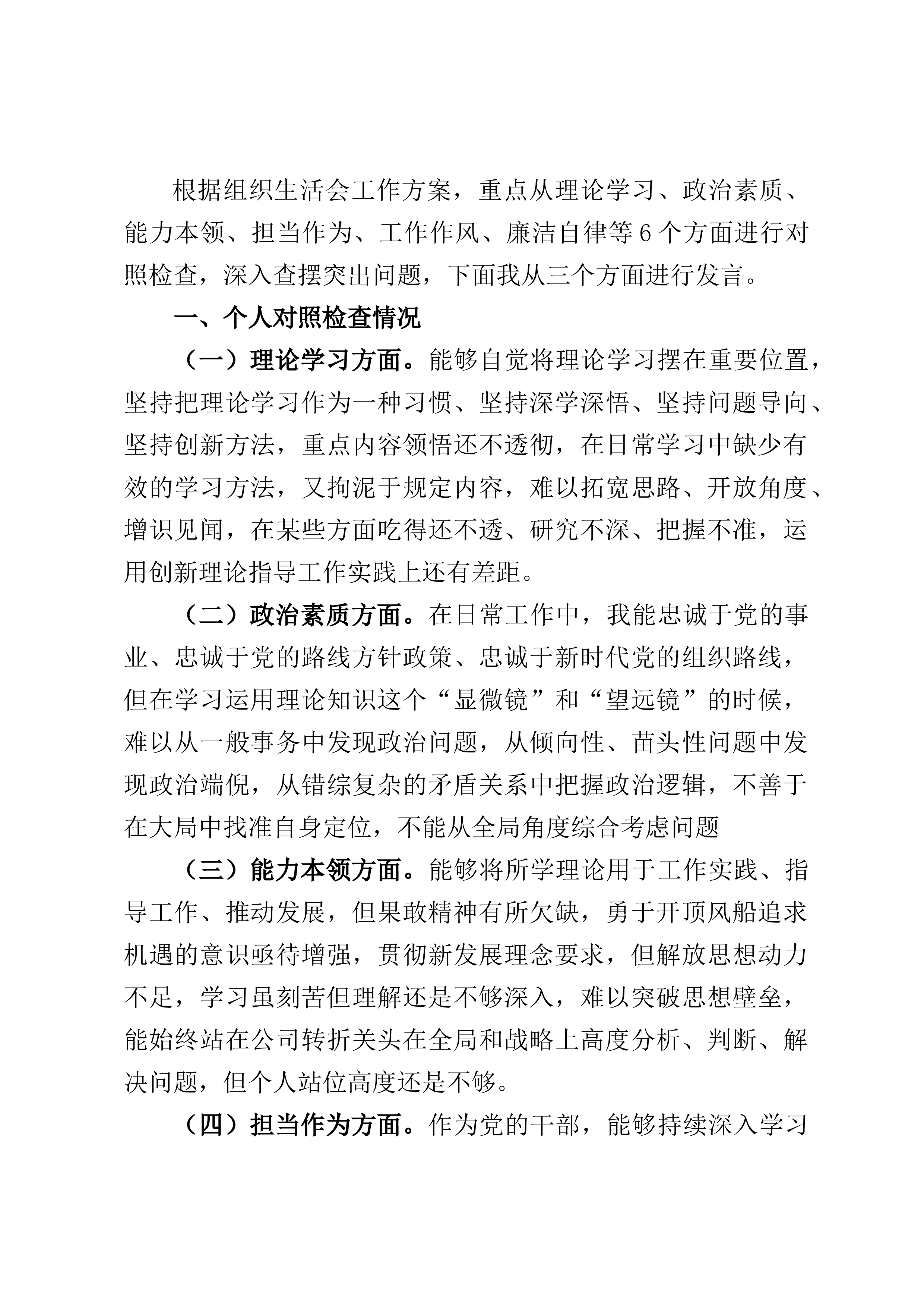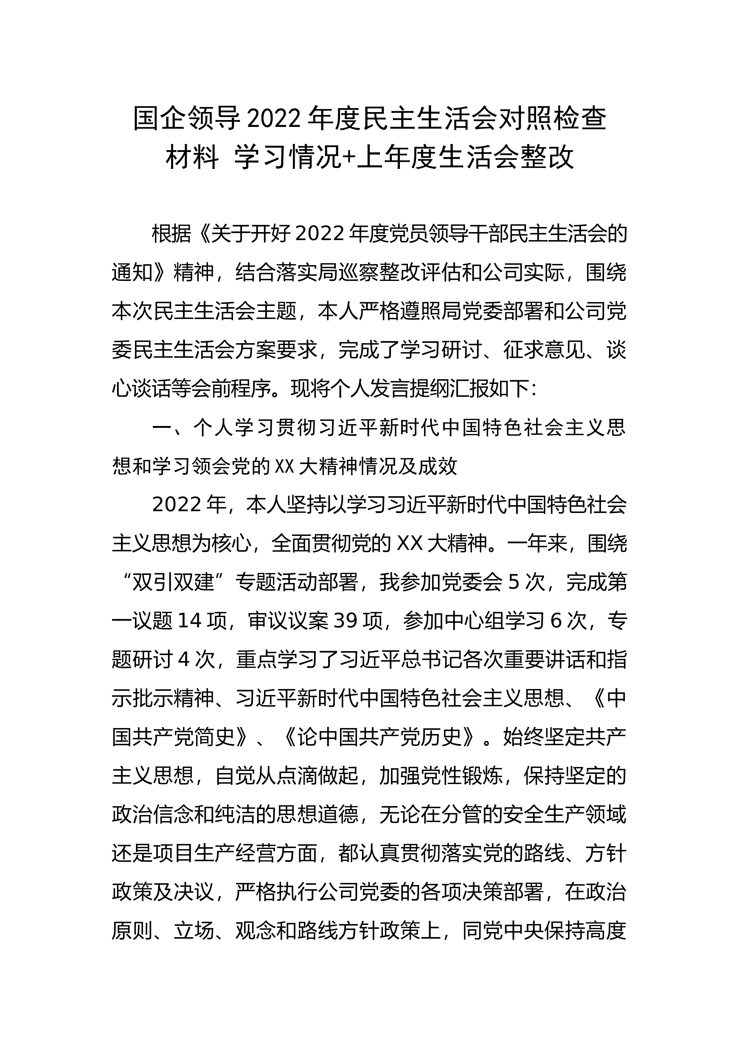 国企领导2022年度民主生活会对照检查材料学习情况+上年度生活会整改根据《关于开好2022年度党员领导干部民主生活会的通知》精神,结合落实局巡察整改评估和公司实际,围绕本次民主生活会主题,本人严格遵照局党委部署和公司党委民主生活会方案要求,完成了学习研讨、征求意见、谈心谈话等会前程序。现将个人发言提纲汇报如下:一、个人学习贯彻习近平新时代中国特色社会主义思想和学习领会党的XX大精神情况及成效2022年,本人坚持以学习习近平新时代中国特色社会主义思想为核心,全面贯彻党的XX大精神。一年来,围绕“双引双建”专题活动部署,我参加党委会5次,完成第一议题14项,审议议案39项,参加中心组学习6次,专题...