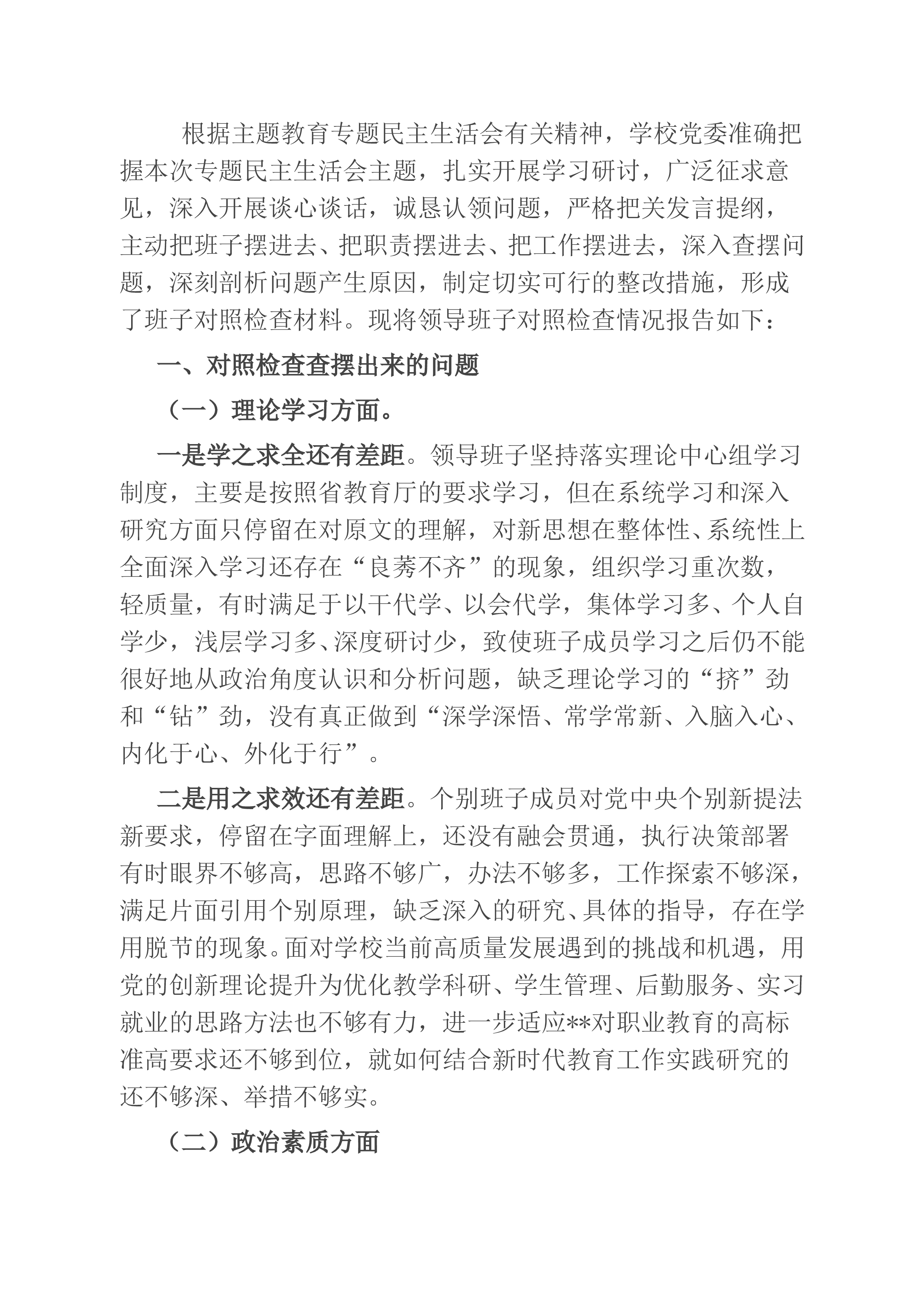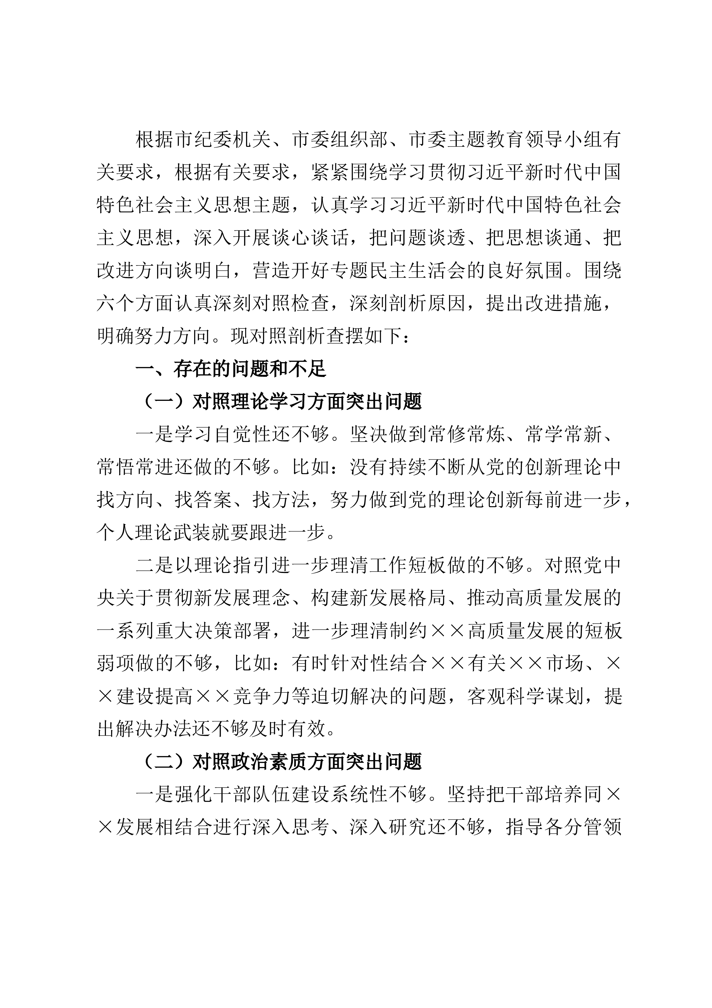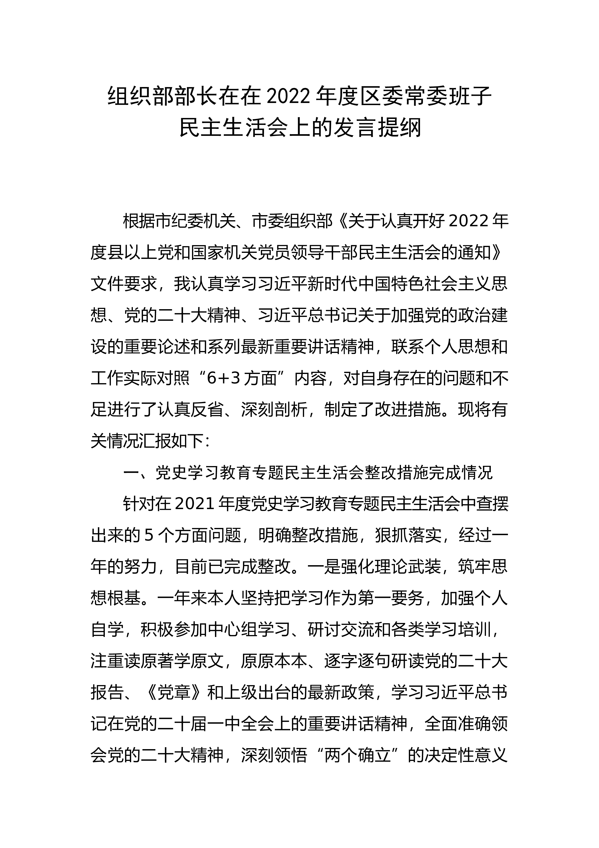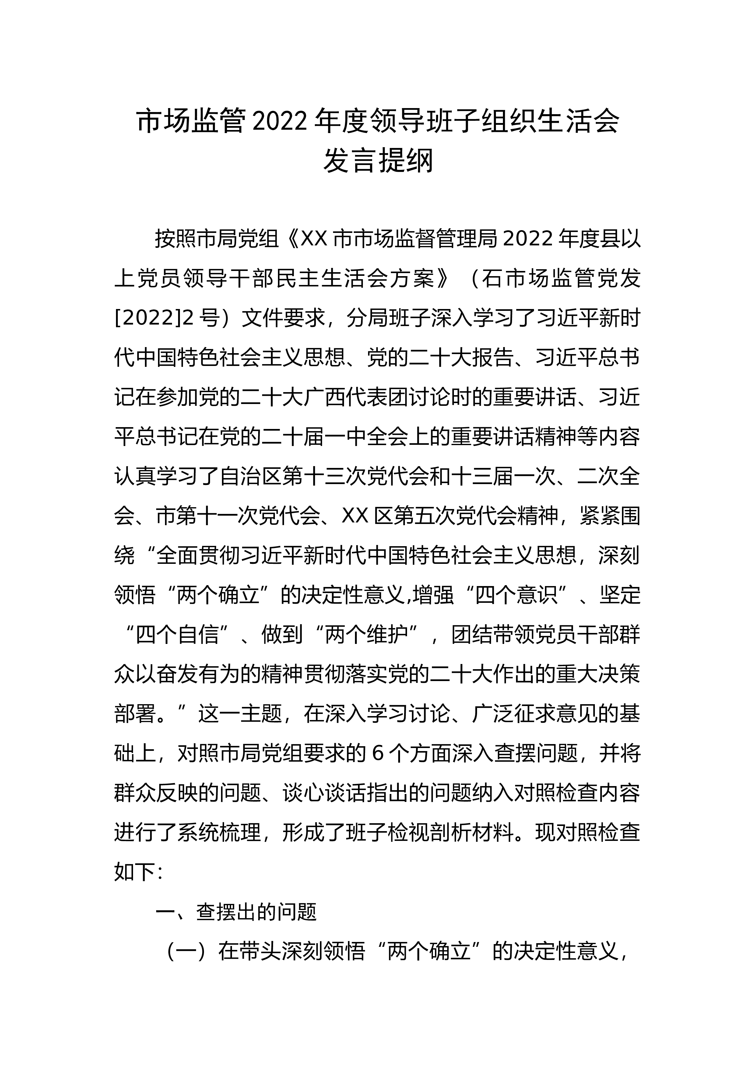 市场监管2022年度领导班子组织生活会发言提纲按照市局党组《XX市市场监督管理局2022年度县以上党员领导干部民主生活会方案》(石市场监管党发[2022]2号)文件要求,分局班子深入学习了习近平新时代中国特色社会主义思想、党的二十大报告、习近平总书记在参加党的二十大广西代表团讨论时的重要讲话、习近平总书记在党的二十届一中全会上的重要讲话精神等内容认真学习了自治区第十三次党代会和十三届一次、二次全会、市第十一次党代会、XX区第五次党代会精神,紧紧围绕“全面贯彻习近平新时代中国特色社会主义思想,深刻领悟“两个确立”的决定性意义,增强“四个意识”、坚定“四个自信”、做到“两个维护”,团结带领党员干部...