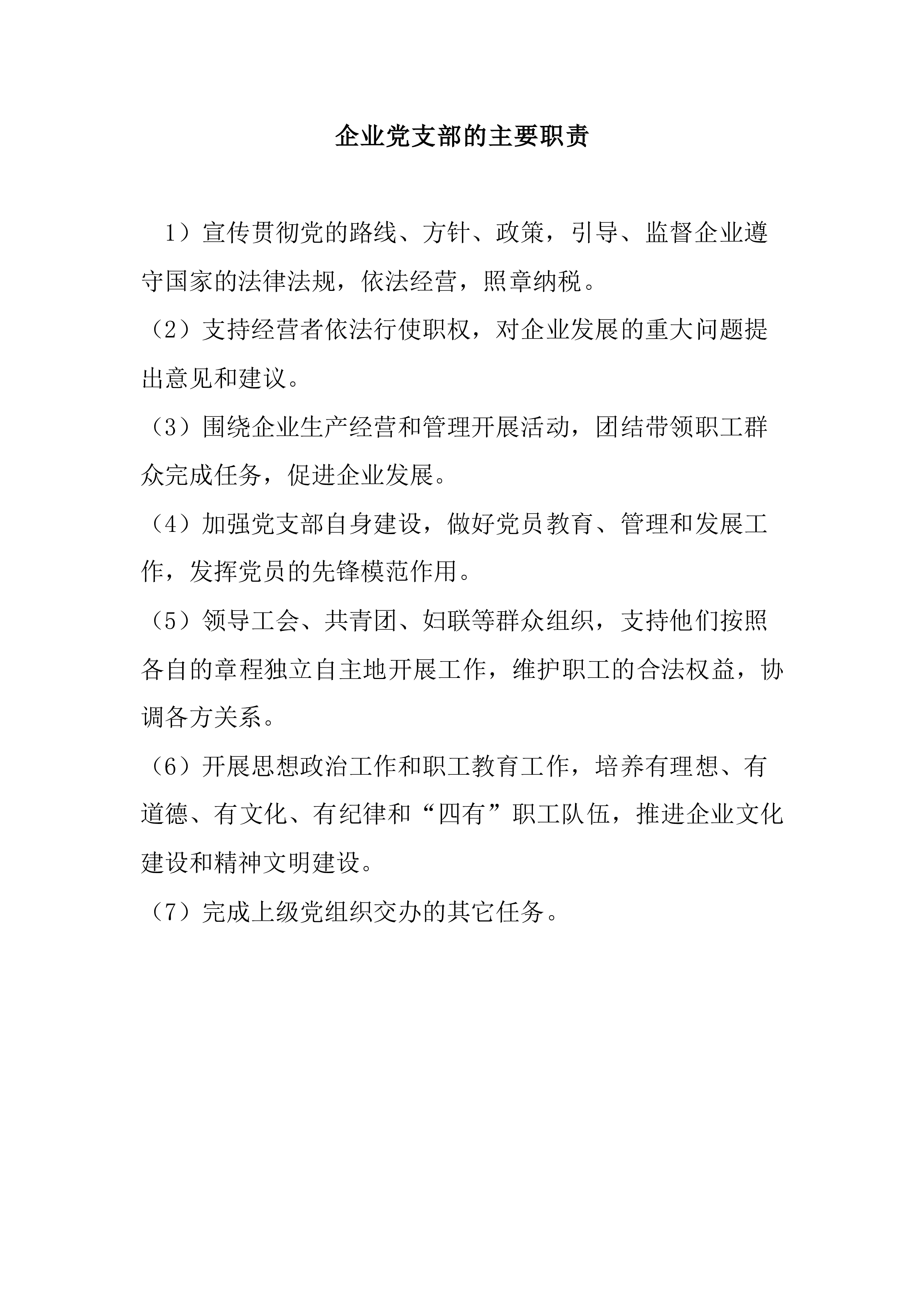 企业党支部的主要职责1)宣传贯彻党的路线、方针、政策,引导、监督企业遵守国家的法律法规,依法经营,照章纳税。(2)支持经营者依法行使职权,对企业发展的重大问题提出意见和建议。(3)围绕企业生产经营和管理开展活动,团结带领职工群众完成任务,促进企业发展。(4)加强党支部自身建设,做好党员教育、管理和发展工作,发挥党员的先锋模范作用。(5)领导工会、共青团、