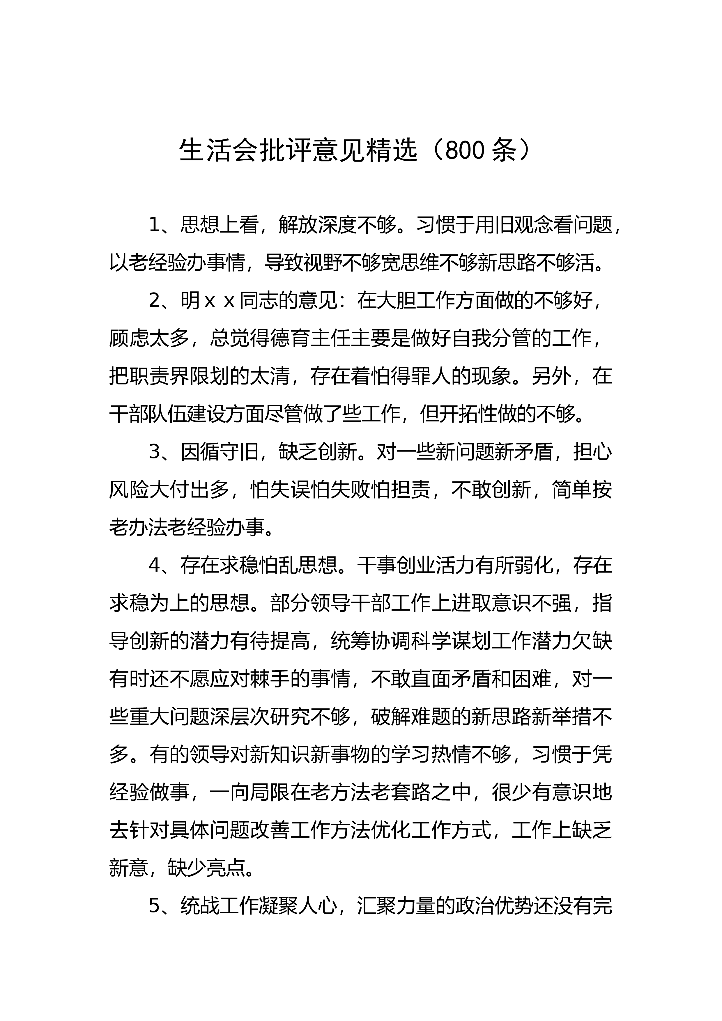 生活会批评意见精选(800条)1、思想上看,解放深度不够。习惯于用旧观念看问题,以老经验办事情,导致视野不够宽思维不够新思路不够活。2、明xx同志的意见:在大胆工作方面做的不够好,顾虑太多,总觉得德育主任主要是做好自我分管的工作,把职责界限划的太清,存在着怕得罪人的现象。另外,在干部队伍建设方面尽管做了些工作,但开拓性做的不够。3、因循守旧,缺乏创新。对一些新问题新矛盾,担心风险大付出多,怕失误怕失败怕担责,不敢创新,简单按老办法老经验办事。4、存在求稳怕乱思想。干事创业活力有所弱化,存在求稳为上的思想。部分领导干部工作上进取意识不强,指导创新的潜力有待提高,统筹协调科学谋划工作潜力欠缺有时还...