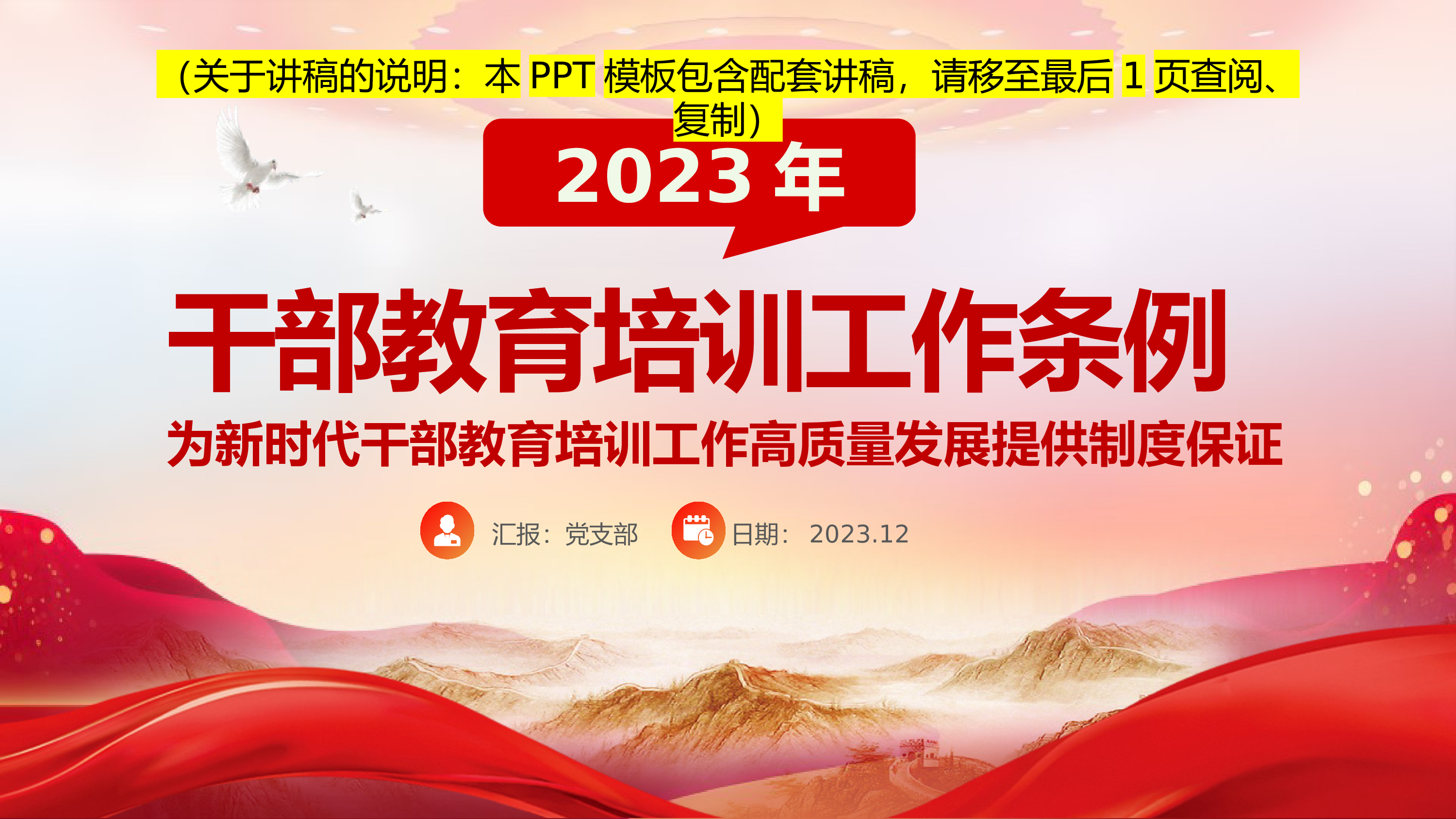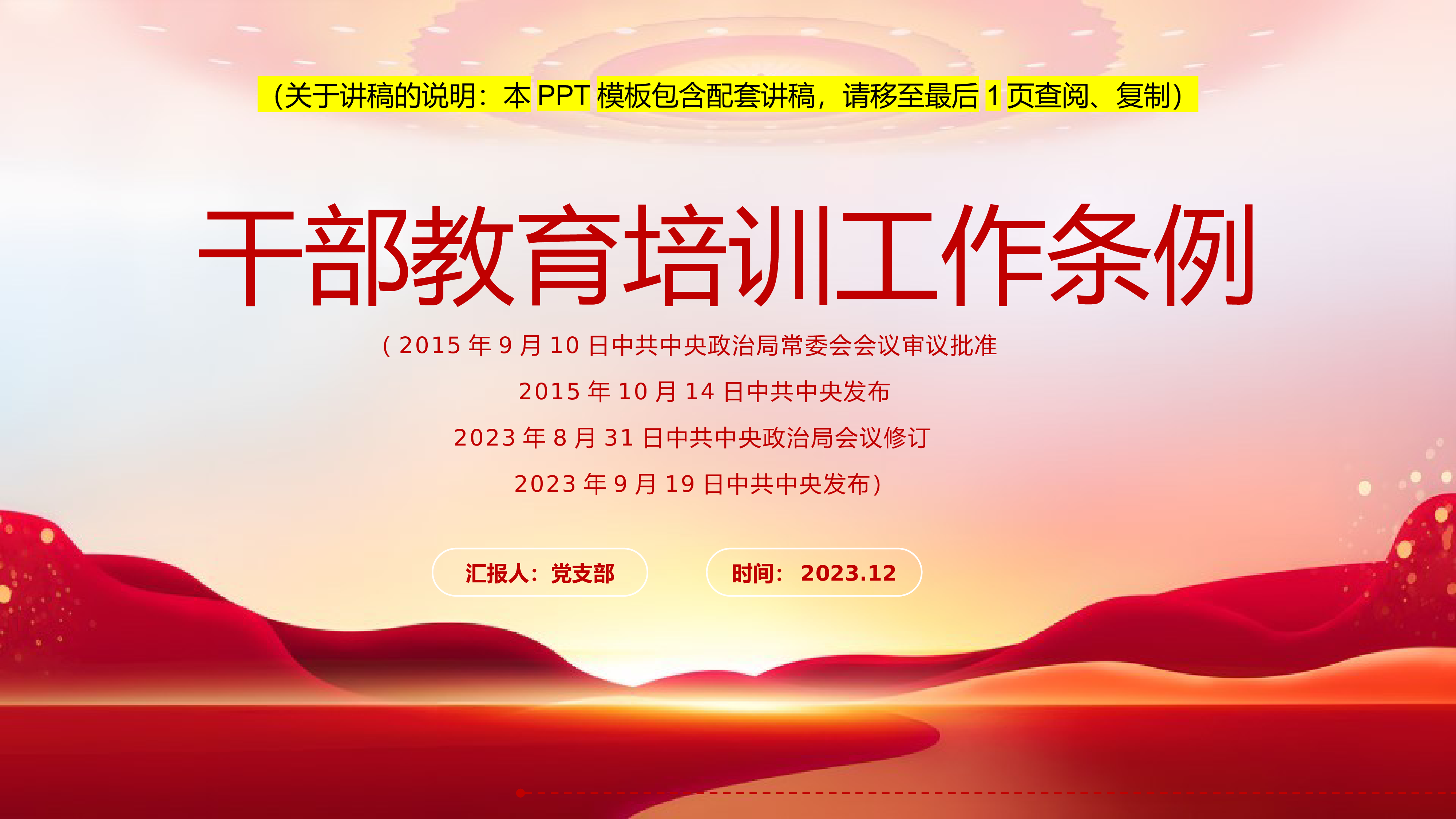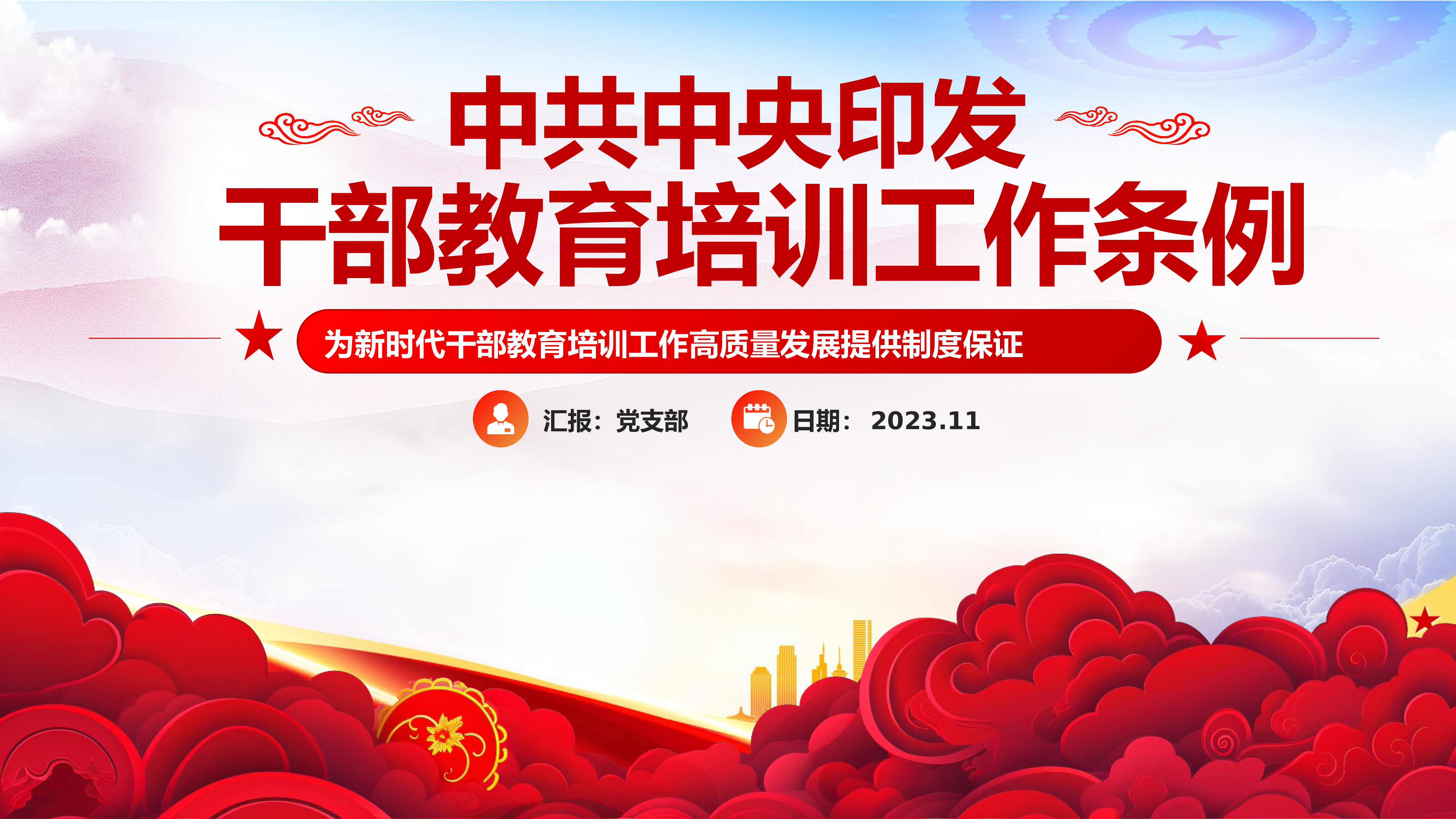 为新时代干部教育培训工作高质量发展提供制度保证干部教育培训工作条例中共中央印发汇报:党支部日期:2023.12(关于讲稿的说明:本PPT模板包含配套讲稿,请移至最后1页查阅、复制) 干部教育培训是建设高素质干部队伍的先导性、基础性、战略性工程,在推进中国特色社会主义伟大事业和党的建设新的伟大工程中具有不可替代的重要地位和作用。《条例》修订,以习近平新时代中国特色社会主义思想为指导,全面贯彻习近平总书记关于党的建设的重要思想,深入贯彻党的二十大精神,落实新时代党的建设总要求和新时代党的组织路线,总结干部教育培训实践的新经验新成果,进一步推进干部教育培训工作科学化、制度化、规范化,对于坚持不懈用习...
