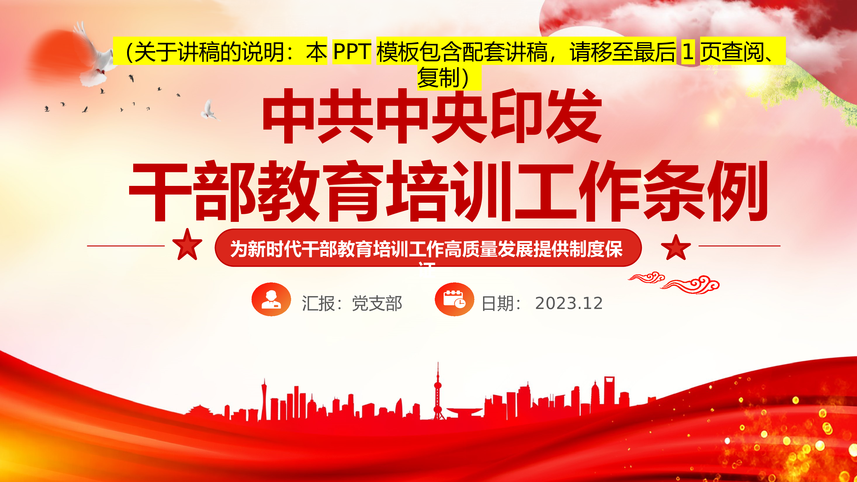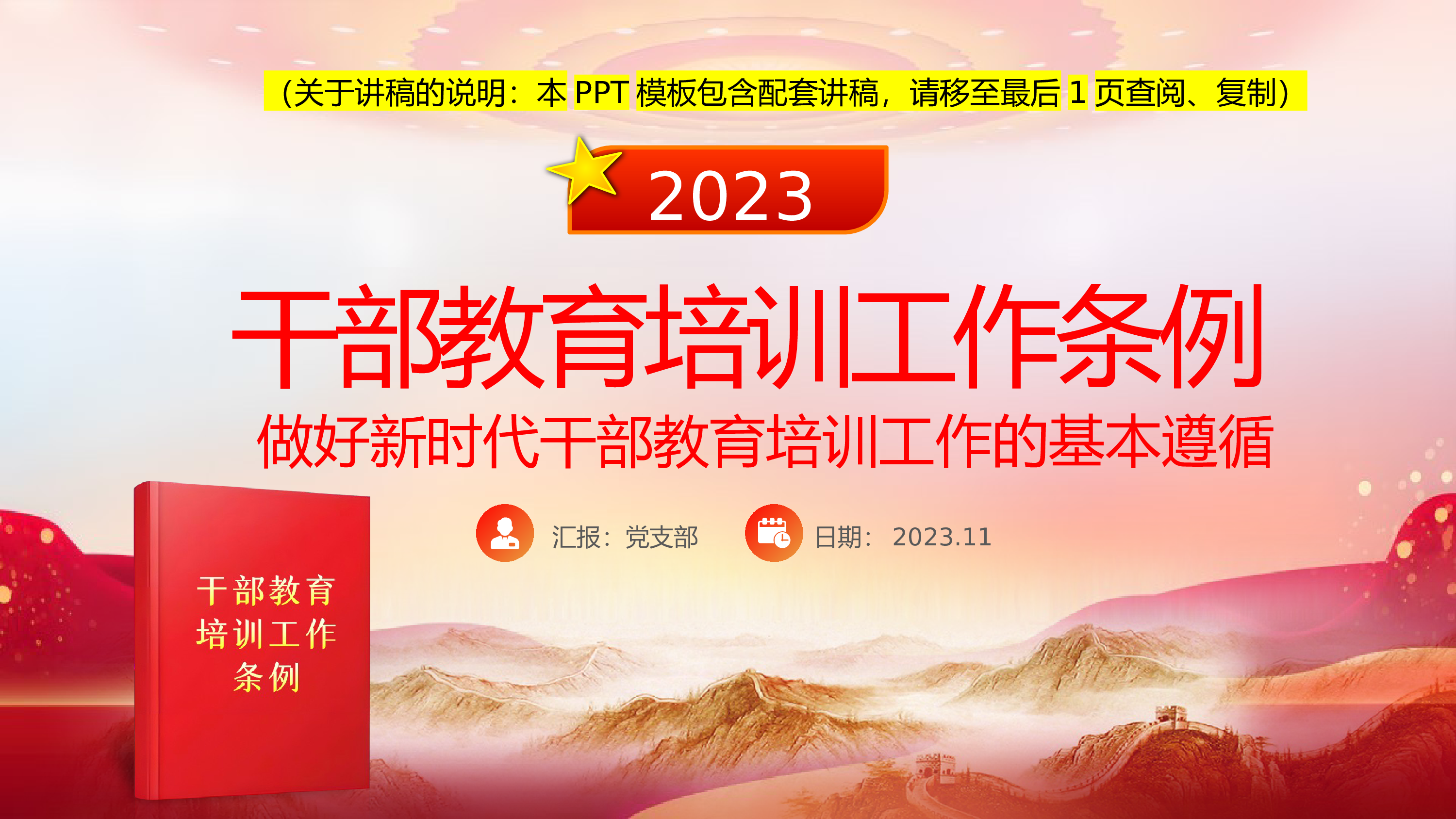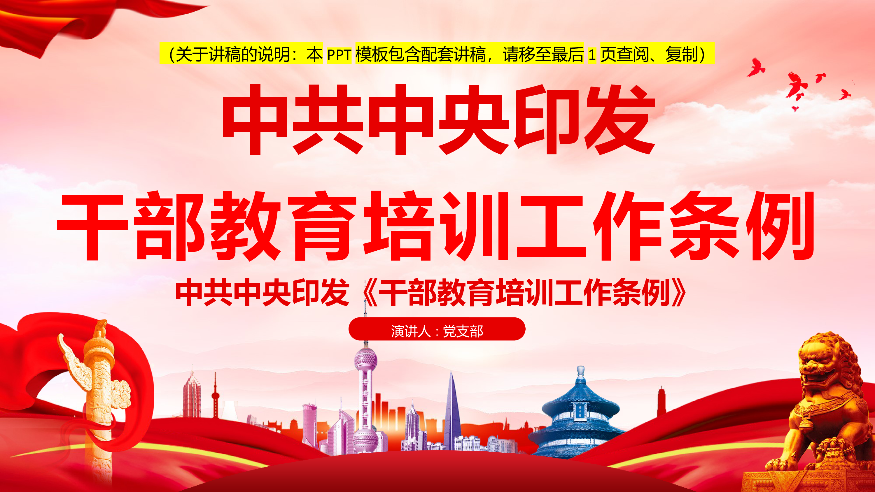 为新时代干部教育培训工作高质量发展提供制度保证干部教育培训工作条例中共中央印发汇报:党支部日期:2023.12(关于讲稿的说明:本PPT模板包含配套讲稿,请移至最后1页查阅、复制) 干部教育培训是建设高素质干部队伍的先导性、基础性、战略性工程,在推进中国特色社会主义伟大事业和党的建设新的伟大工程中具有不可替代的重要地位和作用。《条例》修订,以习近平新时代中国特色社会主义思想为指导,全面贯彻习近平总书记关于党的建设的重要思想,深入贯彻党的二十大精神,落实新时代党的建设总要求和新时代党的组织路线,总结干部教育培训实践的新经验新成果,进一步推进干部教育培训工作科学化、制度化、规范化,对于坚持不懈用习...