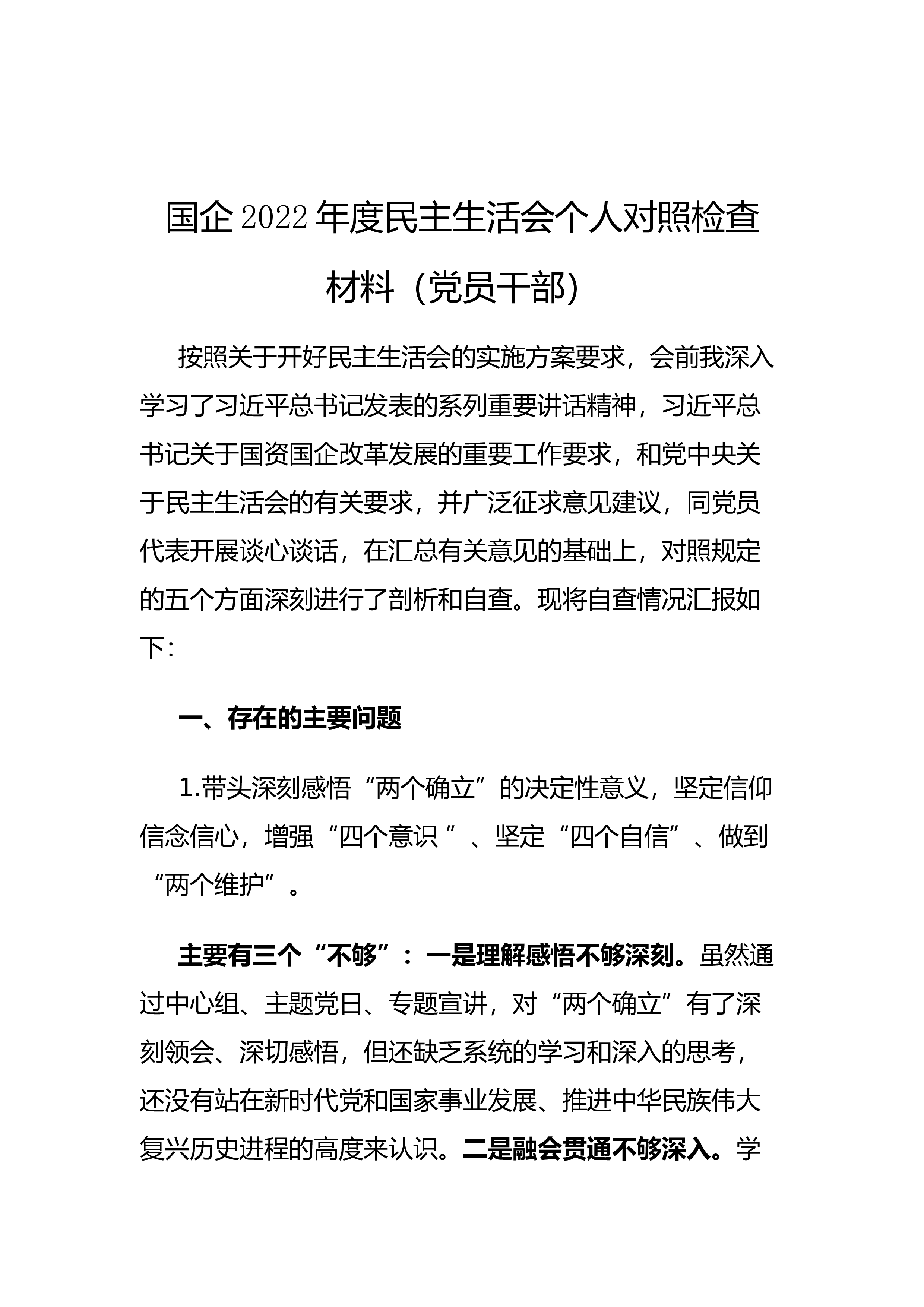 【国资国企】国企2022年度民主生活会个人对照检查材料(党员干部)