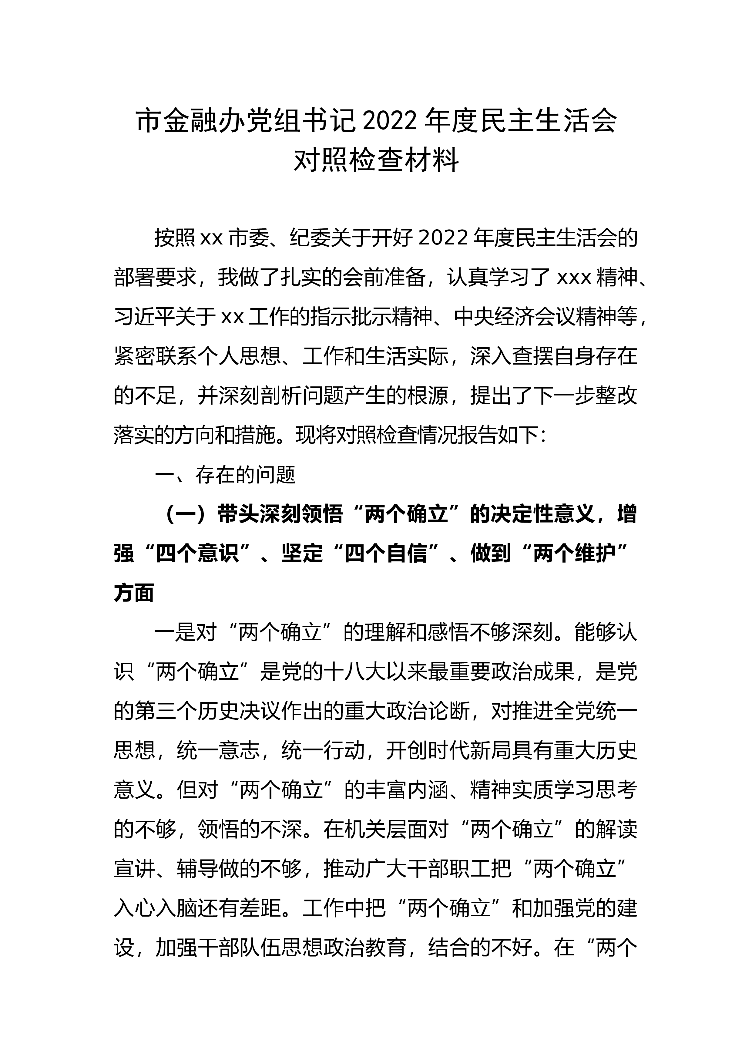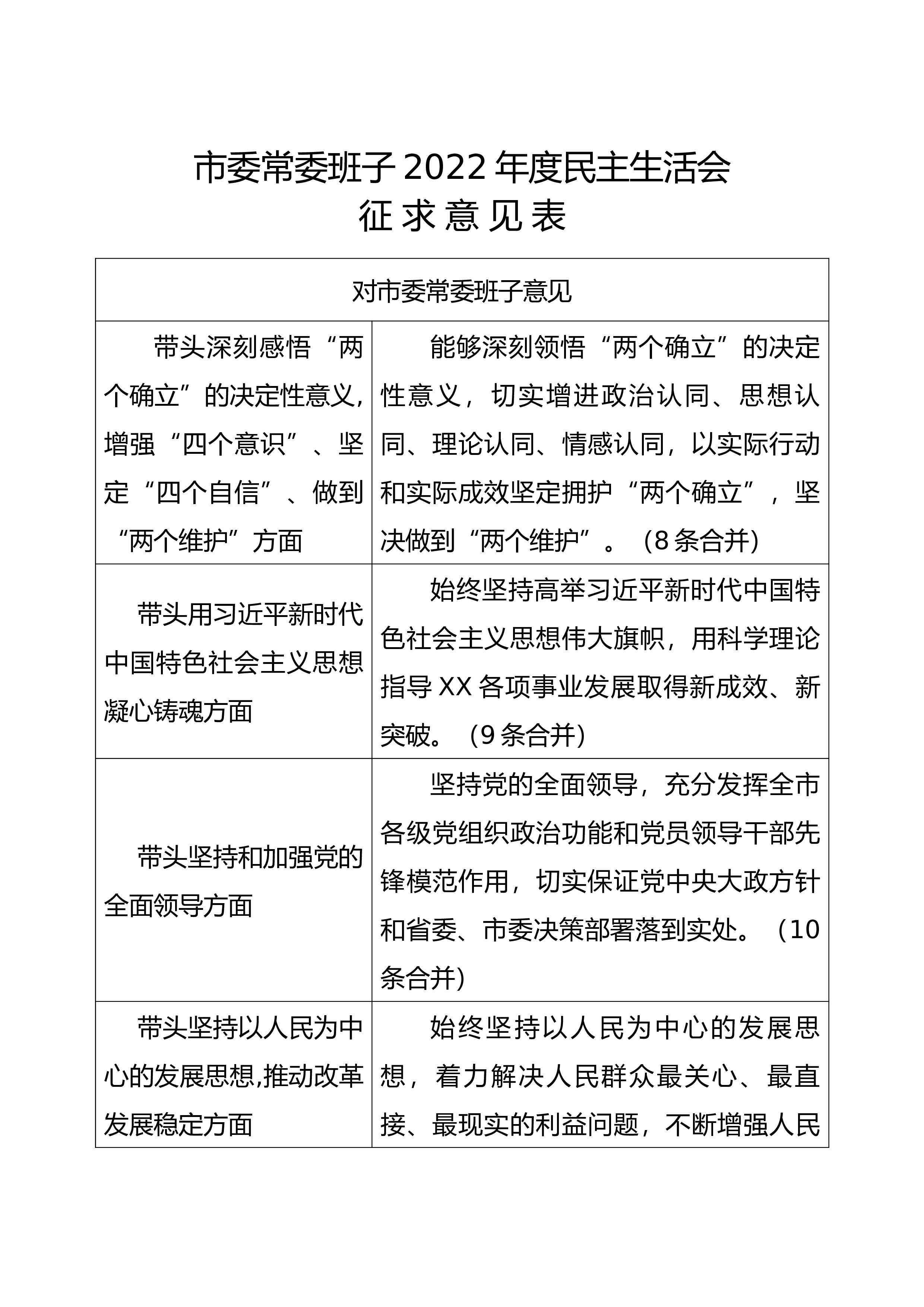 市委常委班子2022年度民主生活会征求意见表对市委常委班子意见带头深刻感悟“两个确立”的决定性意义,增强“四个意识”、坚定“四个自信”、做到“两个维护”方面能够深刻领悟“两个确立”的决定性意义,切实增进政治认同、思想认同、理论认同、情感认同,以实际行动和实际成效坚定拥护“两个确立”,坚决做到“两个维护”。(8条合并)带头用习近平新时代中国特色社会主义思想凝心铸魂方面始终坚持高举习近平新时代中国特色社会主义思想伟大旗帜,用科学理论指导XX各项事业发展取得新成效、新突破。(9条合并)带头坚持和加强党的全面领导方面坚持党的全面领导,充分发挥全市各级党组织政治功能和党员领导干部先锋模范作用,切实保证党...