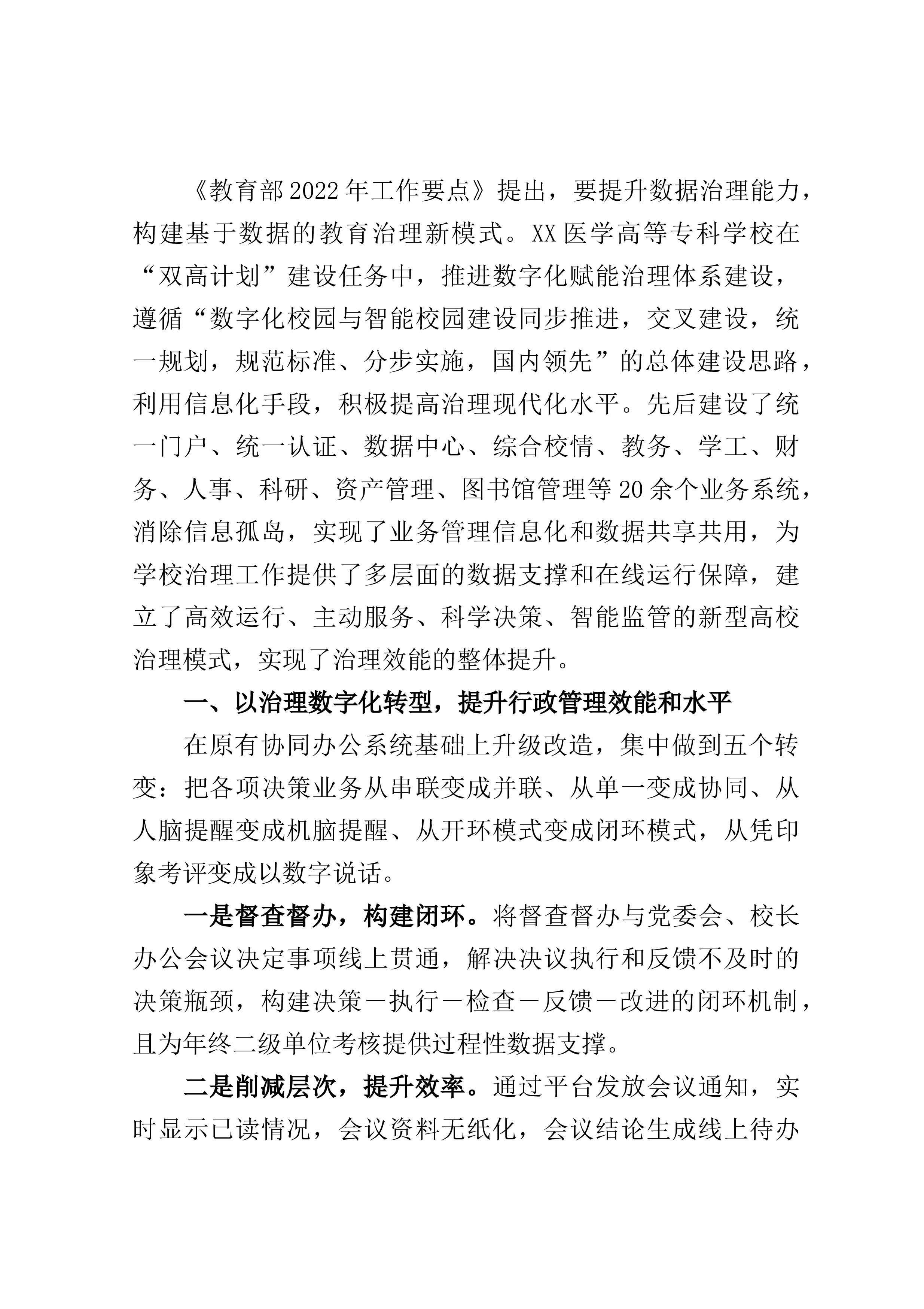 《教育部2022年工作要点》提出,要提升数据治理能力,构建基于数据的教育治理新模式。XX医学高等专科学校在“双高计划”建设任务中,推进数字化赋能治理体系建设,遵循“数字化校园与智能校园建设同步推进,交叉建设,统一规划,规范标准、分步实施,国内领先”的总体建设思路,利用信息化手段,积极提高治理现代化水平。先后建设了统一门户、统一认证、数据中心、综合校情、教务、学工、财务、人事、科研、资产管理、图书馆管理等20余个业务系统,消除信息孤岛,实现了业务管理信息化和数据共享共用,为学校治理工作提供了多层面的数据支撑和在线运行保障,建立了高效运行、主动服务、科学决策、智能监管的新型
