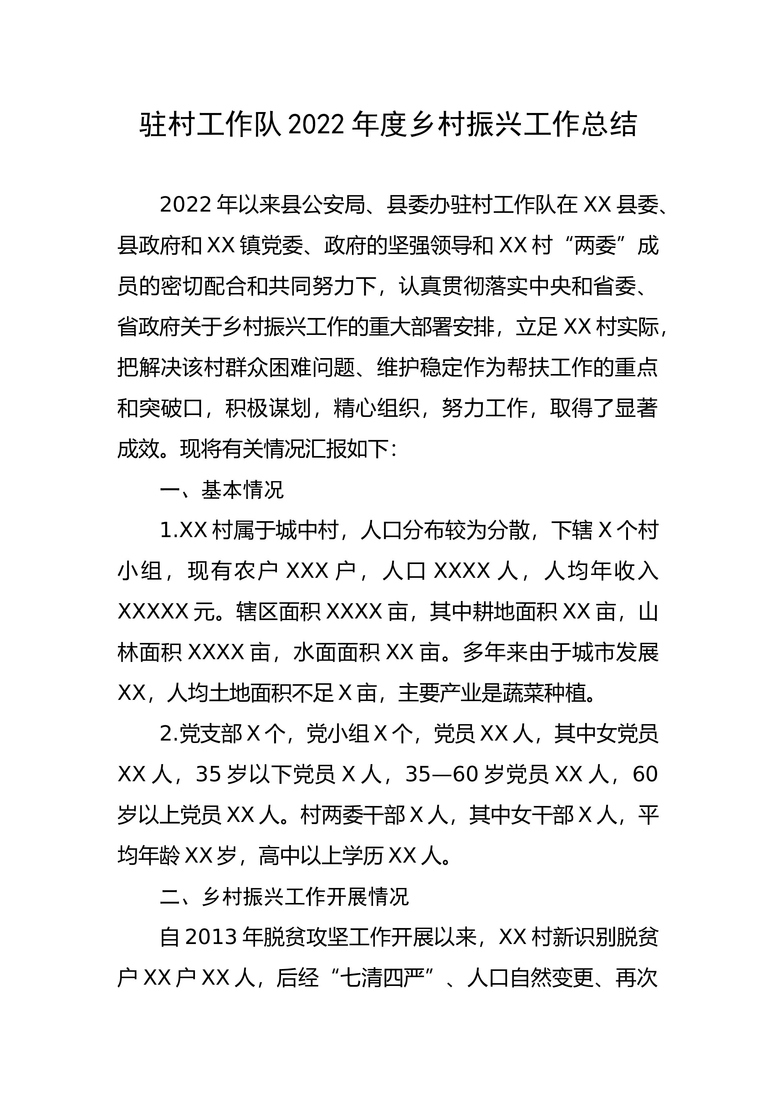 局、县委办驻村工作队在XX县委、县政府和XX镇党委、政府的坚强领导和XX村“两委”成员的密切配合和共同努力下,认真贯彻落实中央和省委、省政府关于乡村振兴工作的重大部署安排,立足XX村实际,把解决该村群众困难问题、维护稳定作为帮扶工作的重点和突破口,积极谋划,精心组织,努力工作,取得了显著成效。现将有关情况汇报如下:一、基本情况1.XX村属于城中村,人口分布较为分散,下辖X个村小组,现有农户XXX户,人口XXXX人,人均年收入XXXXX元。辖区面积XXXX亩,其中耕地面积XX亩,山林面积XXXX亩,水面面积XX亩。多年来由于城市发展XX,...