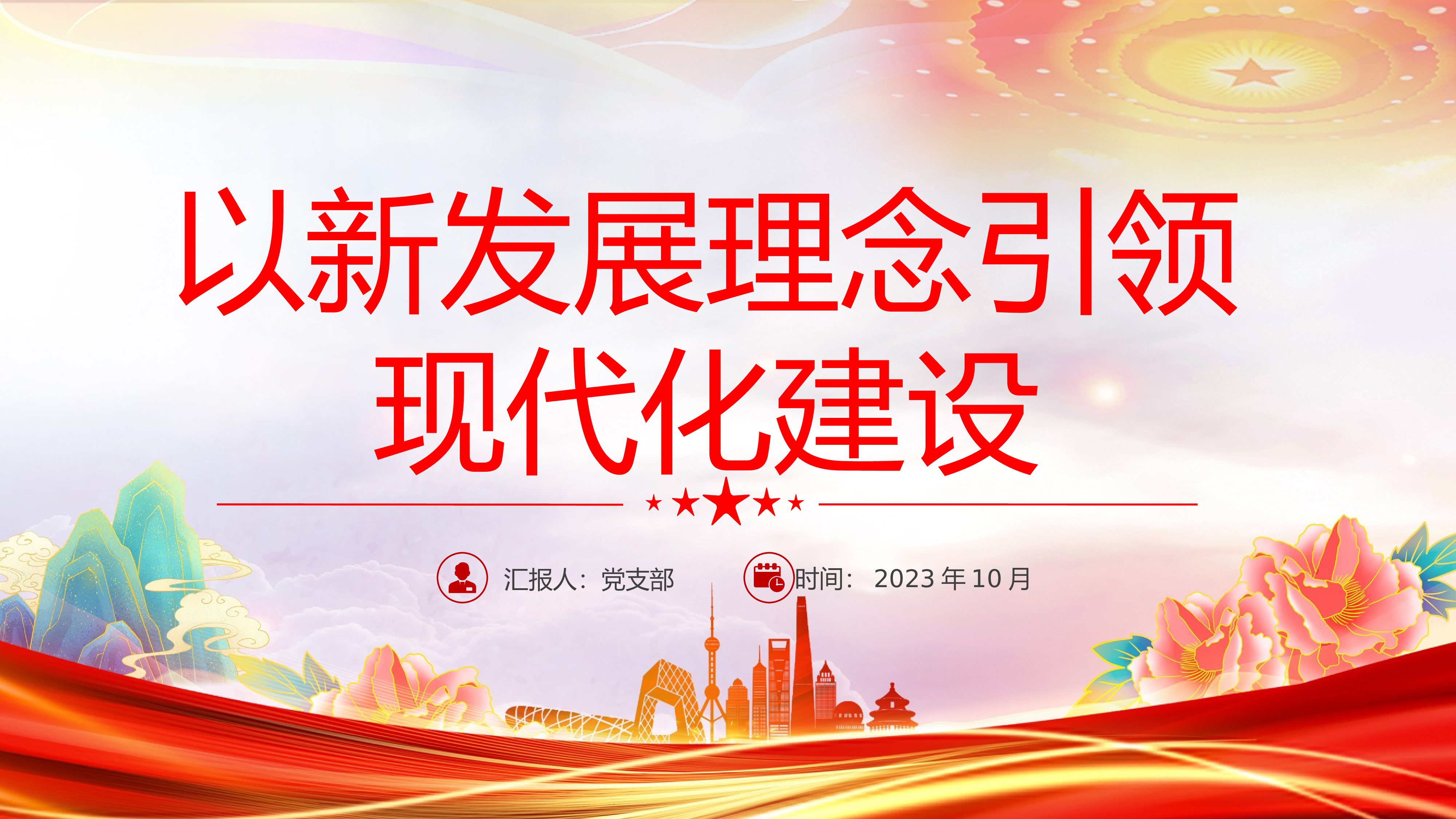 汇报人:党支部时间:2023年10月以新发展理念引领现代化建设0前0言发展是人类社会的永恒主题。党的十八大以来,以领导人同志为核心的党中央面对经济社会发展新趋势新机遇和新矛盾新挑战,鲜明提出了创新、协调、绿色、开放、共享的新发展理念。新发展理念明确了我国现代化建设的指导原则。中国式现代化是人口规模巨大的现代化,是全体人民共同富裕的现代化,是物质文明和精神文明相协调的现代化,是人与自然和谐共生的现代化,是走和平发展道路的现代化。新发展理念的提出,回答了处在新的历史方位的中国“实现什么样的发展、怎样实现发展”的重大理论和实践问题,为以中国式现代化全面推进中华民族伟大复兴提供了科学指引。我们要以新发...