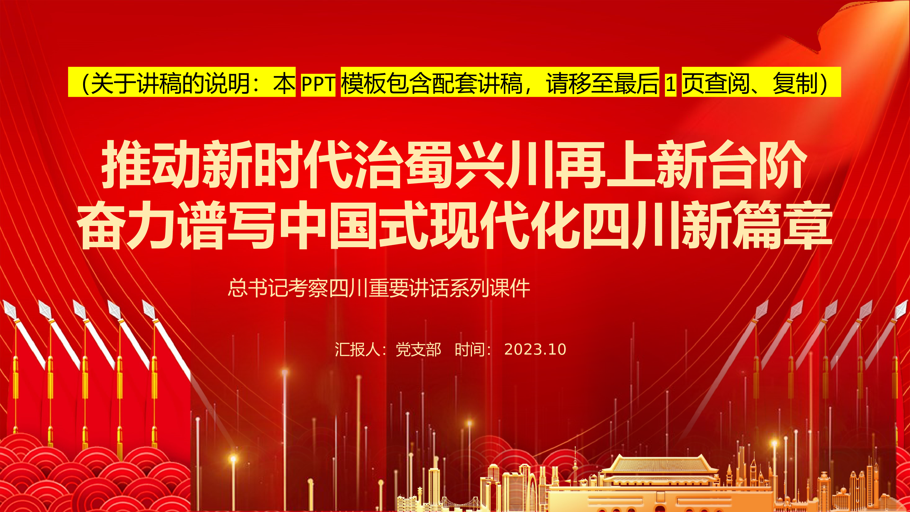 总书记考察四川重要讲话系列课件汇报人:党支部时间:2023.10推动新时代治蜀兴川再上新台阶奋力谱写中国式现代化四川新篇章(关于讲稿的说明:本PPT模板包含配套讲稿,请移至最后1页查阅、复制)前言7月25日至27日,中共中央总书记、国家主席、中央军委主席习近平在四川考察。全面学习贯彻党的二十大精神,要牢牢把握新时代新征程党的中心任务,牢牢把握中国式现代化的科学内涵和本质要求,牢牢把握高质量发展这个首要任务,把贯彻新发展理念、构建新发展格局、促进