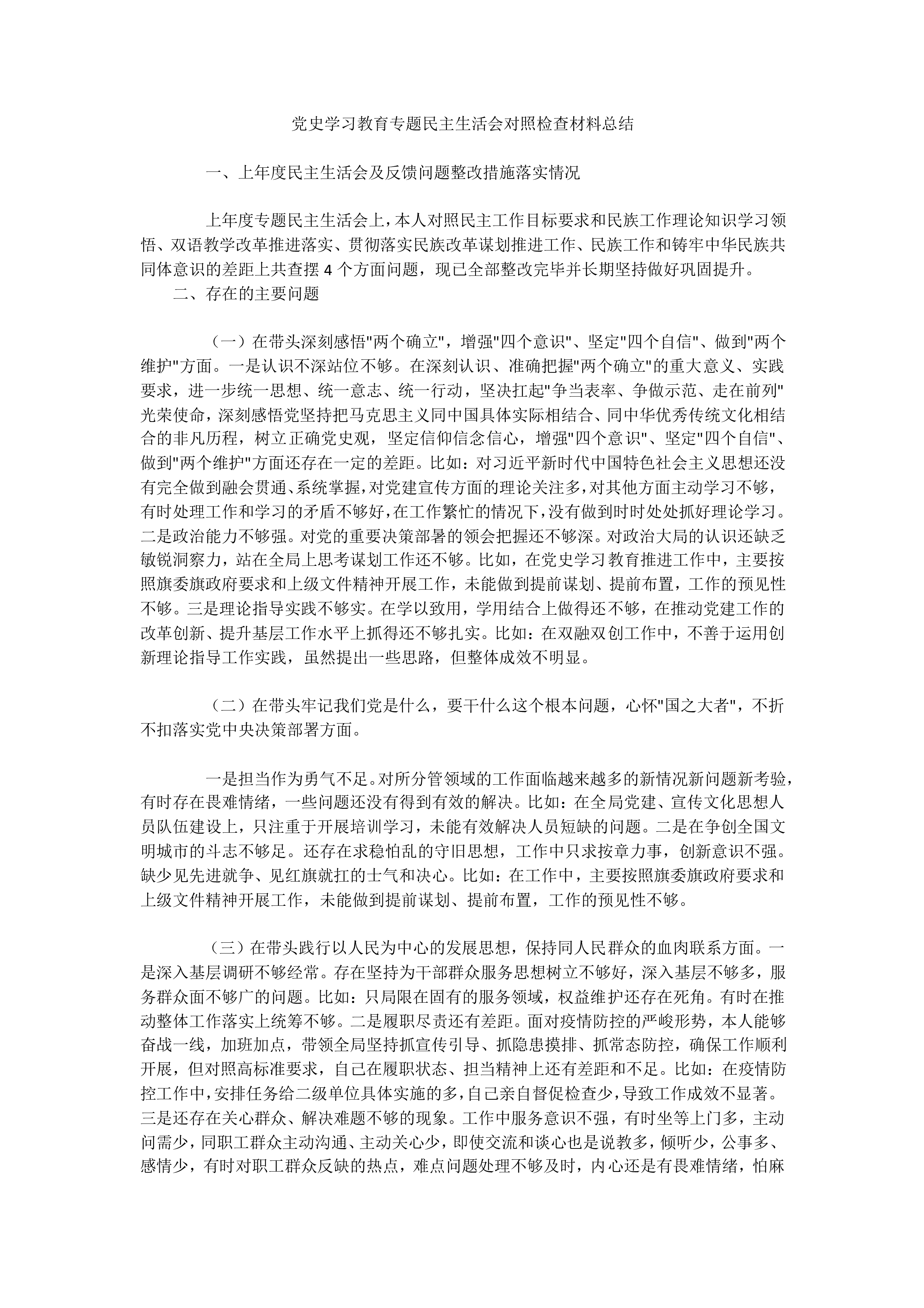 党史学习教育专题民主生活会对照检查材料总结一、上年度民主生活会及反馈问题整改措施落实情况上年度专题民主生活会上,本人对照民主工作目标要求和民族工作理论知识学习领悟、双语教学改革推进落实、贯彻落实民族改革谋划推进工作、民族工作和铸牢中华民族