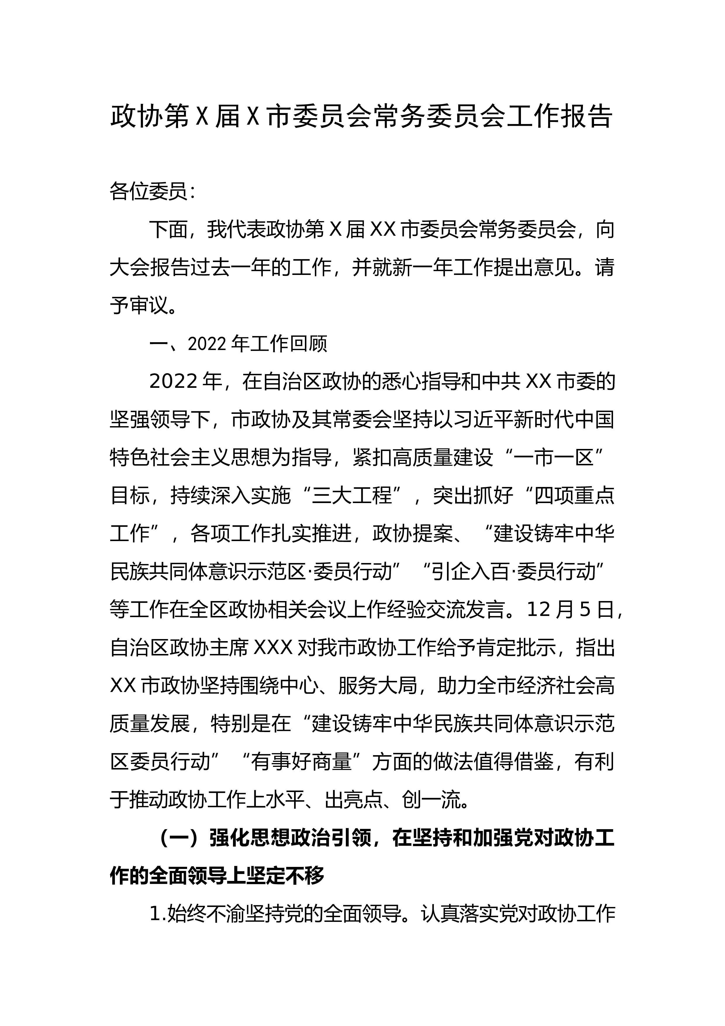 政协第X届X市委员会常务委员会工作报告各位委员:下面,我代表政协第X届XX市委员会常务委员会,向大会报告过去一年的工作,并就新一年工作提出意见。请予审议。一、2022年工作回顾2022年,在自治区政协的悉心指导和中共XX市委的坚强领导下,市政协及其常委会坚持以习近平新时代中国特色社会主义思想为指导,紧扣高质量建设“一市一区”目标,持续深入实施“三大工程”,突出抓好“四项重点工作”,各项工作扎实推进,政协提案、“建设铸牢中华民族