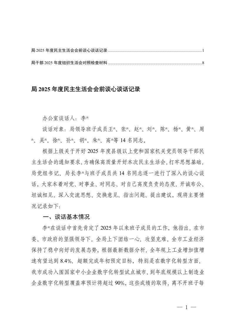 2025年度民主生活会会前谈心谈话记录局干部围绕思想