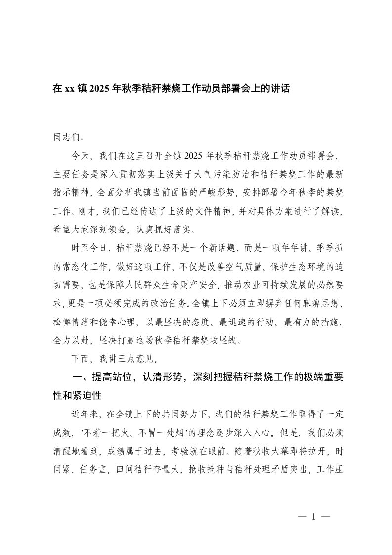,讲话2篇在乡镇2025年秋季秸秆禁烧